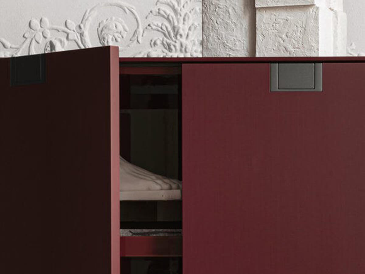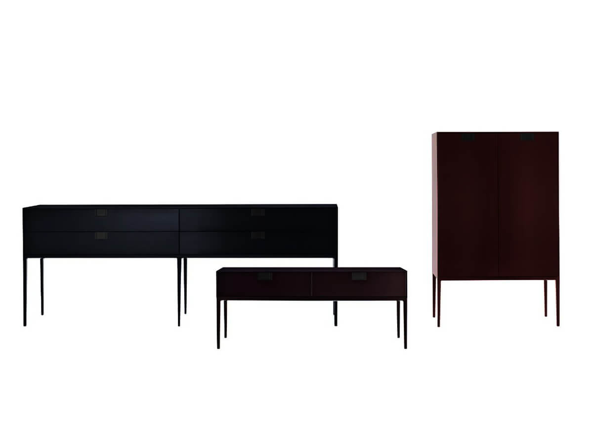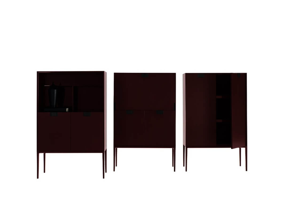 A sideboard with a rigorous and strongly geometric design, capable of enriching luxurious spaces with its rigor, careful to preserve a beauty free of smudges and frills. Alcor is a sideboard designed by Antonio Citterio for Maxalto and belongs to the family of sideboards and consoles of the Lux collection. Here it is possible to admire highly rigorous shapes combined with precious surfaces in lacquered and varnished with shellac with a wood effect. The precious physiognomy of Alcor makes it a perfect complement for studies, offices, classy living rooms and crossing spaces where you feel the need to add an element of rigor. Technical features: classic version internal structure in glossy red with bronzed nickel painted handles; damier version with fronts with an inlaid checkerboard decoration
