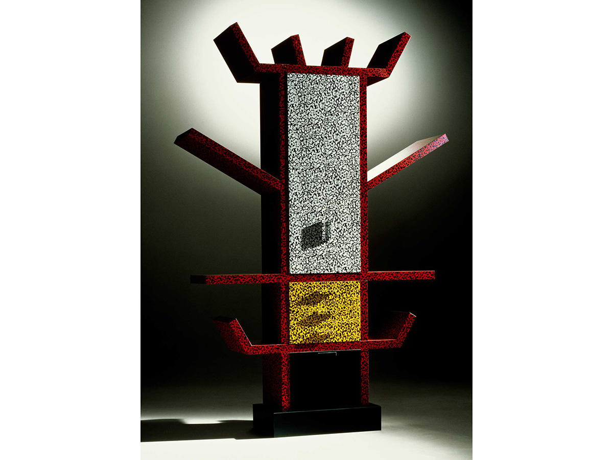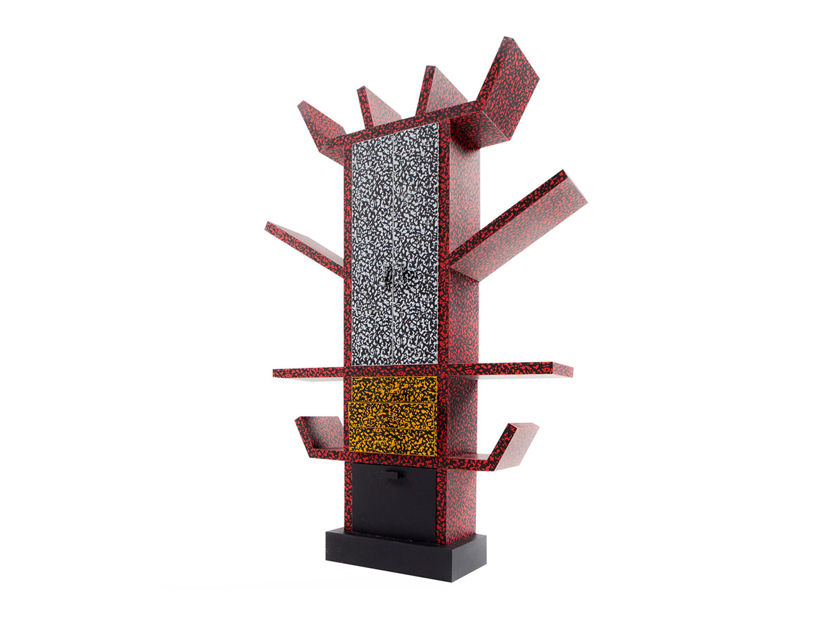 Great icon of Radical Design whose the Memphis group was the privileged interpreter, the Casablanca storage unit by Ettore Sottsass is a familiar image for every true design enthusiast. Displayed in some of the best museums in the sector, it exemplifies the aesthetics of an era in its forms. Presented in 1981 on the occasion of the first Memphis collective exhibition at the Arc 74 gallery in Milan, the Casablanca furniture abandons all functionalism to present itself as a real sculpture, a colorful totem full of ancestral and even vaguely disturbing suggestions. Entirely covered in plastic laminate, it has on its entire surface the characteristic "sponged" motif that Sottsass had designed for Abet Laminati a few years earlier and which became for him a sort of signature. The structure of the Carlton piece of furniture is based on a large central core which functions as a container, organized through doors and drawers, around which various shelves radiate, some straight and others inclined (the latter designed to house bottles of wine).