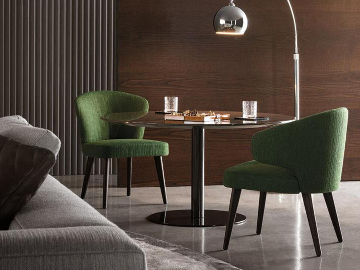 Aston is a line of upholstered furniture with a clear and absolutely characterizing retro inspiration. It is divided into numerous proposals for sofas, day beds, armchairs, footrests, stools and chairs designed both for private spaces and for hospitality, in a dialectical relationship between indoor and outdoor. The Aston chair has enveloping shapes, capable of expressing elegance and at the same time the maximum expression of comfort. The soft padded structure rests on the solid wood legs creating an extremely suggestive duo. Perfect for the dining area, Aston can be placed in any other room of the house according to taste and needs.