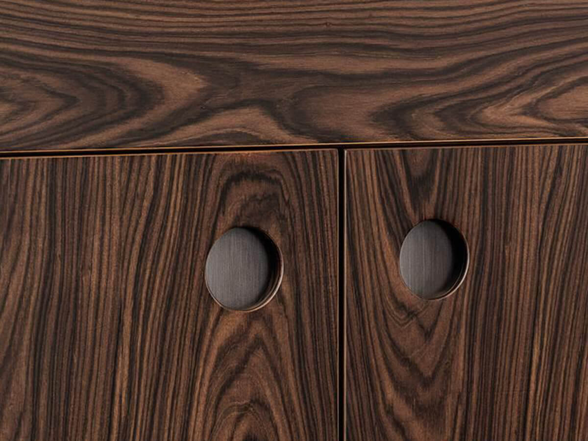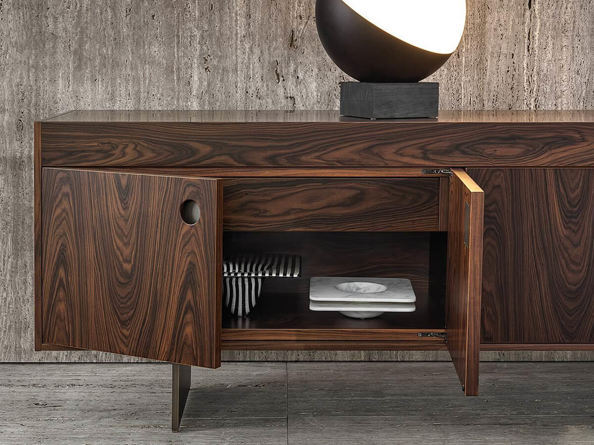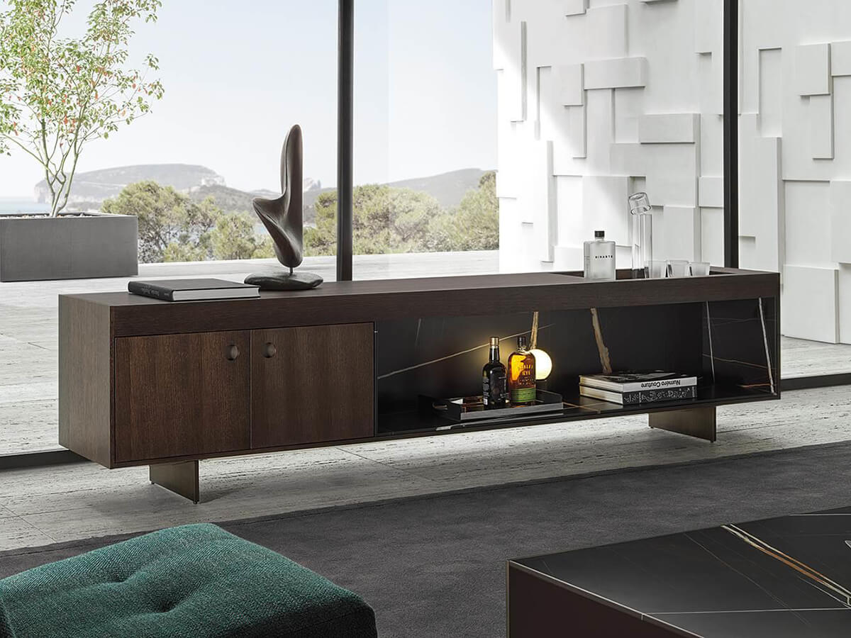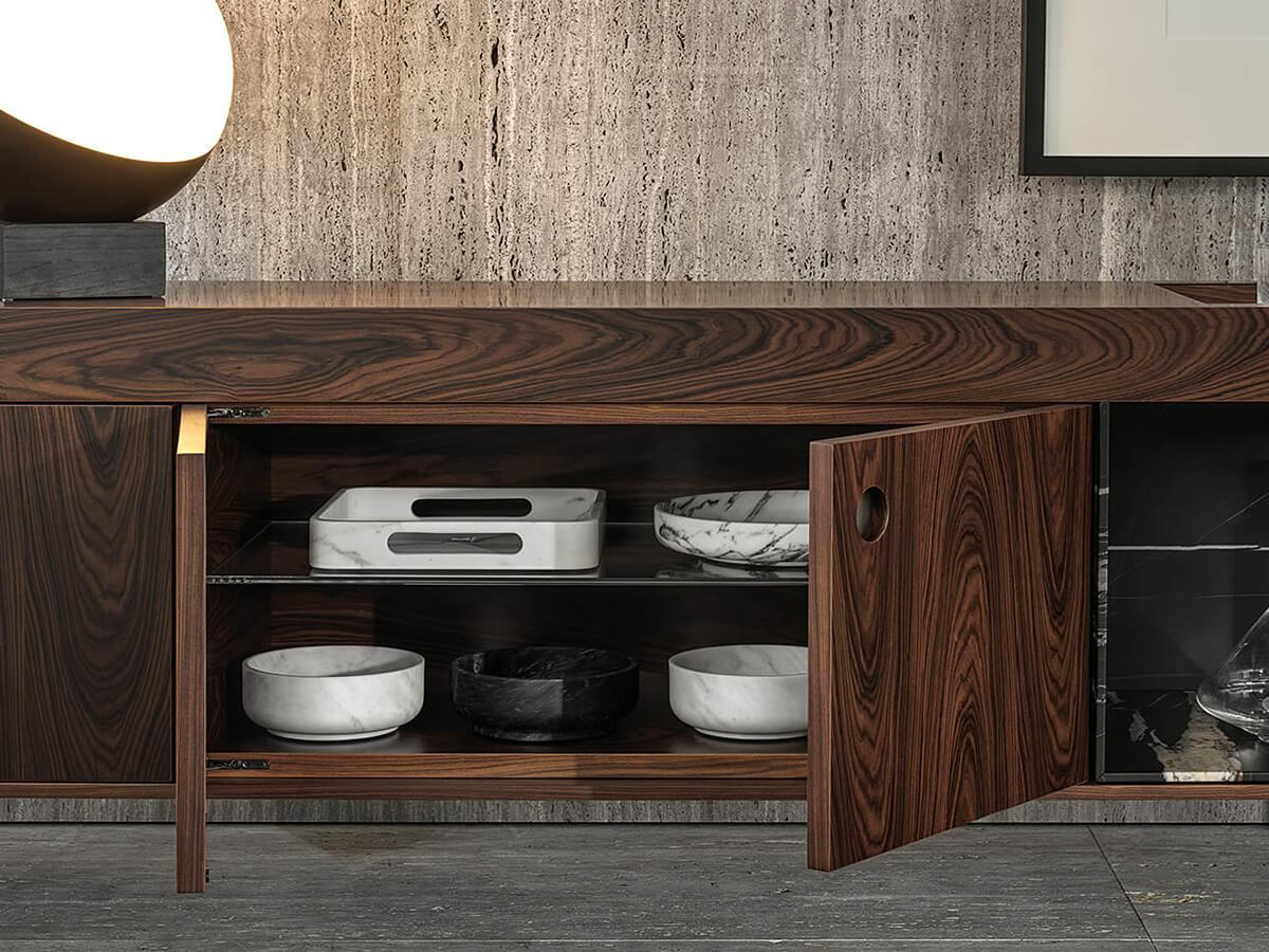 The Boteco collection of coffee tables and containers expresses a design with a strong personality combined with the mastery of associating different materials in organic structures, modeled to enhance each component to its maximum visual expression. The Boteco sideboard combines a solid top with a recess where it is possible to admire the Sahara Noir marble with an underlying compartment covered in the same essence. The resulting impression is of extreme unity and coherence, ideal for luxury living spaces with a strong conceptual connotation. The structure rests and is lightened by the painted aluminum blades. Boteco's play of stratifications, subtractions and additions defines a unique piece of furniture of its kind.
