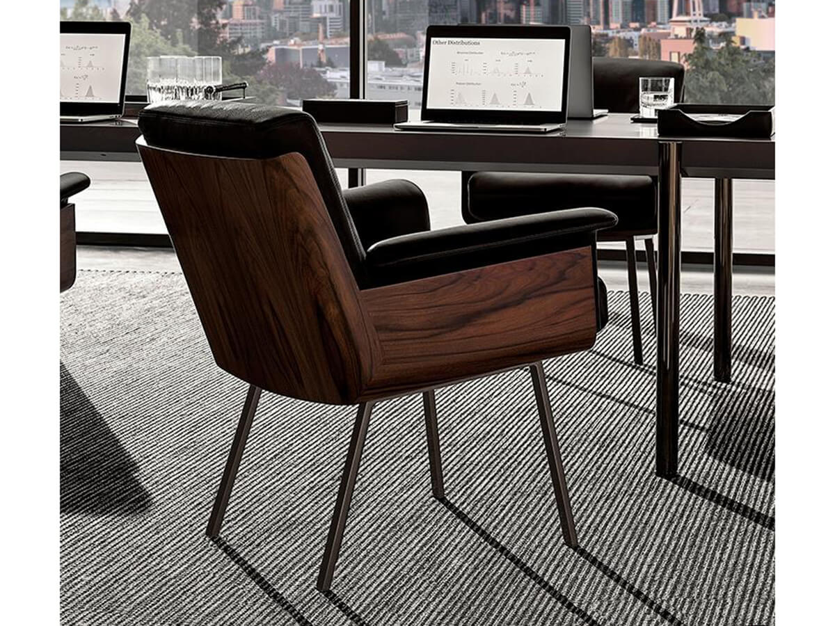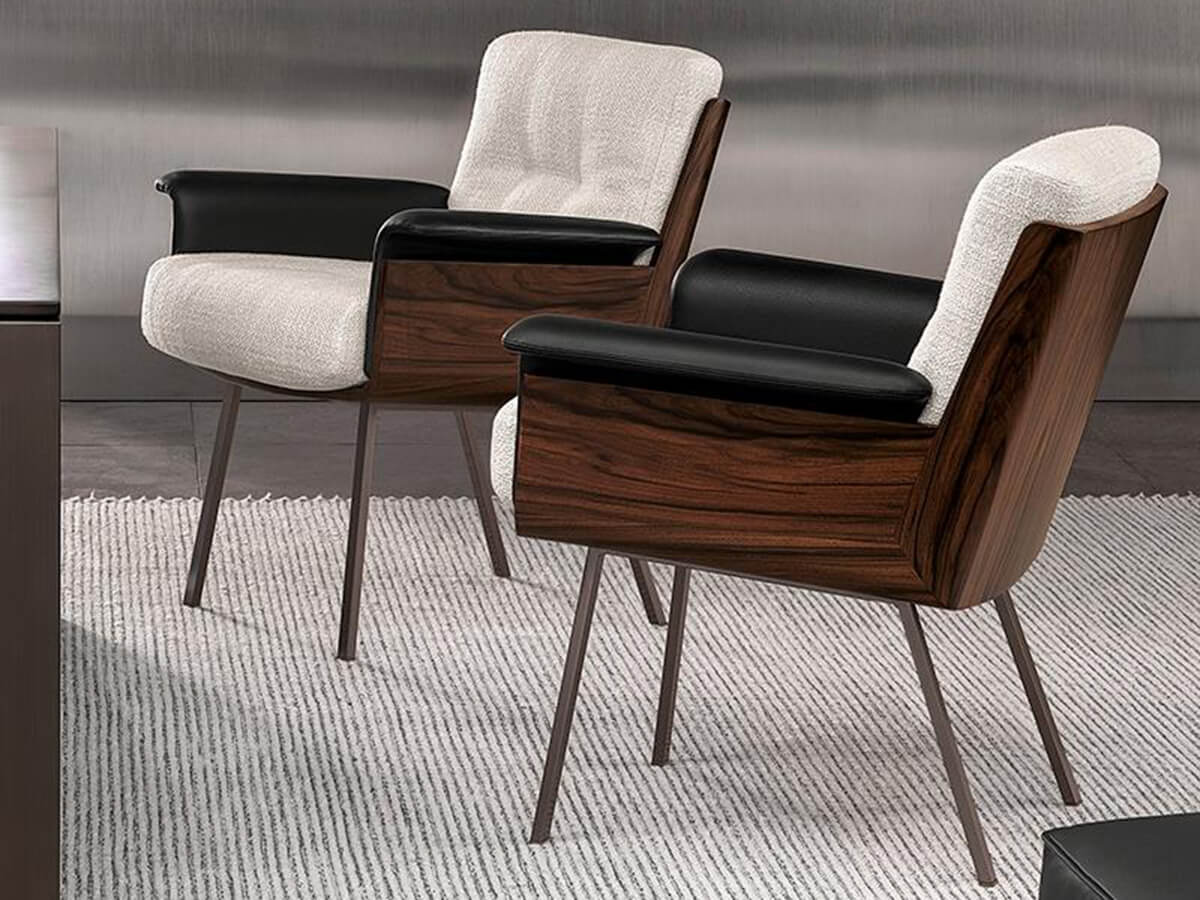 Conceived specifically for the office, the Daiki Studio version of the famous armchair designed by Marcio Kogan for Minotti, is proposed in five different types depending on the height of the backrest or seat and on the presence of aluminum wheels or legs. Designed for different uses, these versions are united by an elegant curved wooden body of rosewood or flamed ash, composed of two elements joined at 45 ° that guarantee great sitting comfort. Daiki Studio is available completely in fabric or in leather or in the version with armrests in Aspen leather and fabric cushions. The clean and dry lines as well as the materials quality make this armchair suitable for formal environments both private and public.