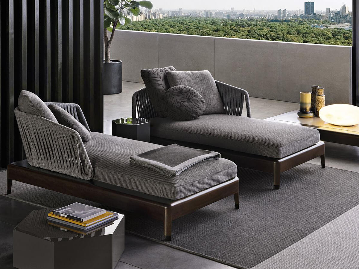 The Indiana family was born as a seating system for the outdoors characterized by warm colors and enveloping shapes, capable of suggesting a way of living the outdoors that is more relaxing and attentive to comfort. The choice made by Minotti to use solid iroko for the entire structure is not accidental, given the extreme ductility of this material combined with resistance to atmospheric agents. In its chaise longue version, Indiana stands out for its elegance and comfort, as well as the natural charm of the shapes that have always characterized every Minotti product. The backrest and armrests are made with a polypropylene ribbon and macro weave with an extremely contemporary and essential taste. An ideal element to complete the company's outdoor proposal.