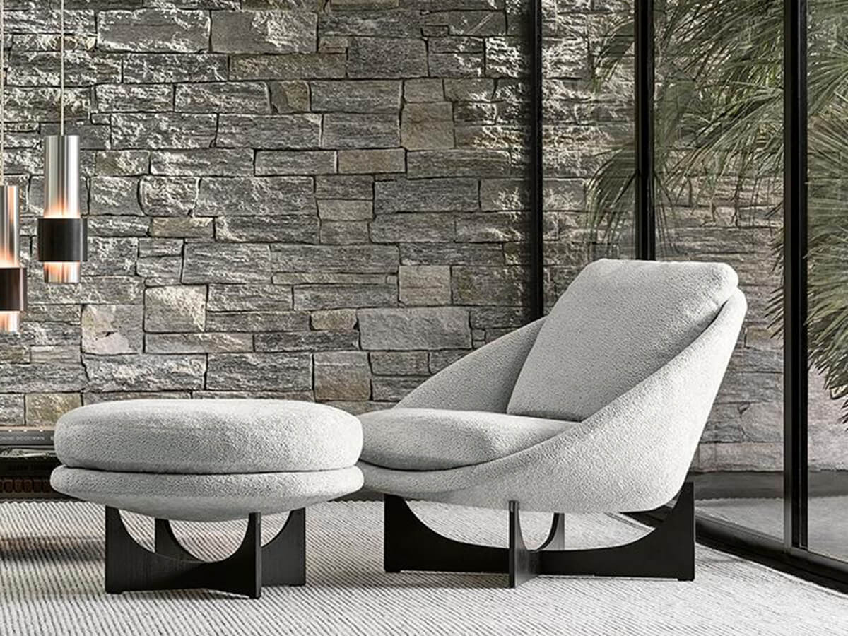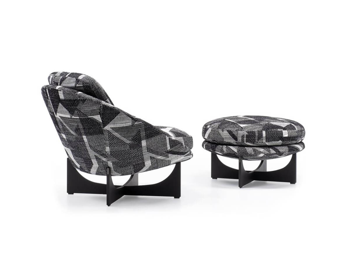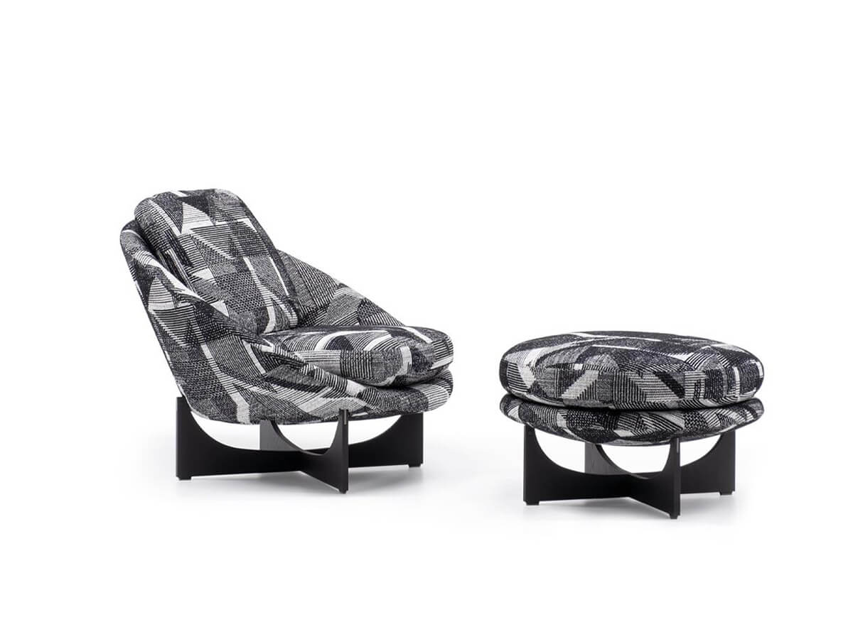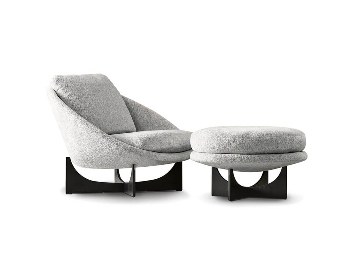 A 1950s reinterpretation with a contemporary flavor for the Lido armchair, designed by GamFratesi for Minotti. The round seat, with a continuous and enveloping curved line defines the padded shell, made more comfortable by the presence of cushions. Lido is available with either a sculptural "X" base, in aluminum covered in brushed ash lacquered in moka color, both with legs in wood with a choice of brushed ash lacquered in moka color or dark stained canaletto walnut brown and matt polyester lacquer. The Lido armchair is also equipped with a footrest and can be covered in completely removable fabrics or leathers.