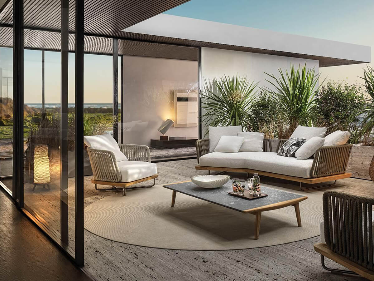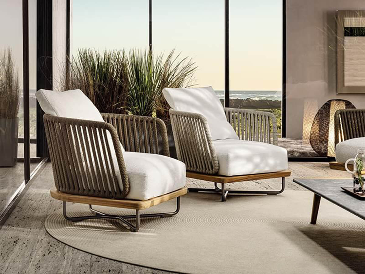 The Sunray seating line includes numerous proposals for the outdoors capable of tastefully furnishing the outdoor environment but at the same time actively communicating with the other proposals of the Minotti brand. An enveloping design combined with the choice of optimizing the feeling of relaxation and comfort characterize Sunray, whose structure consists of the union of a solid metal base and a natural teak top with an inclined section. The overlying mattress cushions of the seat rests in turn on the characteristic backrest with a tubular profile covered with a flat cord. Among the Sunray proposals we mention armchair, sofa, end element with or without extension top, chaise-longue, loveseat, daybed with reclining backrest and square and rectangular coffee table.