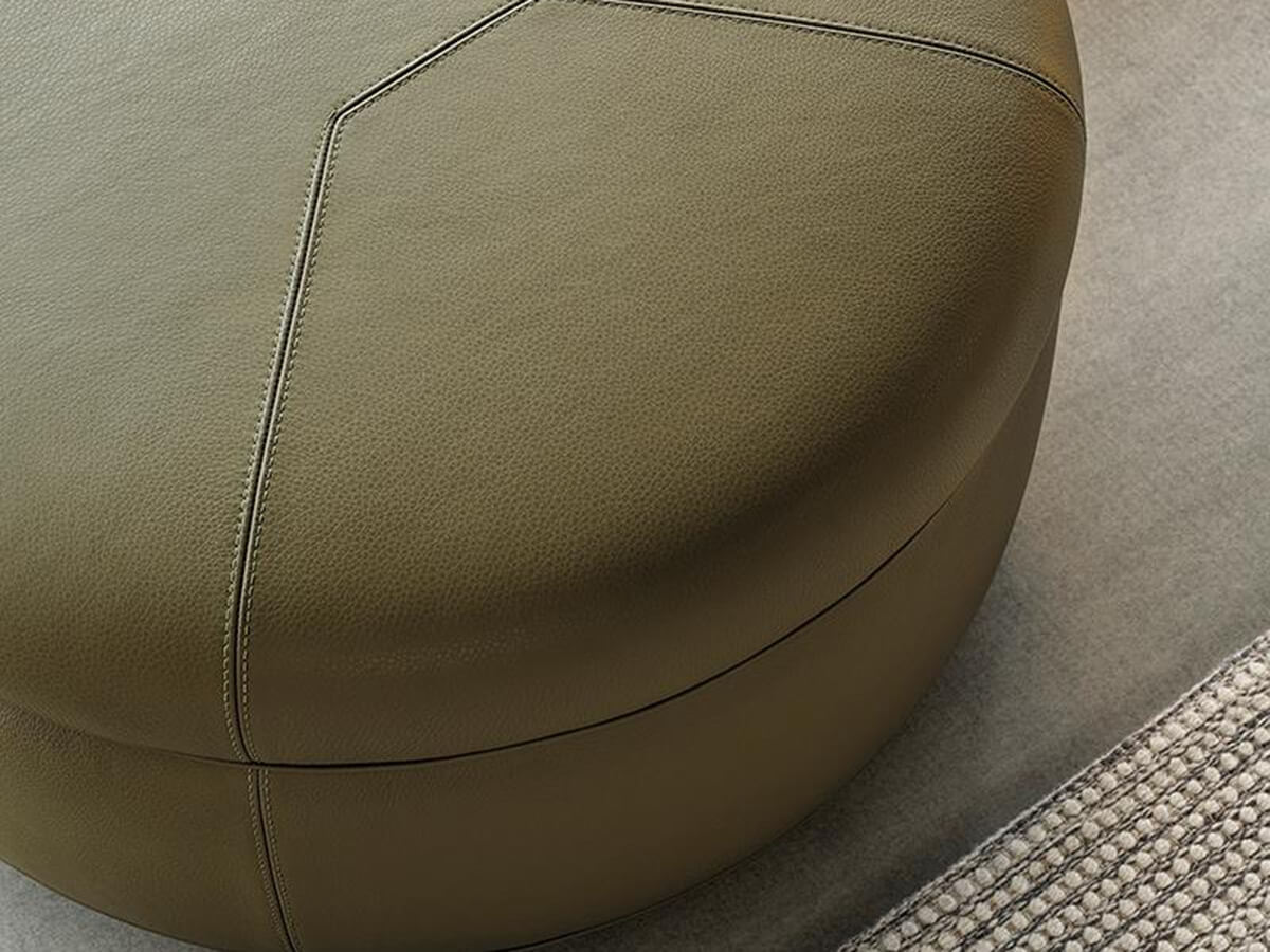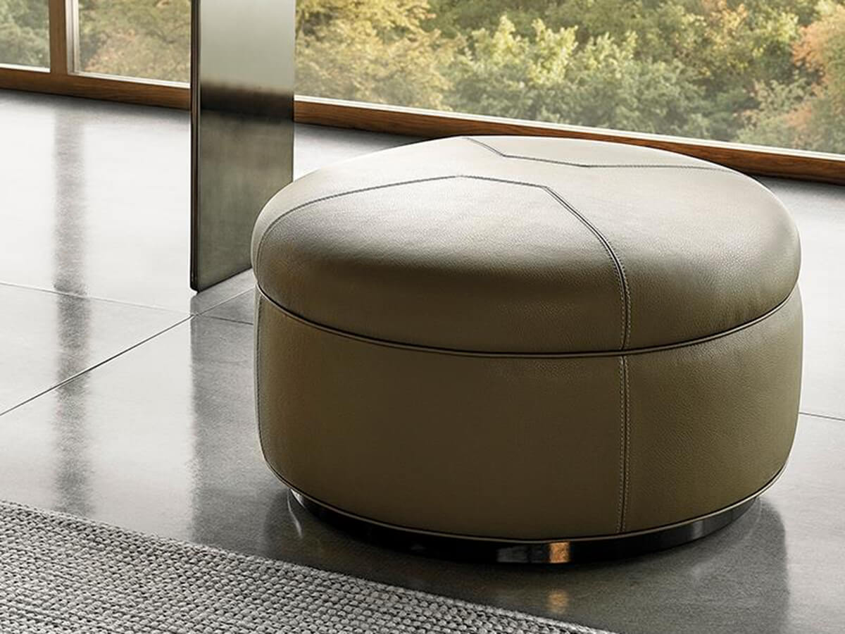 Designed by Rodolfo Dordoni and produced by Minotti, the Tuffet pouf revisits in a contemporary key a classic of Moroccan tradition. Available in a single size of circular shape, it has a pewter-colored glossy lacquered base and five invisible wheels that facilitate its shift. The completely removable upholstery, in fabric or leather, is finished with two cords, which emphasize the circumference and draw a symmetrical pattern on the upper part of the seat. The Tuffet pouf, with its soft and rounded shape, evokes a sense of romantic beauty in the spaces where it is inserted.