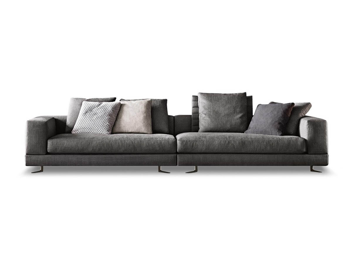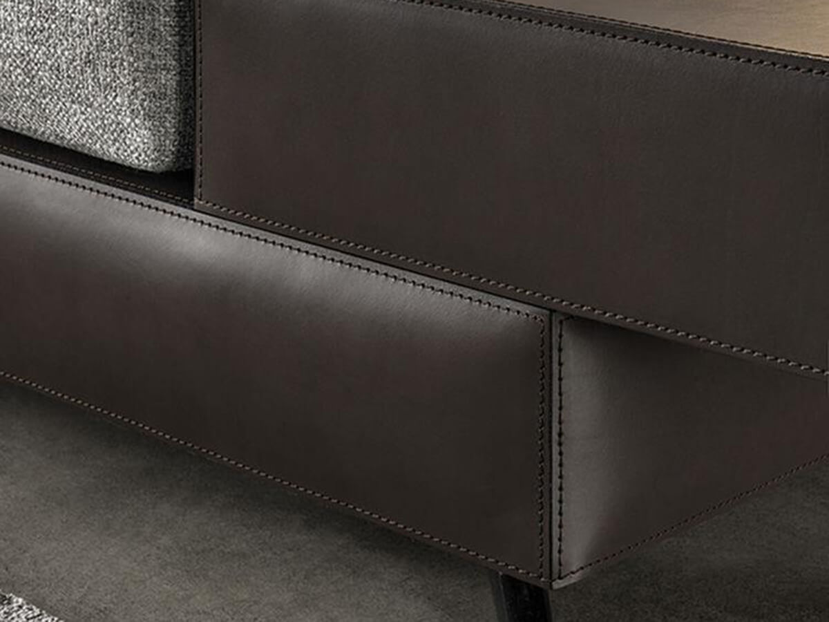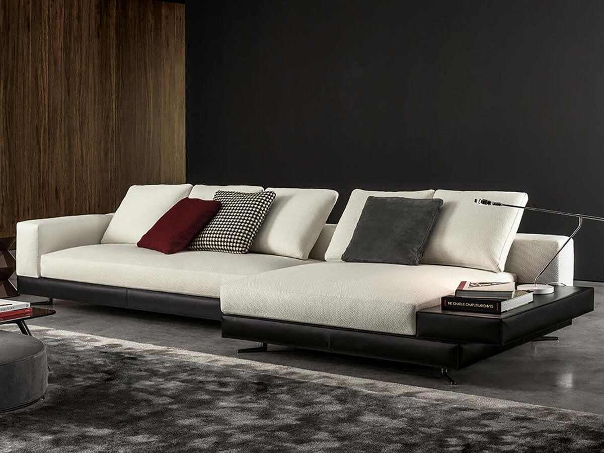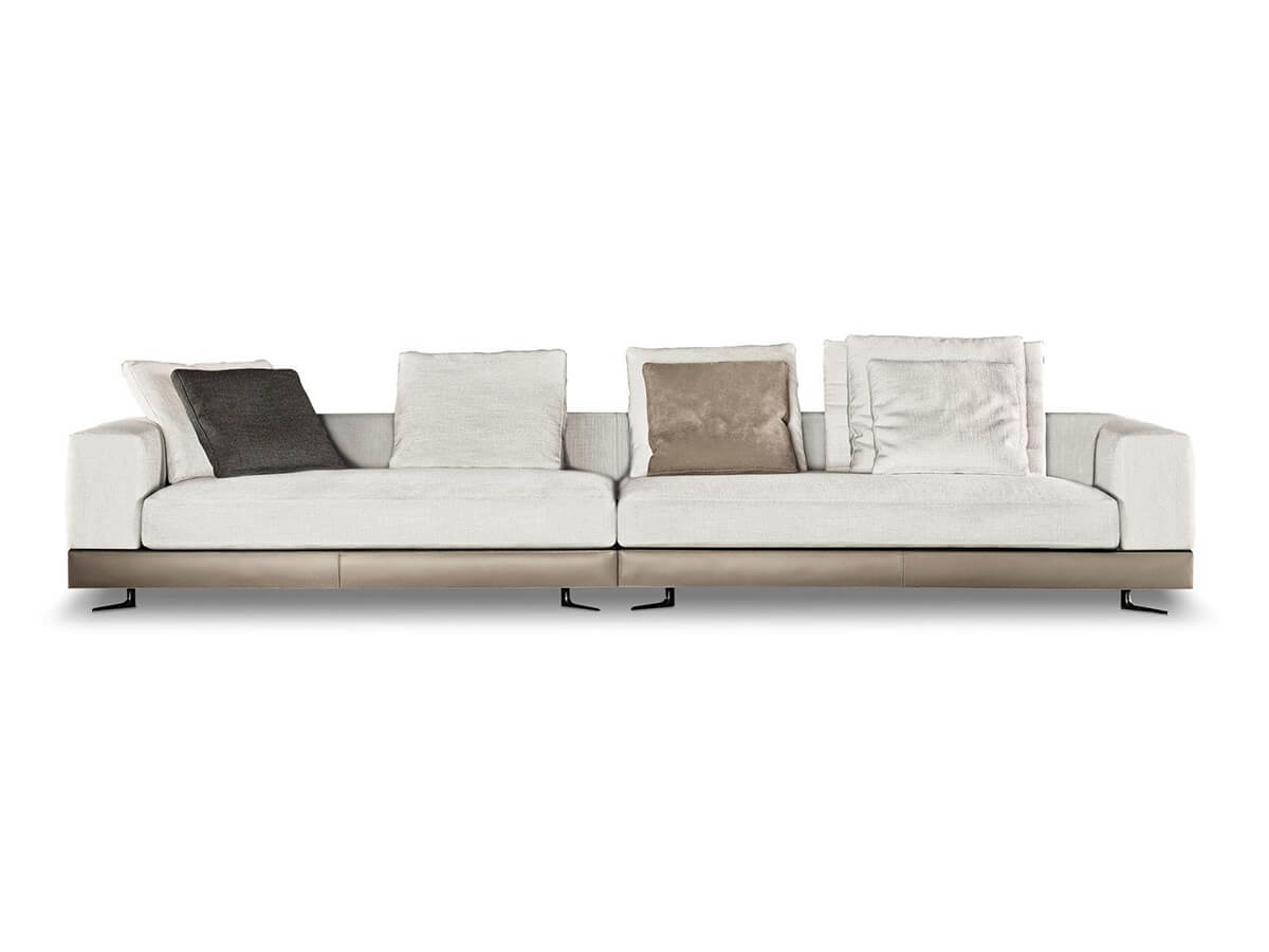White is a highly balanced seating system, capable of configuring itself in numerous possibilities so as to match the ideal piece of furniture for the living area of any home. Horizontal lines and seats at different depths give rise to dynamic, suggestive and extremely versatile compositions whose comfort is further accentuated by Minotti's choice of enriching the cushions with a more consistent thickness in goose down. The base of the sofa, in fabric, leather or hide, remains suspended on the ground thanks to die-cast aluminum feet placed at 45 ° in a rear position with respect to the corners of the sofa to give greater momentum and lightness to the overlying structure. Peculiar in White is the possibility of inserting shelves in place of the armrests or along the backrest to create more functional compositions.