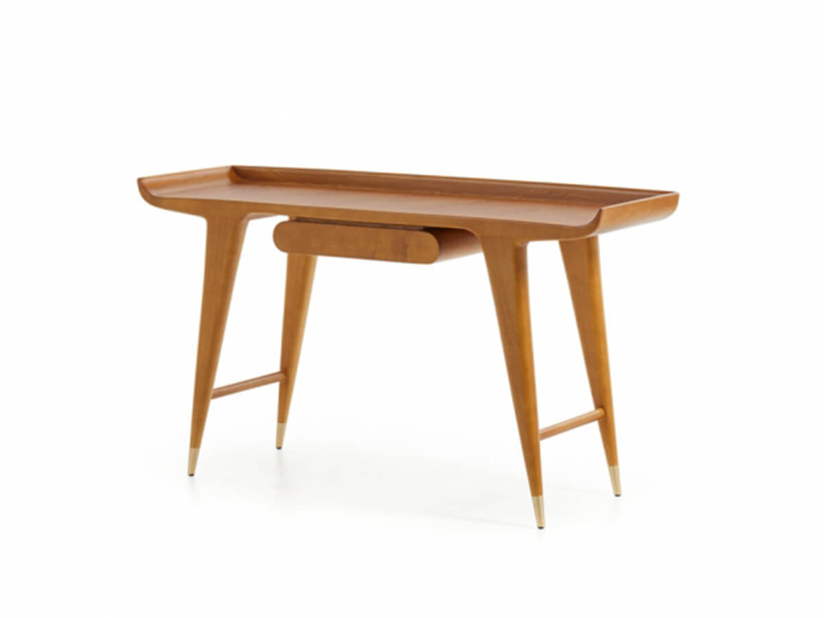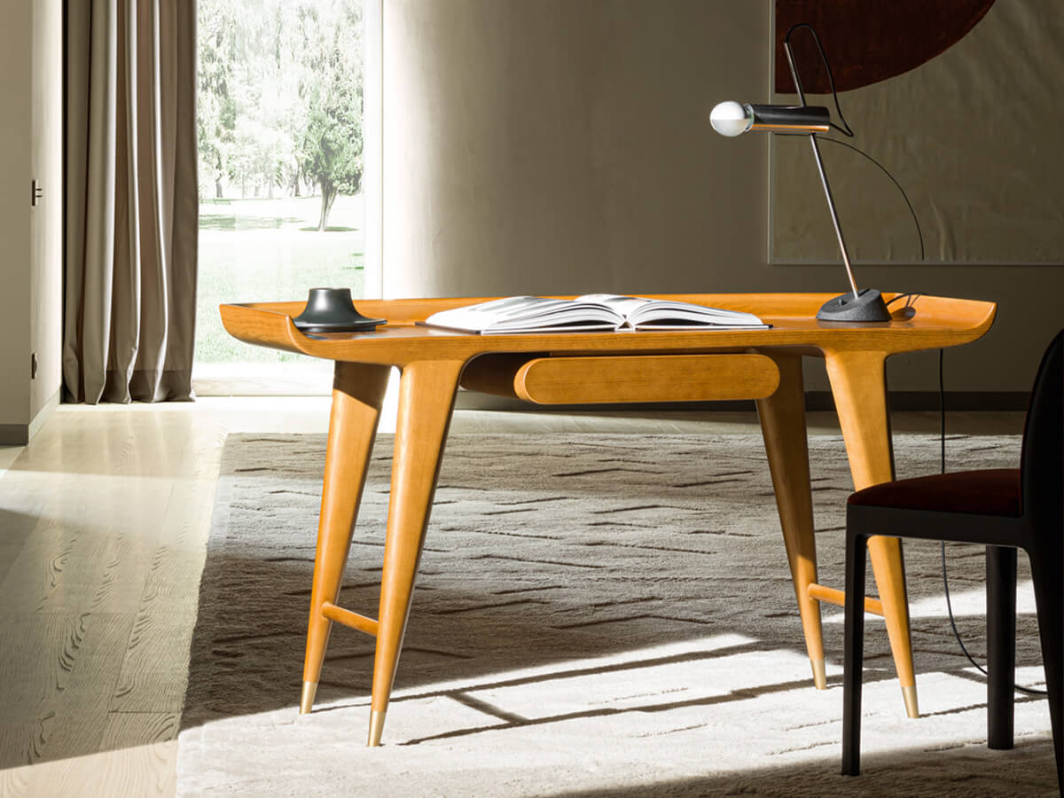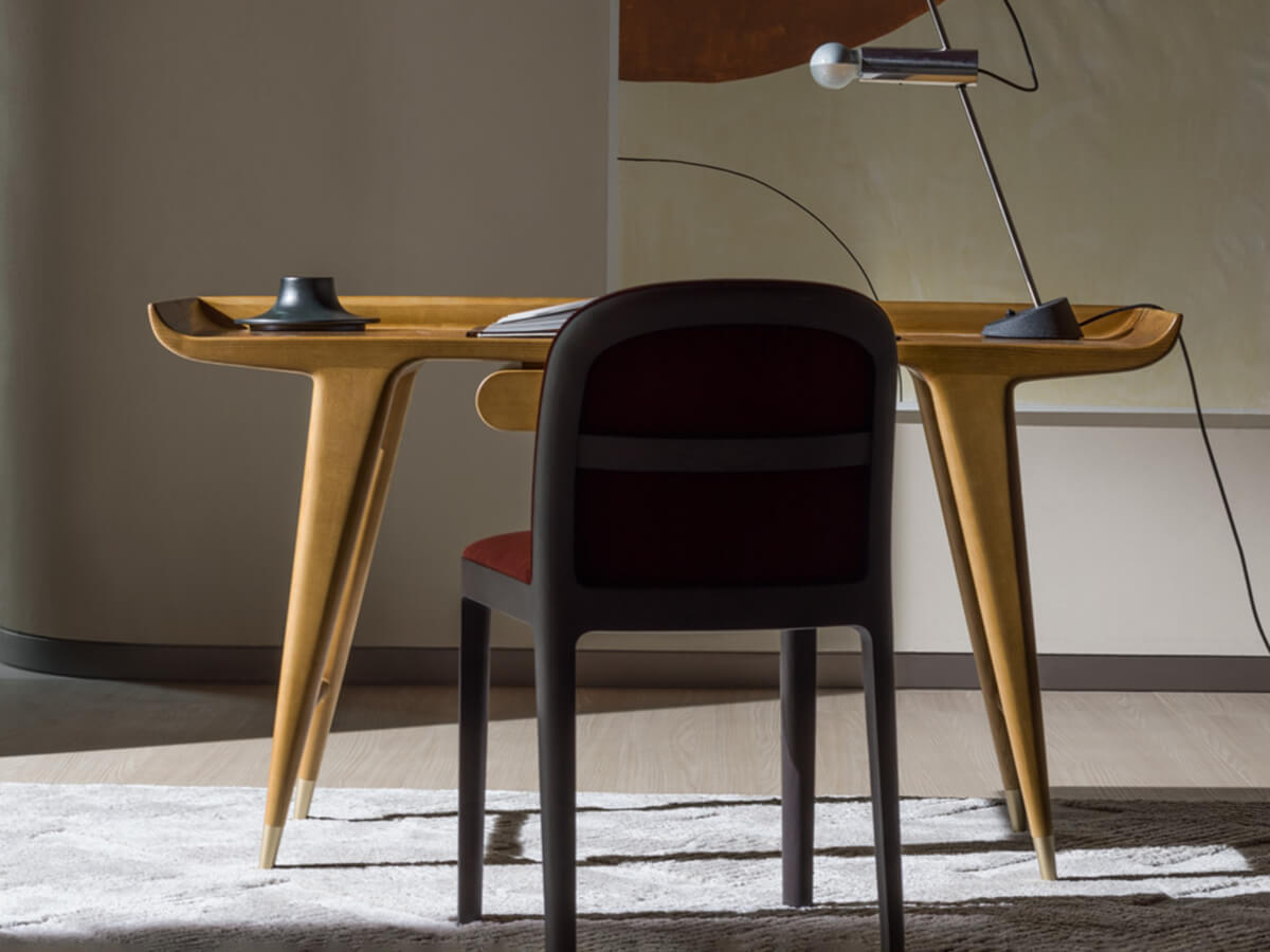 A desk with a strong and decisive character, capable of summarizing an unprecedented stylistic research in a few simple lines. The project brought to life by the Gio Ponti Archives lives on its own grace and beauty, further enhanced by the choice of excellent materials known not only for their resistance, but also for their refined quality. The desk is characterized by the top with curved terminals, similar to the wings of an airplane, and by the small underlying structure with a rounded front, an authentic novelty destined to become a real hallmark of many productions.