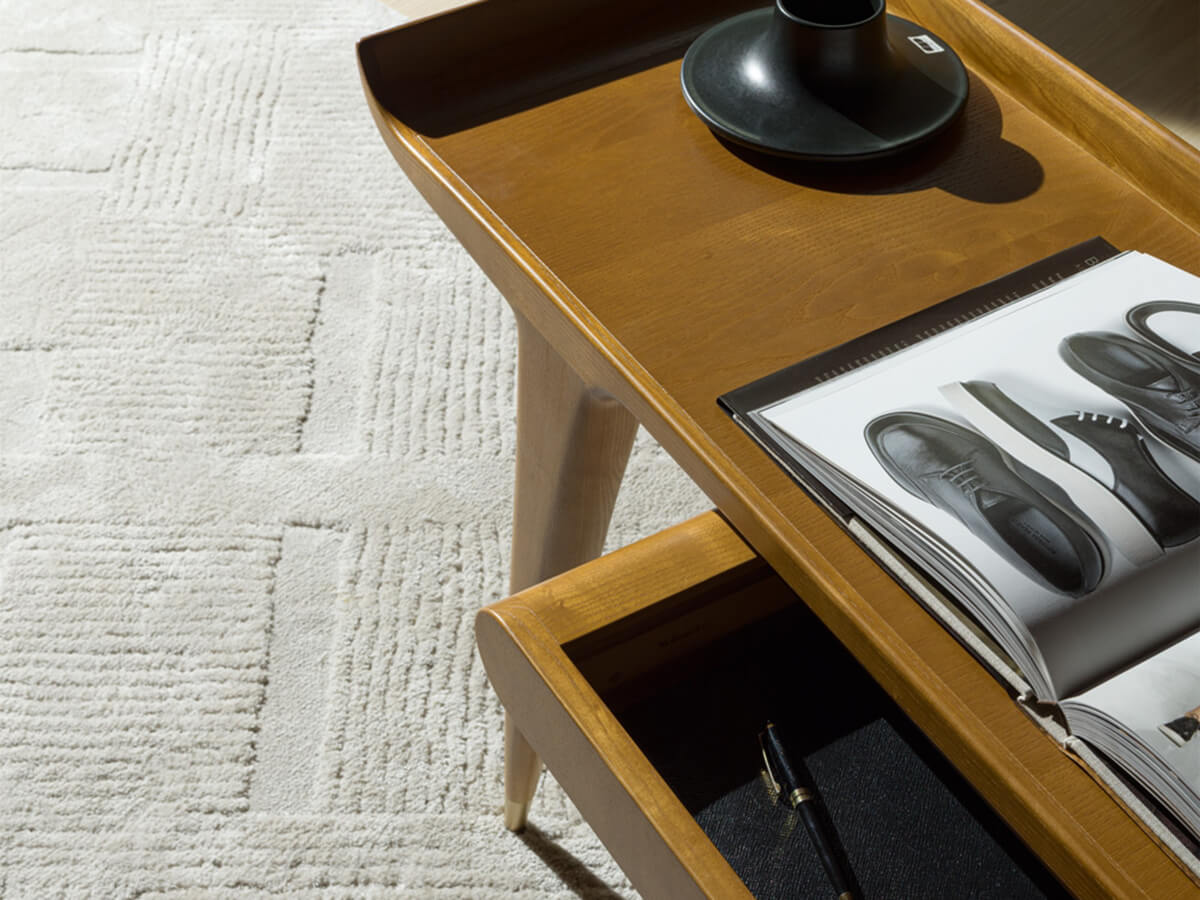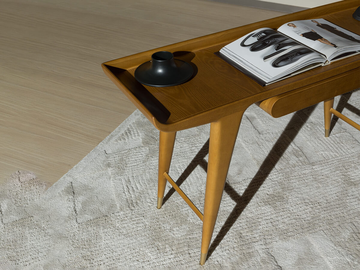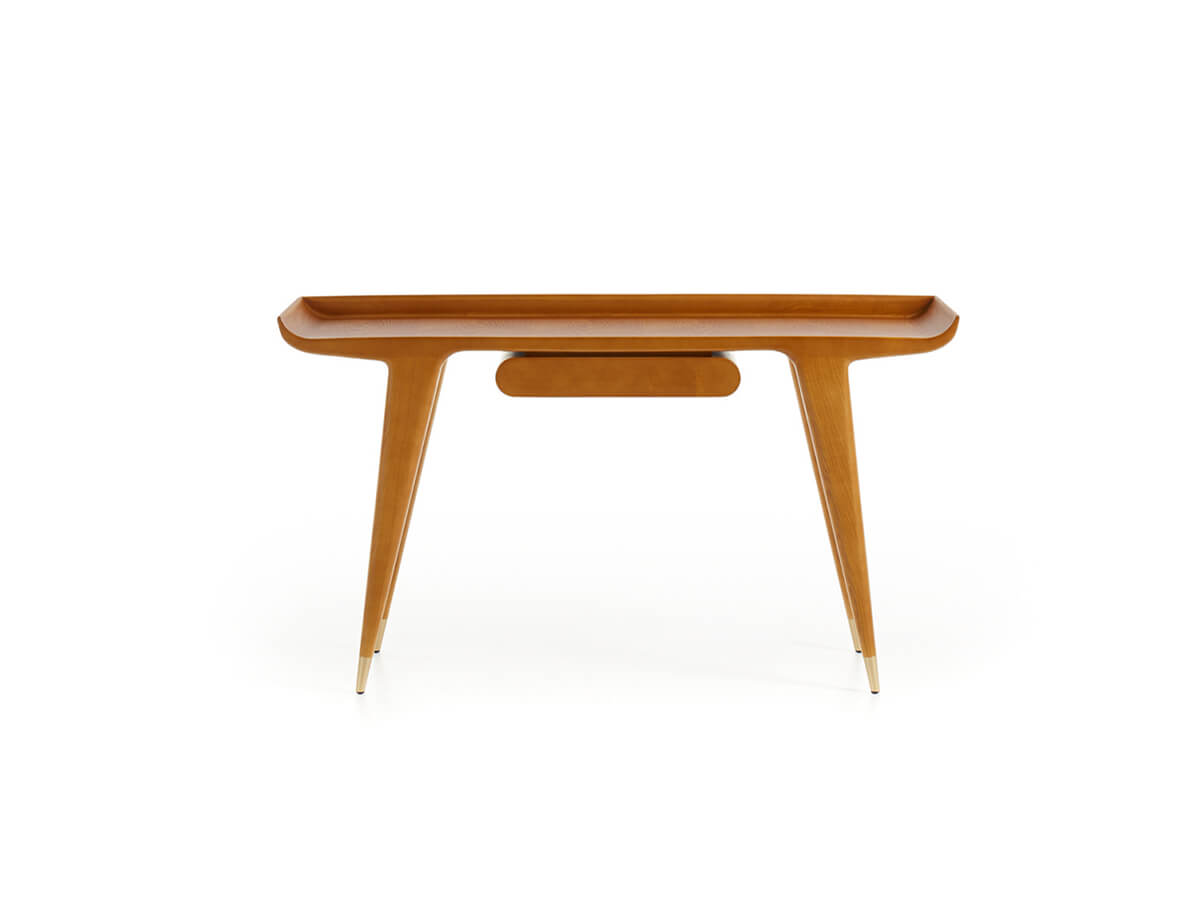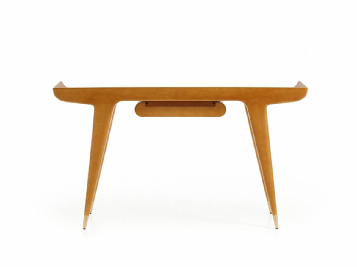 A desk with a strong and decisive character, capable of summarizing an unprecedented stylistic research in a few simple lines. The project brought to life by the Gio Ponti Archives lives on its own grace and beauty, further enhanced by the choice of excellent materials known not only for their resistance, but also for their refined quality. The desk is characterized by the top with curved terminals, similar to the wings of an airplane, and by the small underlying structure with a rounded front, an authentic novelty destined to become a real hallmark of many productions.