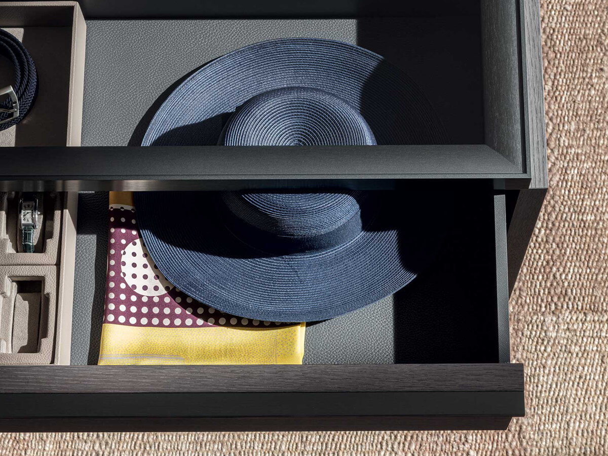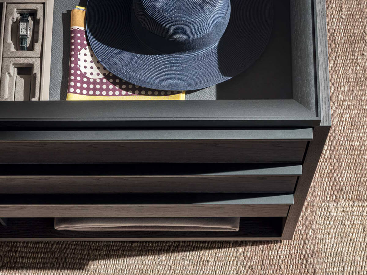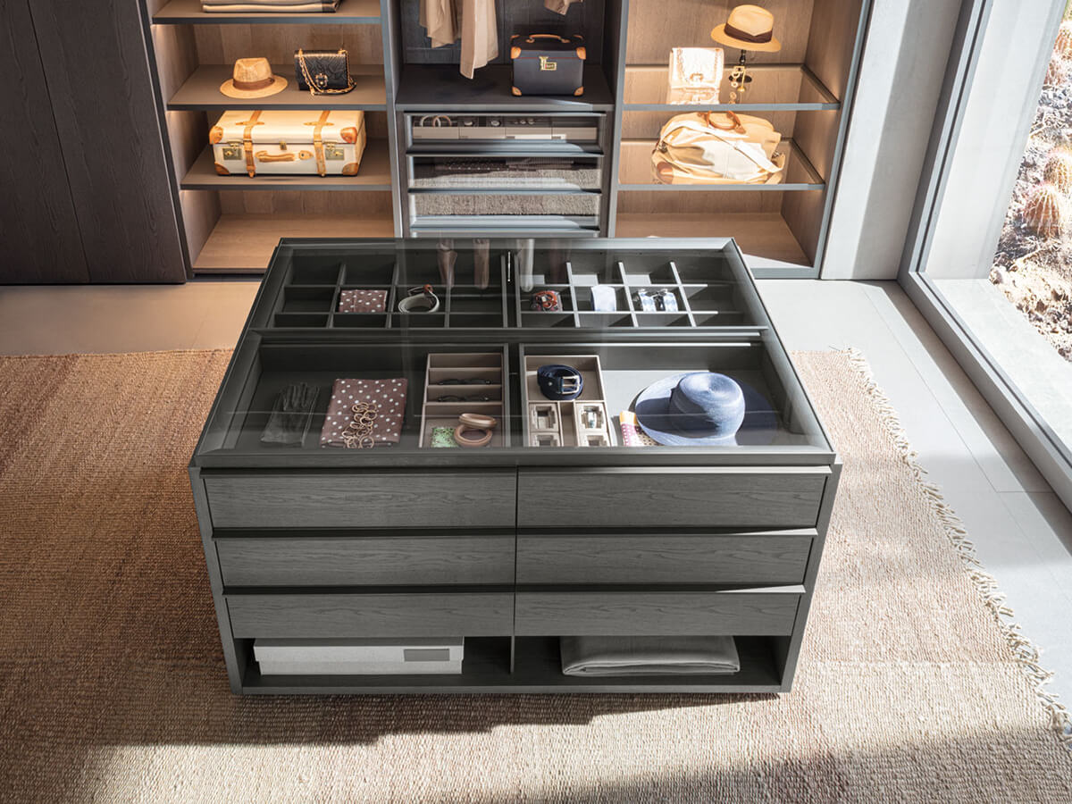 An indispensable and extremely versatile piece of furniture, useful for those who want to characterize their bedroom with an additional container element. Gliss Master Island is a central island, a free-standing element that completes the wardrobe space of the walk-in closet or wardrobe area. Its structure is well organized and consists of storage compartments, trays, transparent drawers with glass front, refined eco skin tops and numerous other elements capable of creating an extremely elegant and characterized whole. Among the possibilities of Gliss Master Island we also mention shoe shelves, tie racks, jewelry boxes and an innovative LED innovation system for better orientation during the night.* Technical features: handle available in pewter or bronze finish