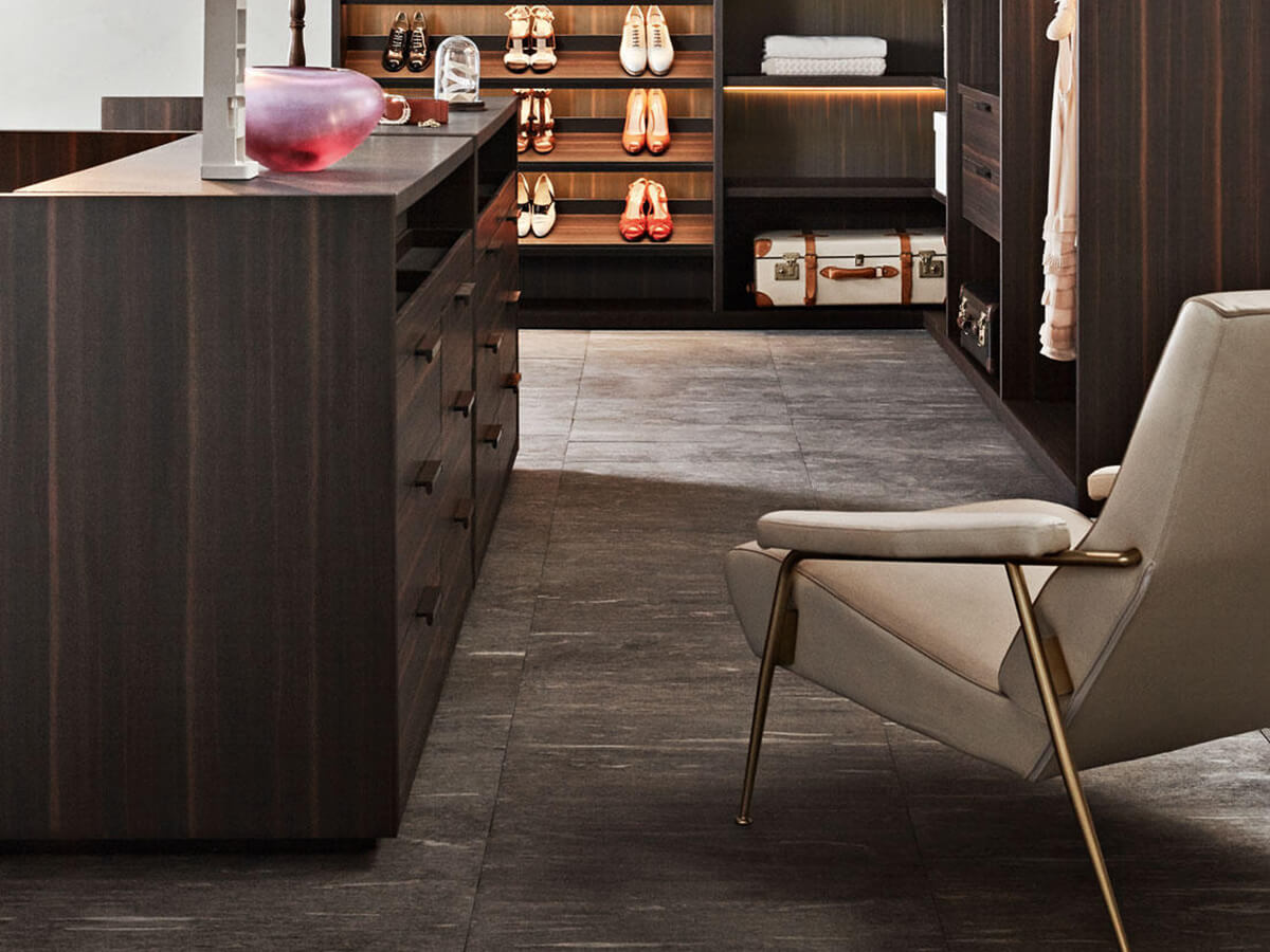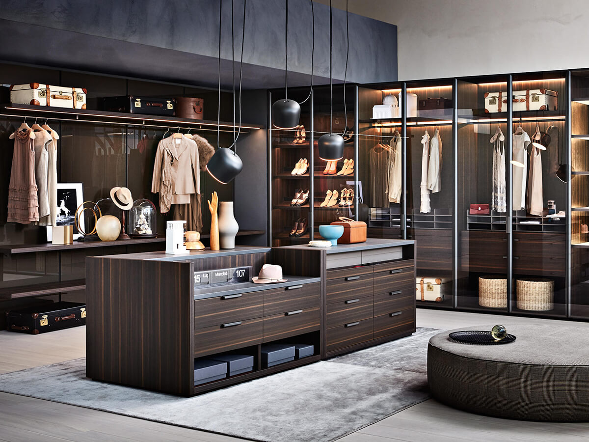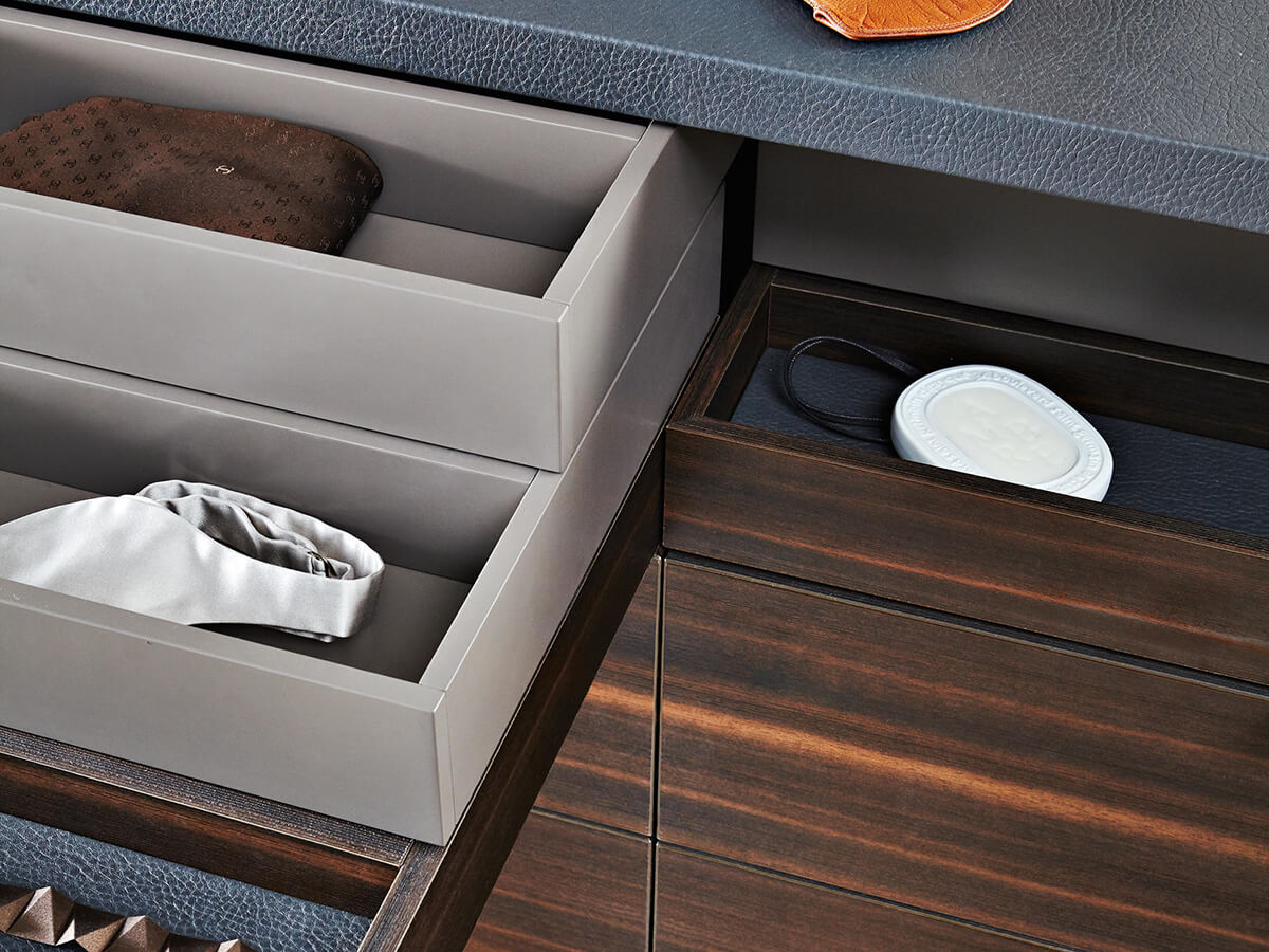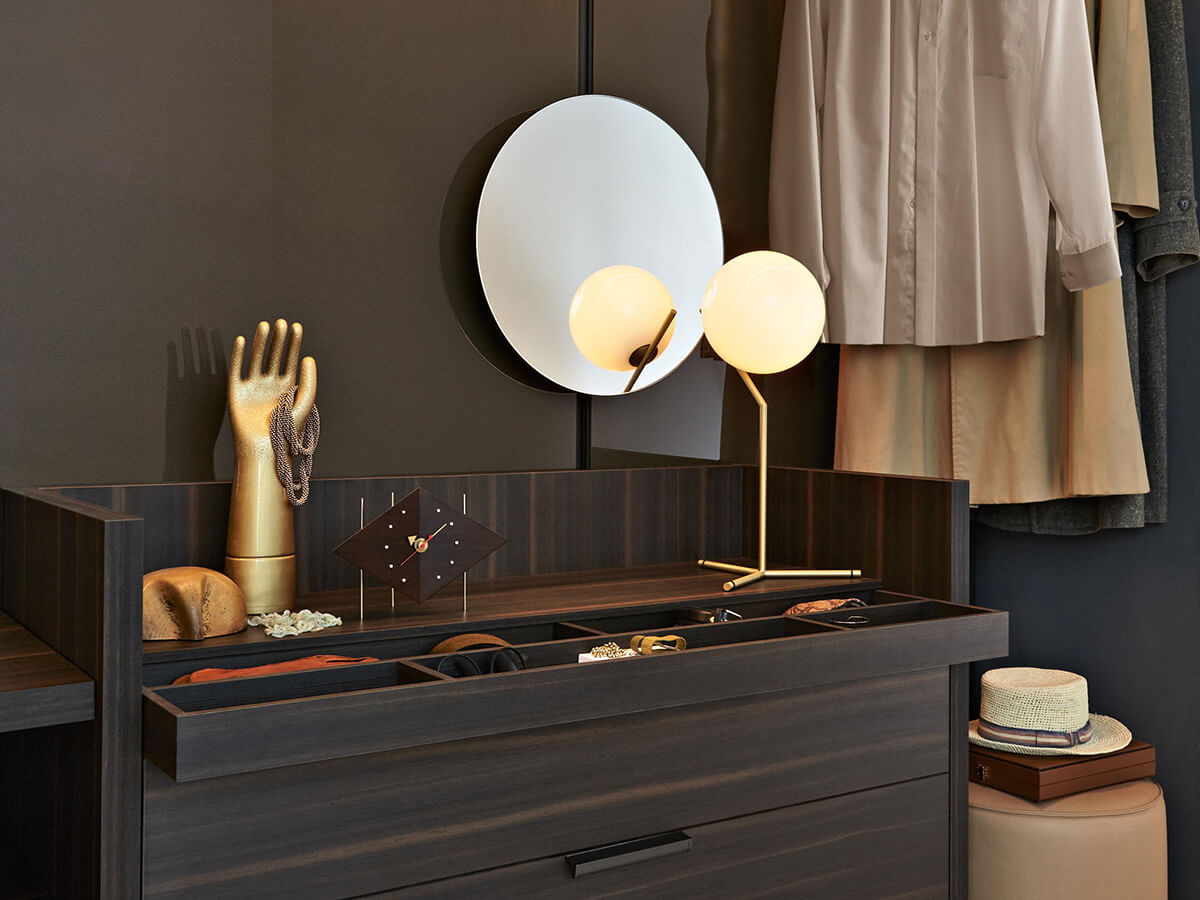 An indispensable and extremely versatile piece of furniture, useful for those who want to characterize their bedroom with an additional container element. Gliss Master Island is a central island, a free-standing element that completes the wardrobe space of the walk-in closet or wardrobe area. Its structure is well organized and consists of storage compartments, trays, transparent drawers with glass front, refined eco skin tops and numerous other elements capable of creating an extremely elegant and characterized whole. Among the possibilities of Gliss Master Island we also mention shoe shelves, tie racks, jewelry boxes and an innovative LED innovation system for better orientation during the night.* Technical features: handle available in pewter or bronze finish