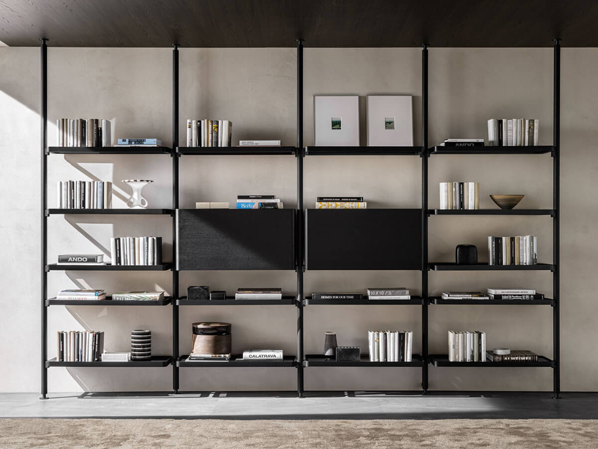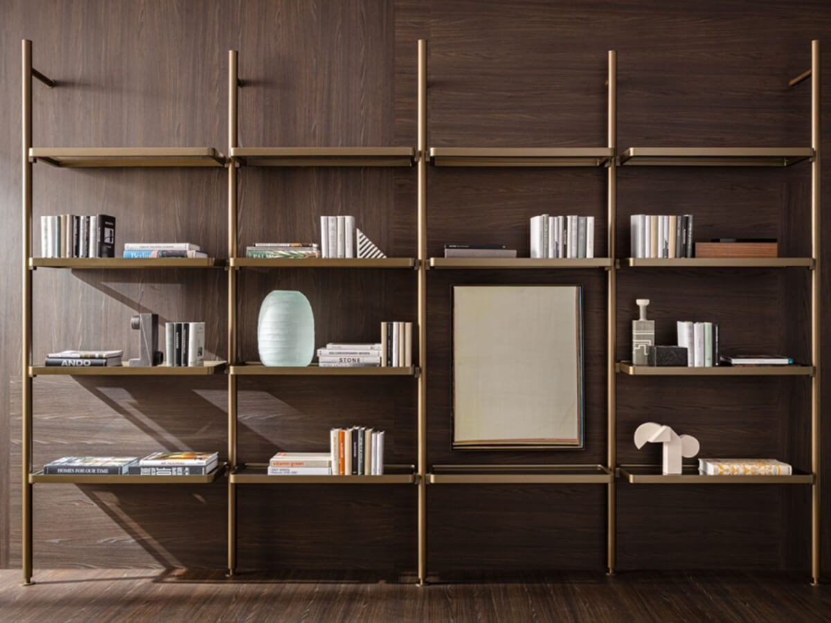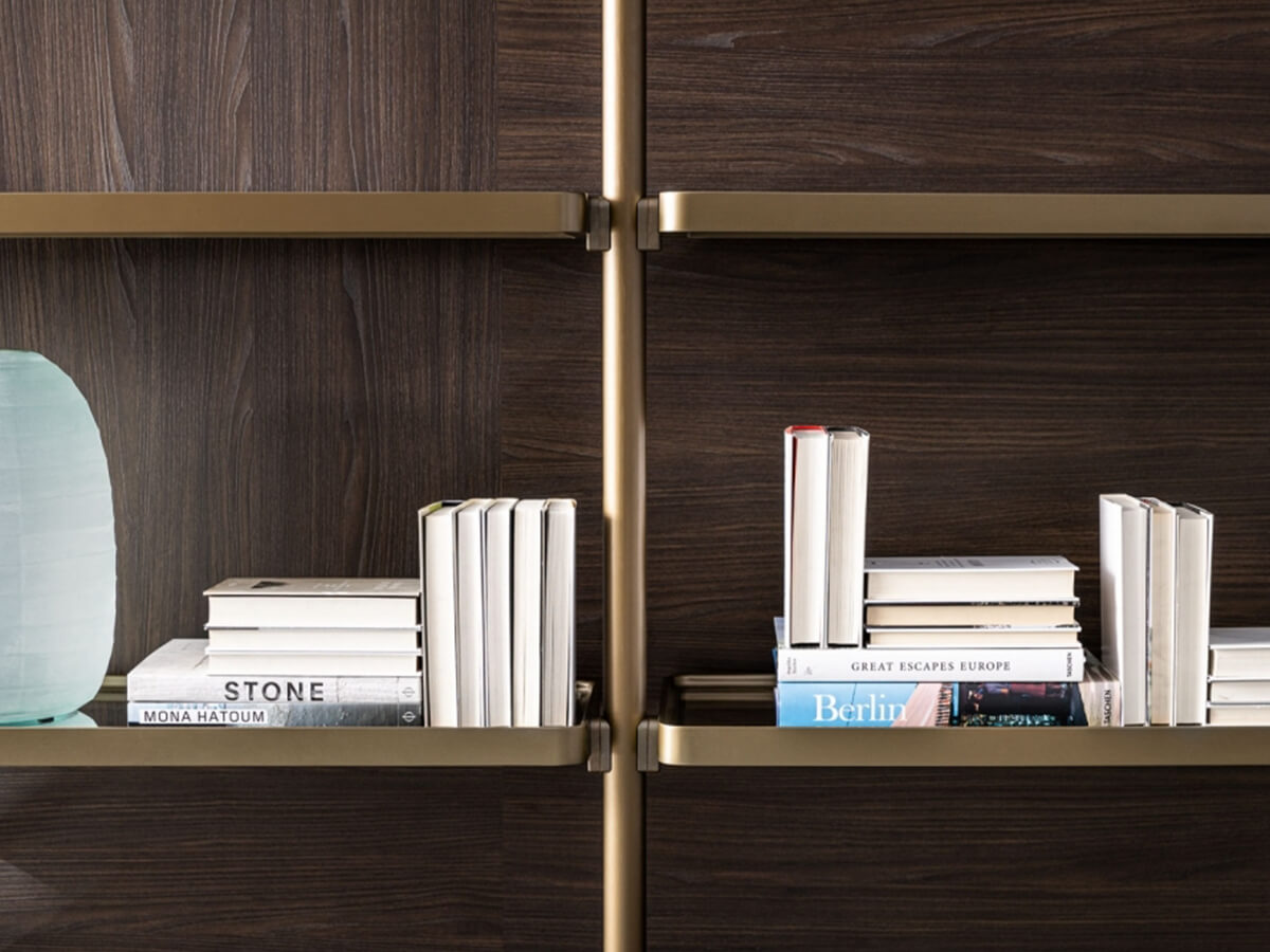 The Hector bookshelves by Molteni & C. directly bears the signature of its art director Vincent Van Duysen, who is measured for the first time with the versatile typology of upright bookcases. He proposes an interpretation that is perfectly in line with its elegant and almost aristocratic aesthetic, but does not lack a certain familiar warmth. The choice of finishes also goes in this direction, with the choice of warm materials such as wood or bronzed metal, which can also be used for the uprights. The inspiration for the project is drawn from the classic libraries in the modernist style, from which it incorporates the lightness of the compositions and the great formal balance, played on a reasoned alternation between "tray" shelves with rounded edges and capacious container elements. A support pole can also be equipped with the predisposition for hooking up the TV, thus making the Hector system also usable as a TV wall.