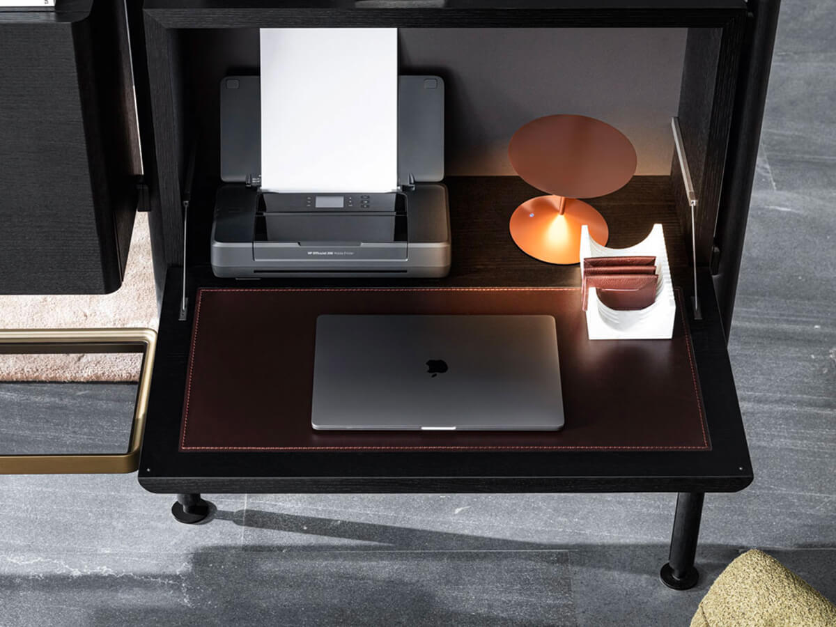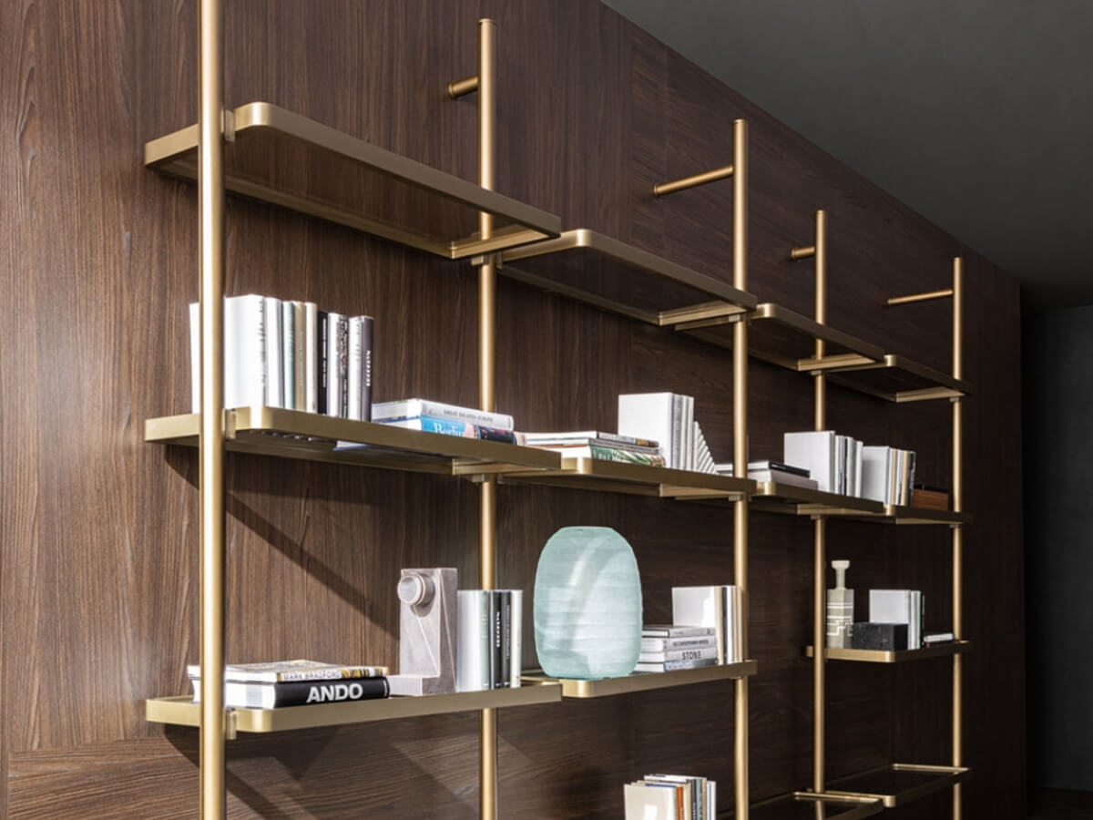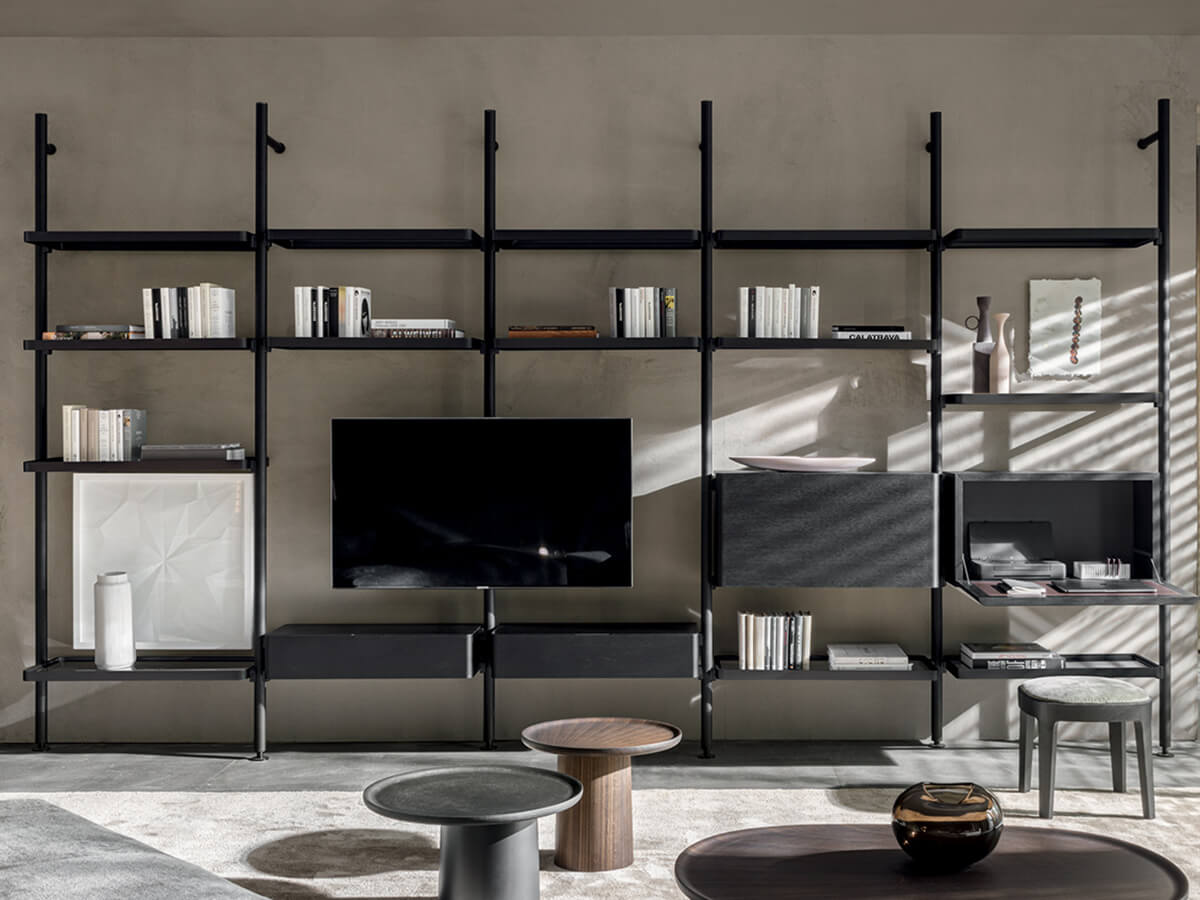 The Hector bookshelves by Molteni & C. directly bears the signature of its art director Vincent Van Duysen, who is measured for the first time with the versatile typology of upright bookcases. He proposes an interpretation that is perfectly in line with its elegant and almost aristocratic aesthetic, but does not lack a certain familiar warmth. The choice of finishes also goes in this direction, with the choice of warm materials such as wood or bronzed metal, which can also be used for the uprights. The inspiration for the project is drawn from the classic libraries in the modernist style, from which it incorporates the lightness of the compositions and the great formal balance, played on a reasoned alternation between "tray" shelves with rounded edges and capacious container elements. A support pole can also be equipped with the predisposition for hooking up the TV, thus making the Hector system also usable as a TV wall.