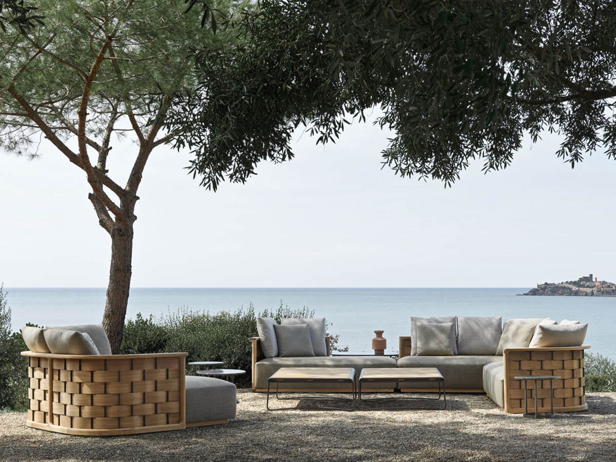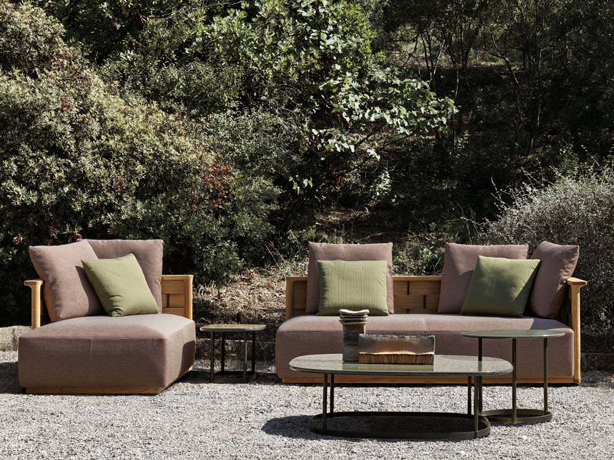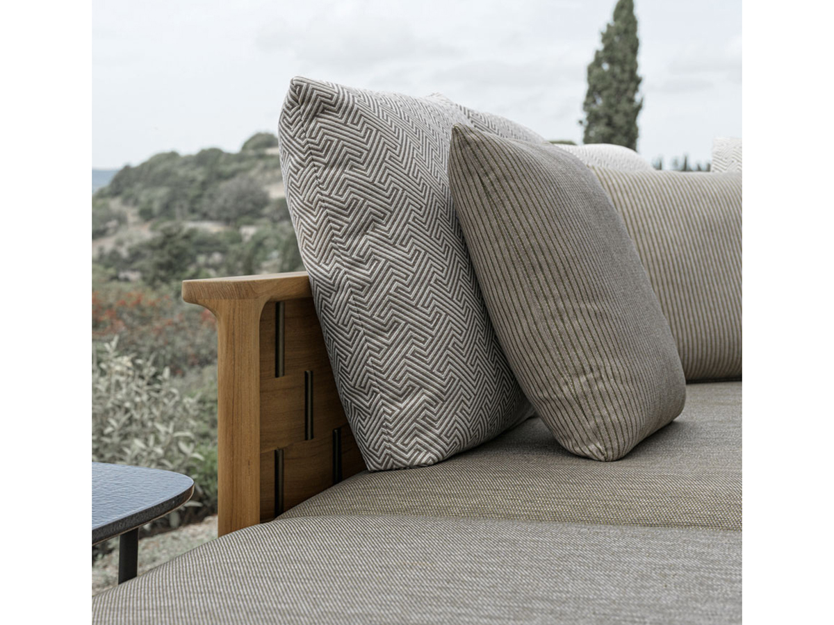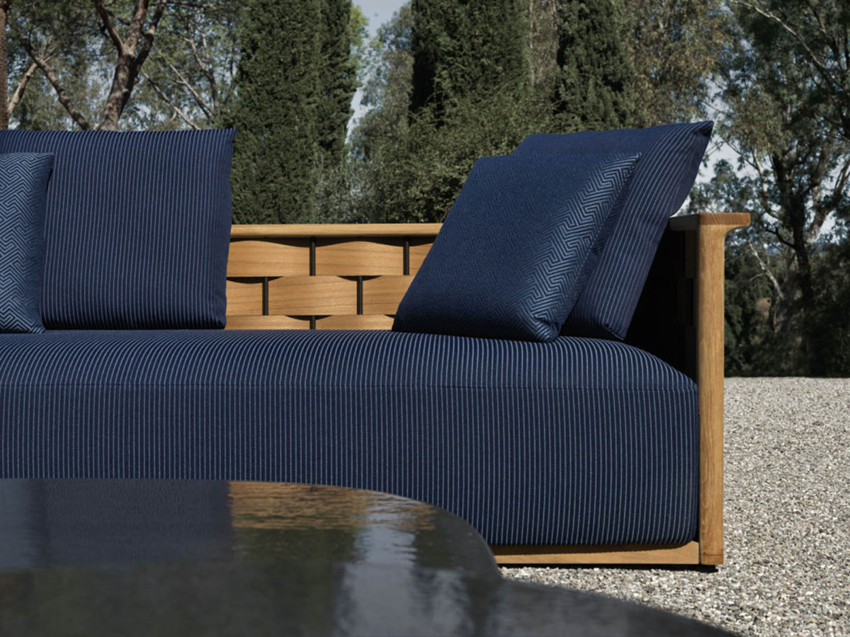 Palinfrasca is a sofa with a sober but unconventional look, which plays with volumes creating an extremely fluid and compact aesthetic that nevertheless tolerates some stylistic points that make the whole more relaxed and versatile. Palinfrasca wants to pay homage to the 1994 work by Luca Meda that inspired it, giving a new interpretation to the teak used here for both the base and the backrest. A well-stocked compartment of cushions and pillows creates the central core of the sofa that welcomes and makes it possible to create a real corner of peace for all those who love to stretch out and enjoy time in the open air. Available in different colors and sizes.