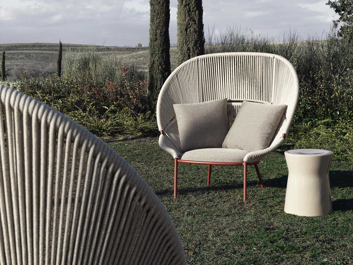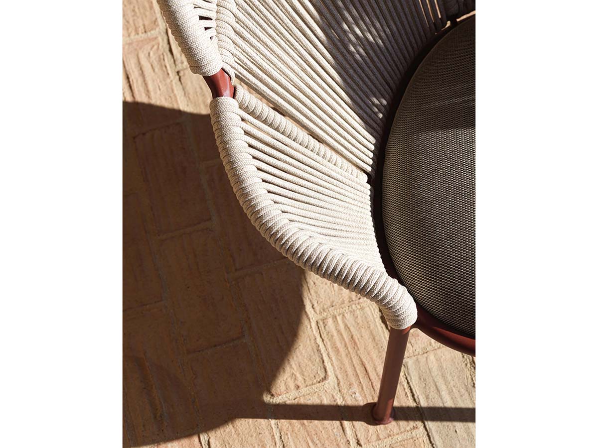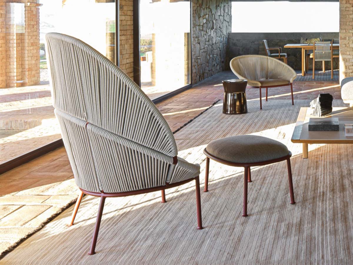 An armchair with an extremely strong and distinctive design, which is not afraid to dare and take expressiveness to the highest levels. Petalo is an armchair including a pouf, created by Vincent van Duysen for Molteni&C. and belonging to the Outdoor Timeout collection. It is a seat with soft and enveloping curves, which seem to invite the body, welcoming it in unprecedented comfort. The beauty of the seat is also due to the precious workmanship of the rope, here clearly visible in the backrest, available in both a high and low version, depending on the need. The woven motif, which recalls the nautical world, is elegant and at the same time water-resistant, to facilitate use in the open air.