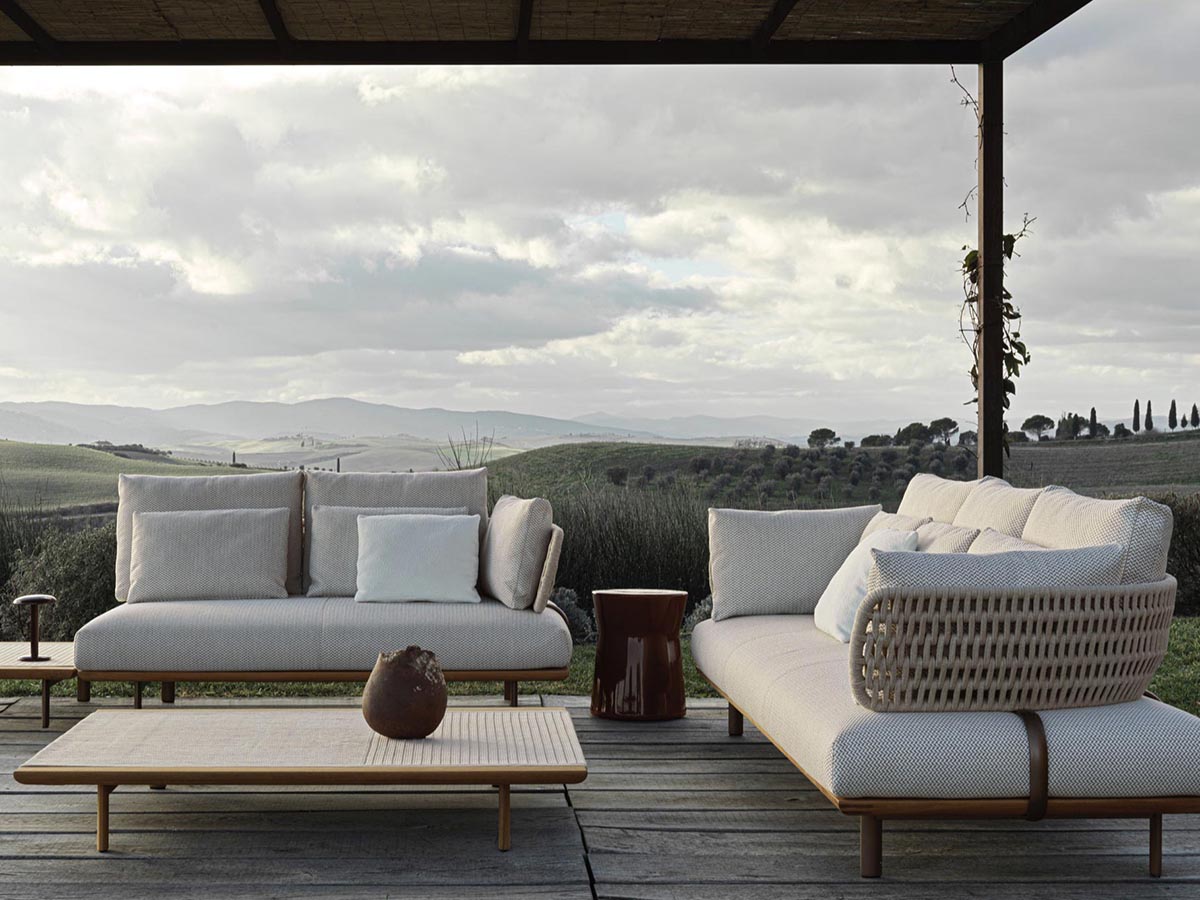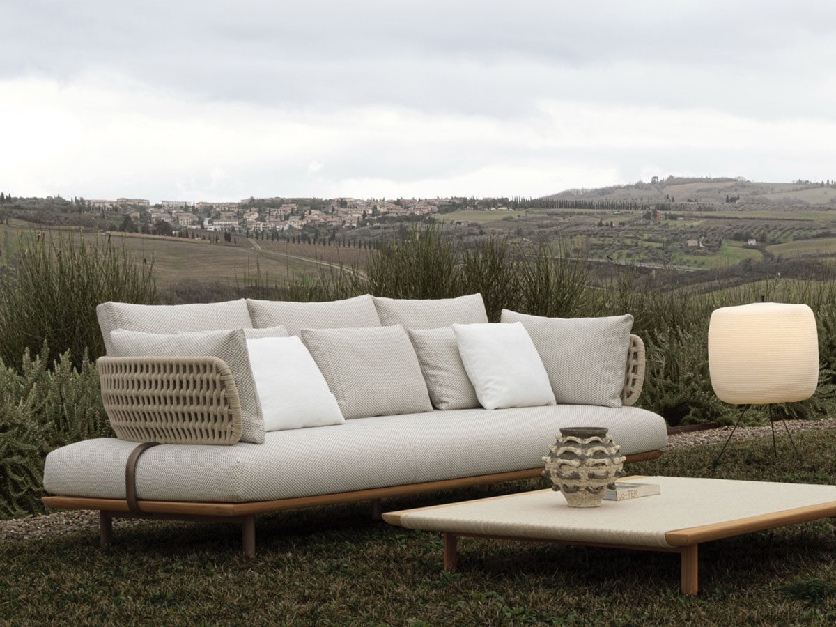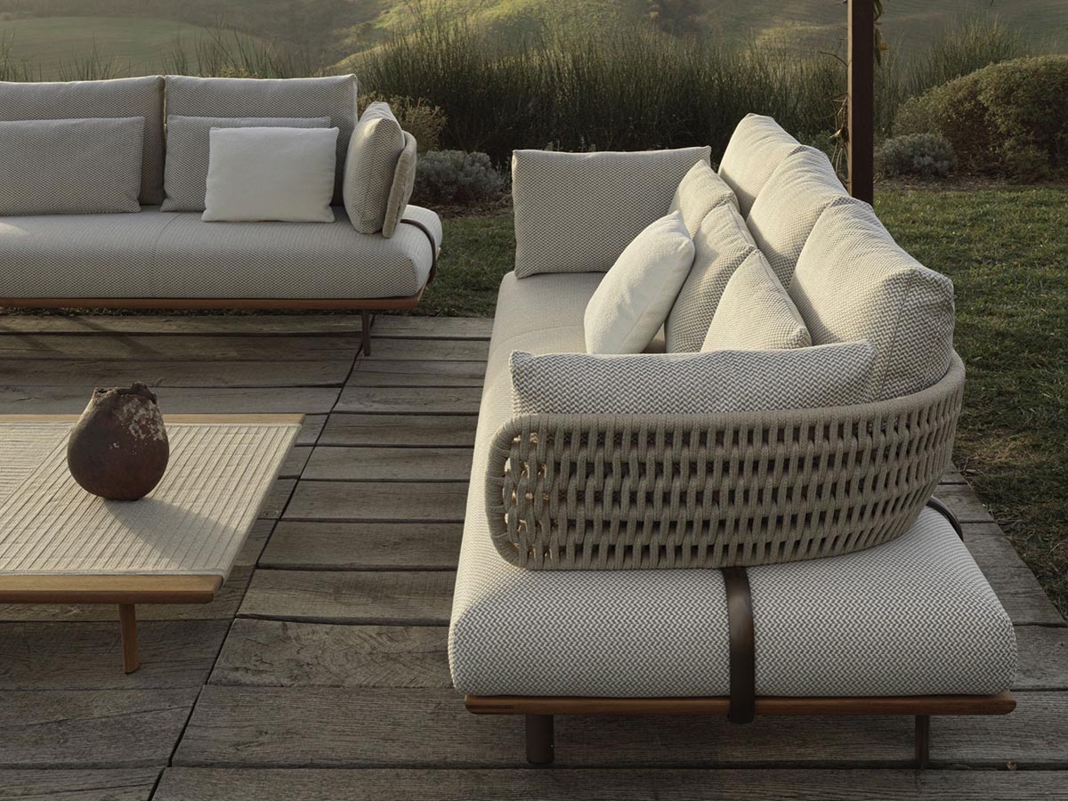 *Price valid for the linear version in W.170 cm with upholstery in fabric cat. B - base in teak and weaving in ecrù cord - n.02 back cushions cm 60x50, n.02 armrests cushions cm 60x40 e n.02 lumbar cushions cm 45x40 included (cod. SDV17 + 2 x cod. SCU60 + 2 x cod. SCB60 + 2 x cod. SCP45).