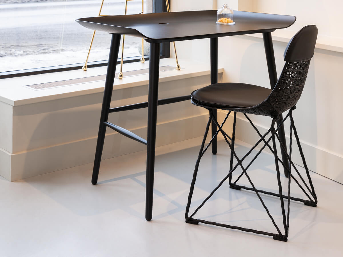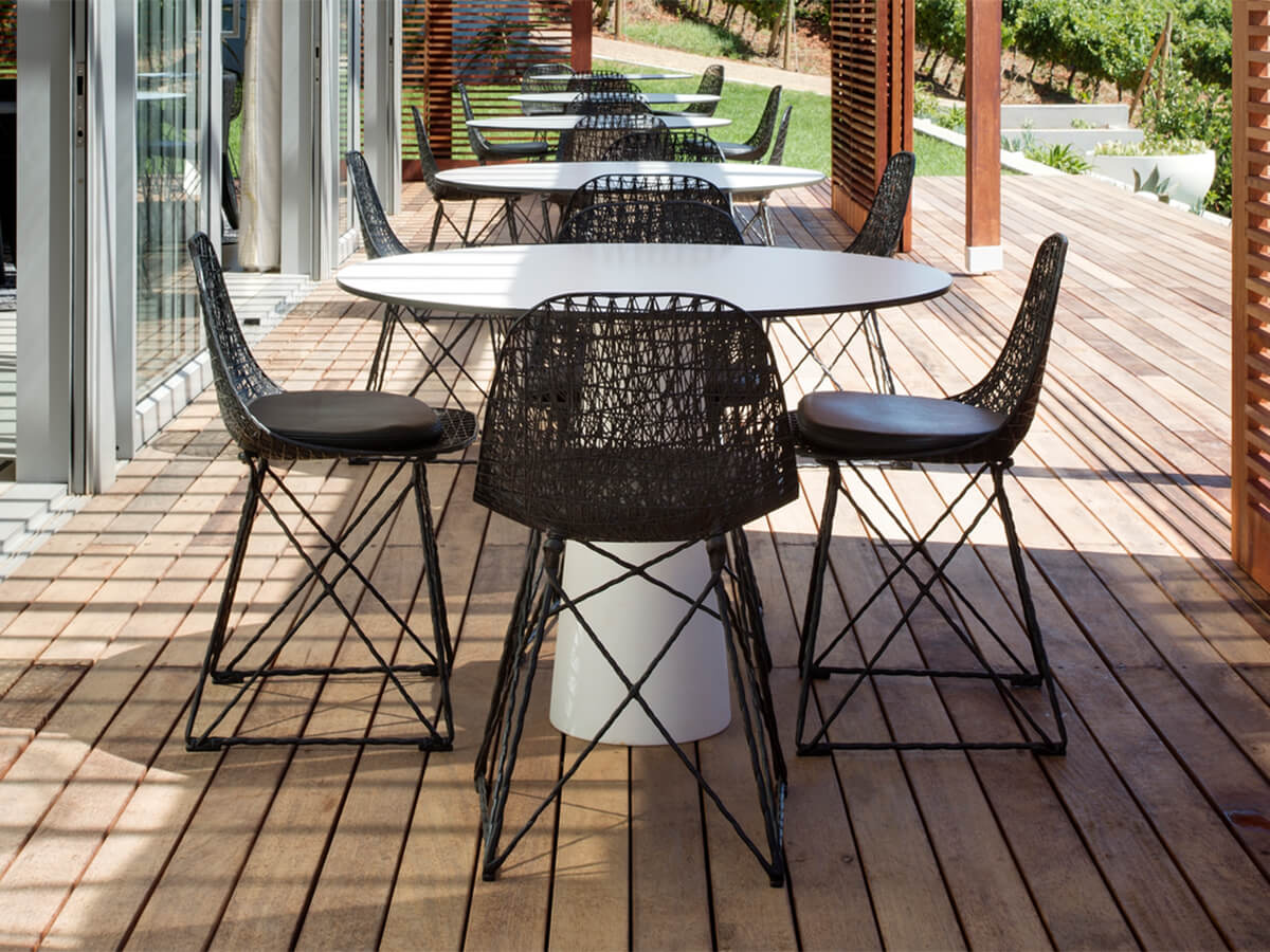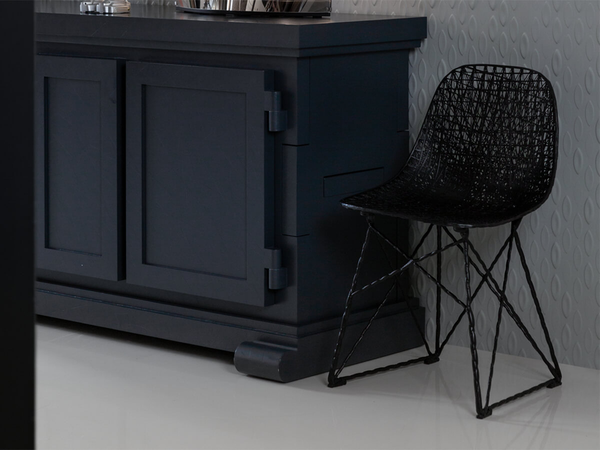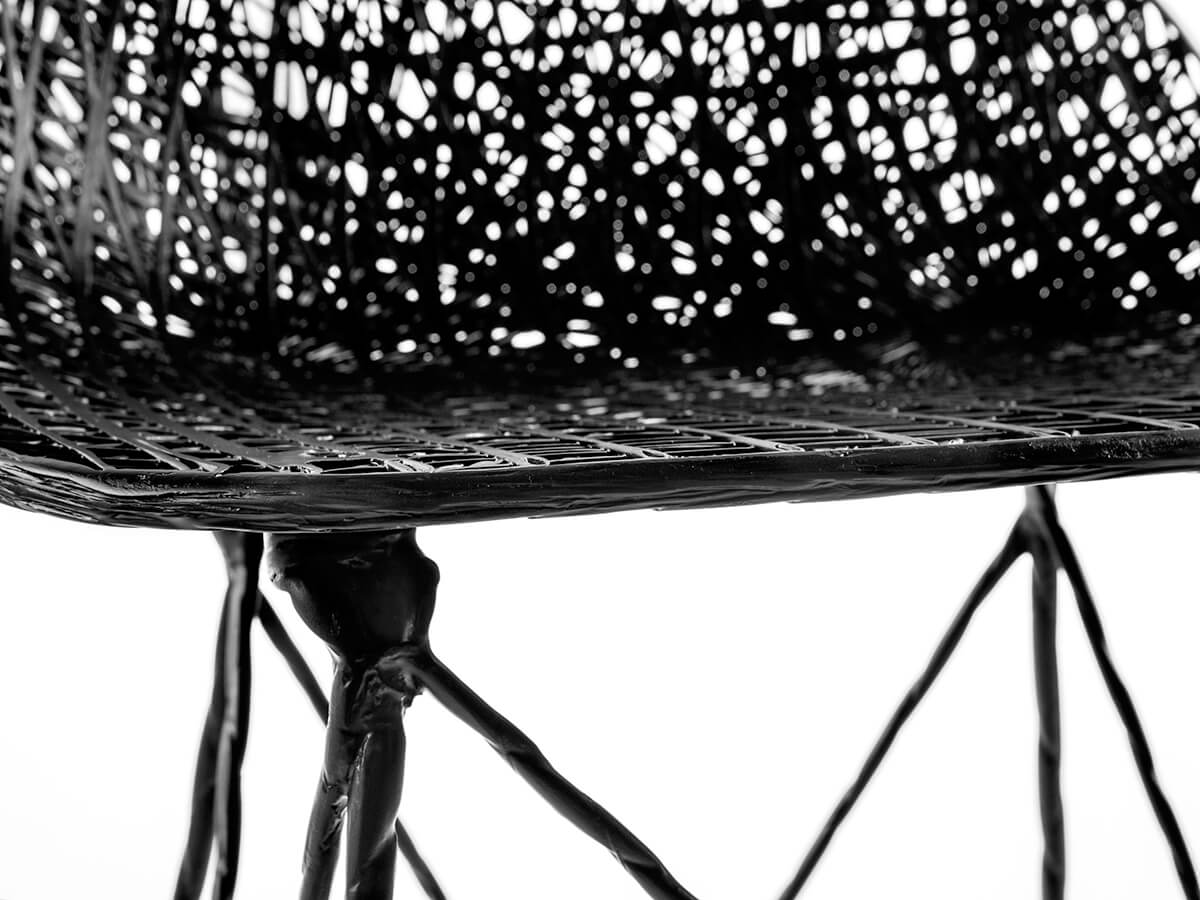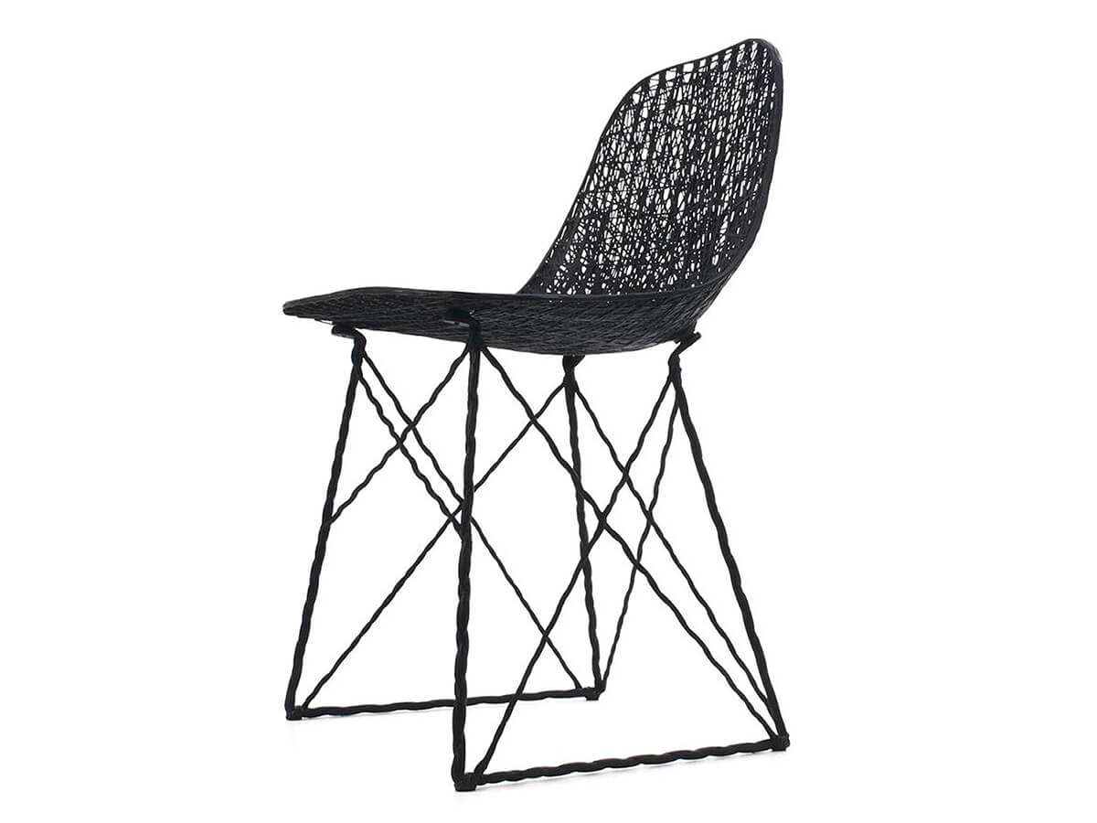 The Carbon Chair by Moooi is the result of an experimentation by its designers Marcel Wanders and Bertjan Pot with a material with still largely unexplored potential such as carbon fiber, ten times stronger than steel and at the same time very light. The seat and back of the Chair feature numerous carbon fiber filaments intertwined with each other with the effect of a spider's web. The thin legs are also made of carbon fiber, modulated into a single sled structure attached to the body by means of screws. Given the characteristics of the material, the chair can also be used as outdoor furniture. Carbon Chair can optionally be made more comfortable with the addition of a seat cushion, but in this version it is only suitable for indoor environments.