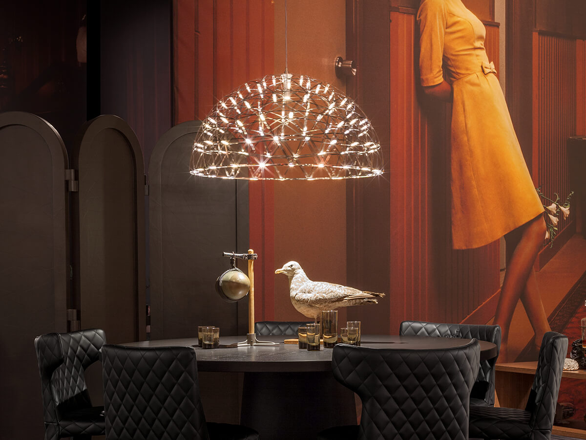 Graceful and surreal, Raimond is a lamp that seems to be inspired by the future and by a design idea that focuses on the essence and the ability to enhance the use of materials thanks to unique, visually attractive geometries. The Raimond lamp by Moooi was born as a perfect sphere of mathematical ingredients and a punctuation made of tiny LED lights. The effect reminds a starry night. Transparent lenses are affixed close to each light in order to guarantee a uniform and shadow-free diffusion. Thanks to the attention to these details, Raimond fits well in different contexts, from dining rooms to restaurants, lounges, halls and more.