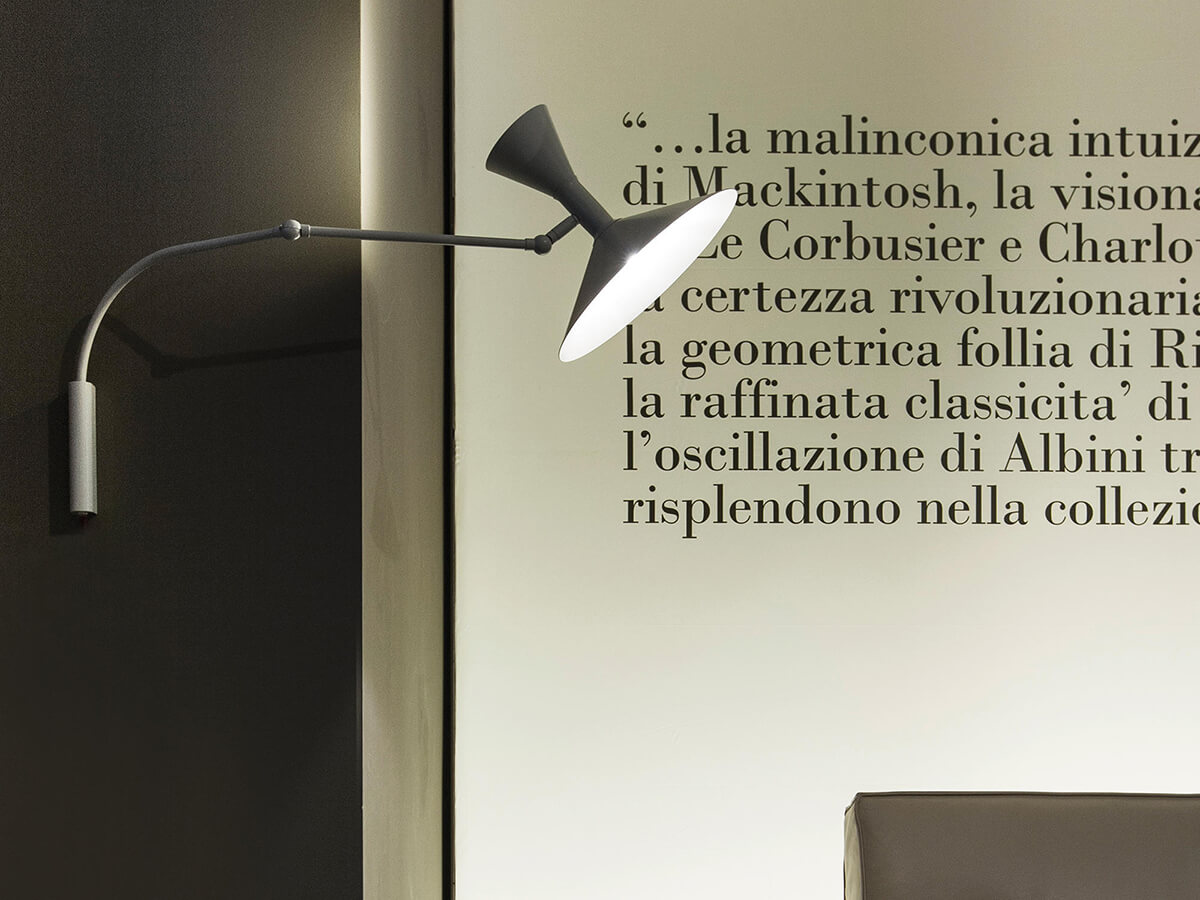 A lamp with a timeless charm, able to fascinate fans of the sector yesterday as today, without ever losing its enamel. Designed by Le Corbusier for the Marseille apartment in 1949/52, it has since then been able to carve out its own space in the collective taste, marking the pace of many subsequent works. It is a wall lamp with two joints on the arm and a wall attachment that allows it to rotate. Marseille is available in different versions including Mini, practical and easy due to its small size. It is made of aluminum with a turned sheet diffuser. Among the many variants, we mention the ones with matt gray, lime white or black painted structure and with an interior equipped with diffusers.