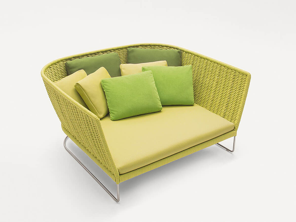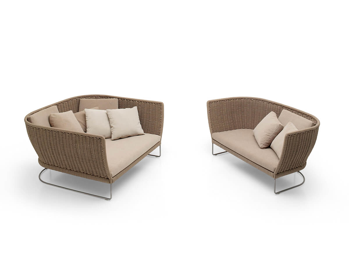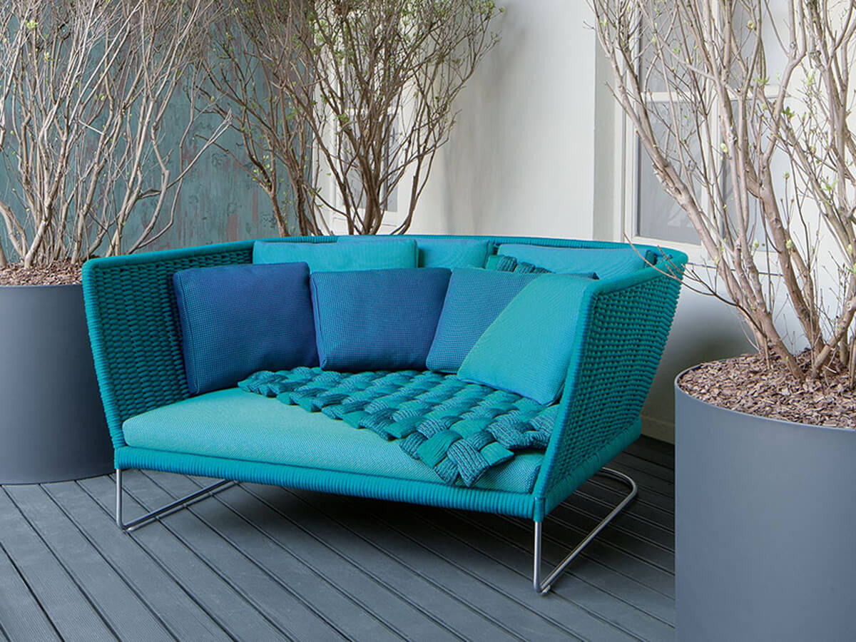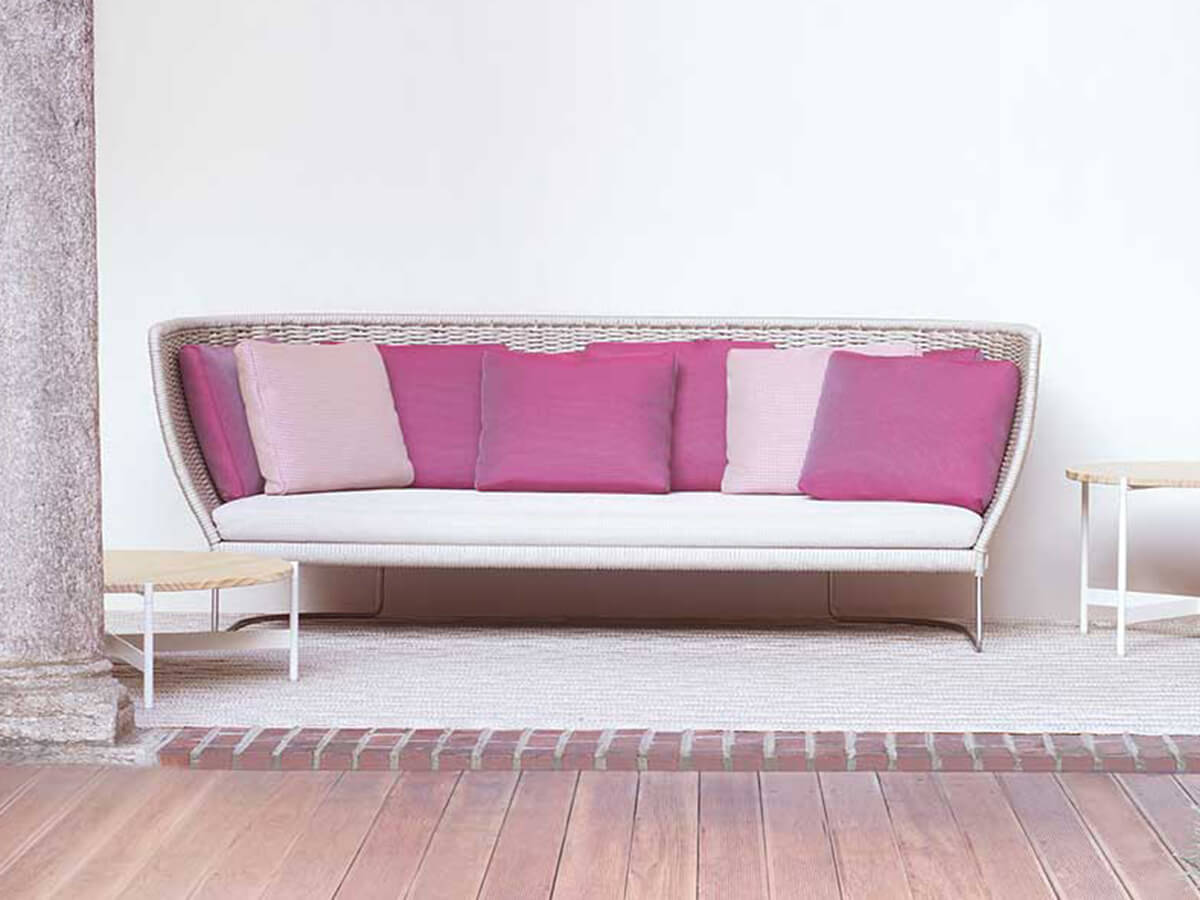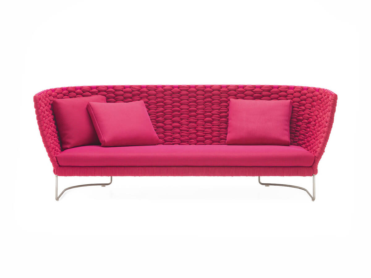 Ami is an outdoor sofa by Paola Lenti, designed to be placed outdoors and in large areas such as gardens, balconies, sun terraces and more. The Ami series to which it belongs also includes chair, table armchair and armchair. The base is made of matt painted stainless steel in different colors. The upholstery of the structure is fixed, hand-woven in Chain tubular knit padded in polyester. The tips are in plastic material. Paola Lenti's strength is manifested here in the vast range of colors available for both the seat and the cushions; an assortment of extreme beauty and originality capable of best expressing the potential of this upholstery.