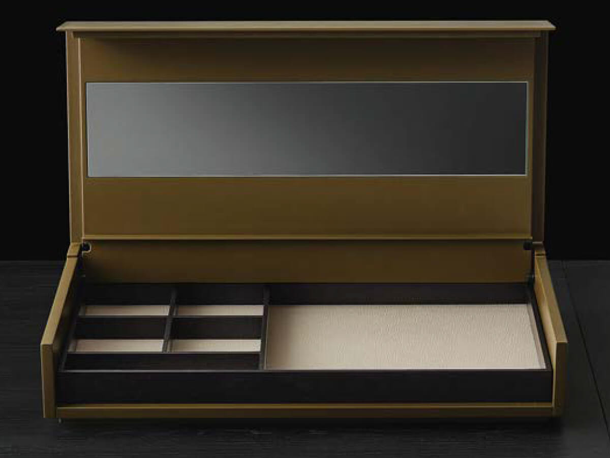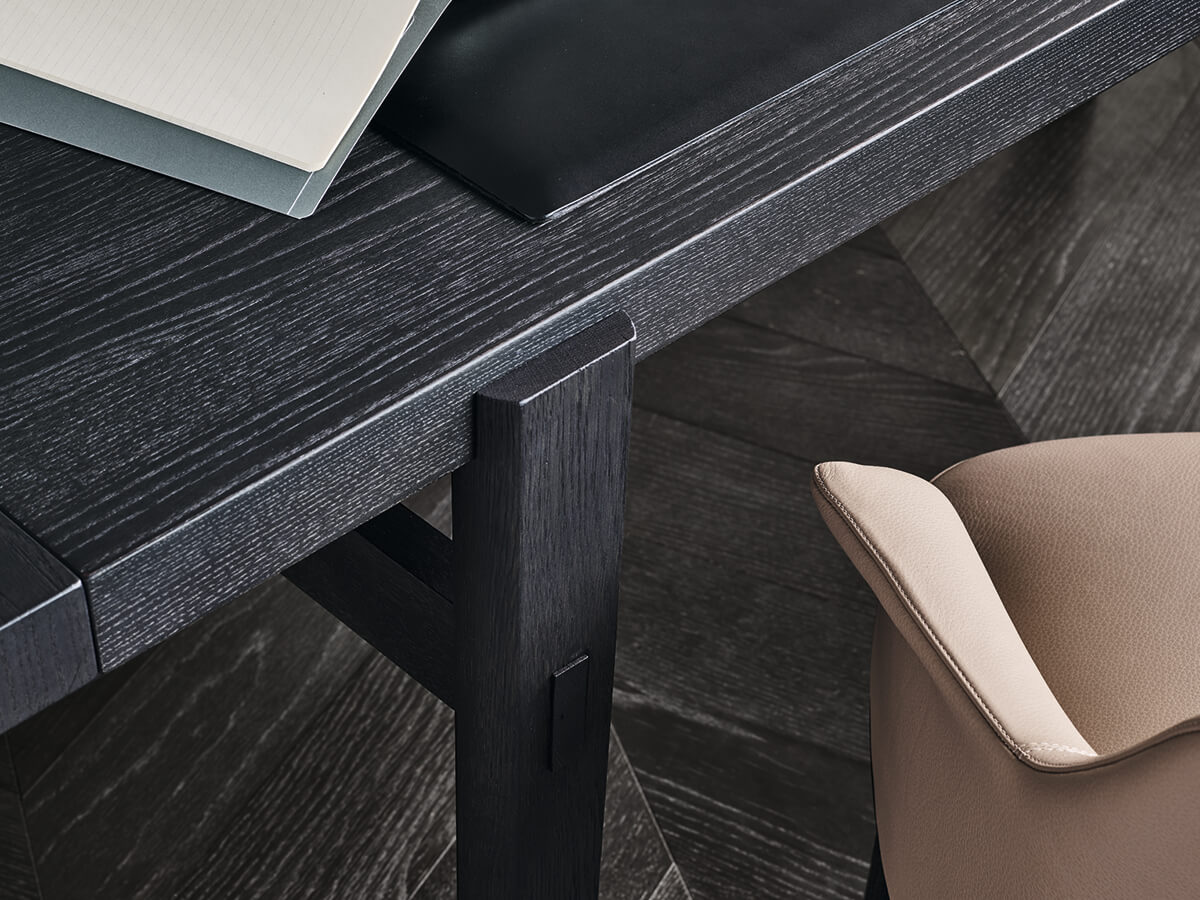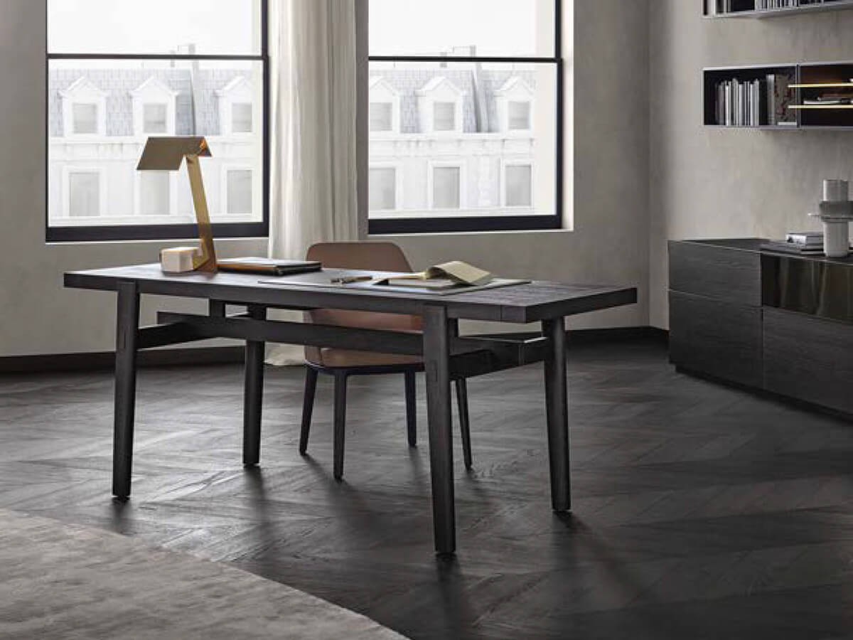 The Home Hotel collection by Jean-Marie Massaud offers a sophisticated, elegant and luxury model of home, where the centrality of clean lines and no excesses create an organic whole of evocative beauty. From tables to coffee tables, then moving on to benches and sideboards; each element is studied in a workmanlike manner to offer unique compositions. The writing desk produced by Poliform stands out for the same artistic touch aimed at enhancing the clean line of solid wood to which a veneered wood top is added. The characteristic covered solid wood strips, present in all the elements of the collection, increase the stability of the structure as well as giving the impression of formal rigour.* Technical features: structure and top in black elm