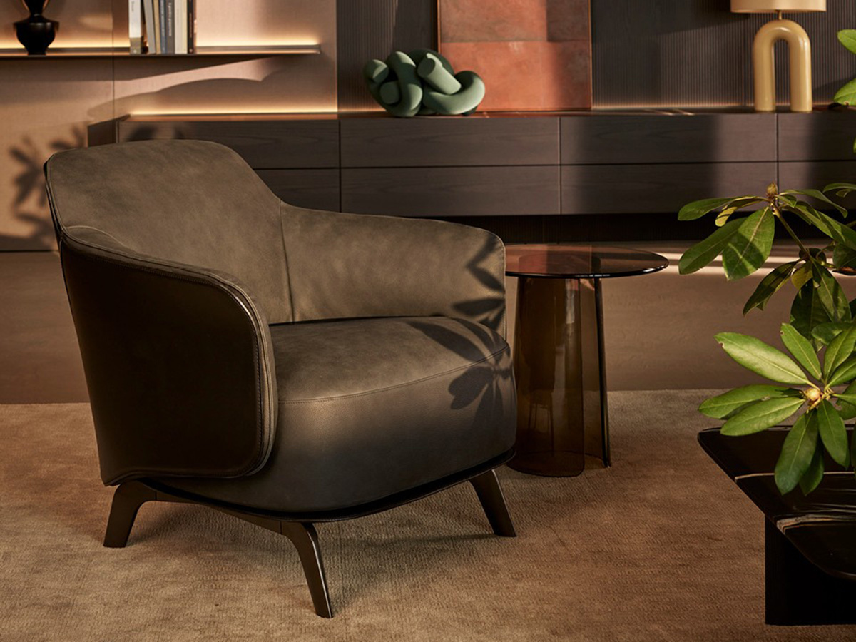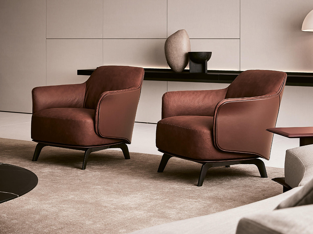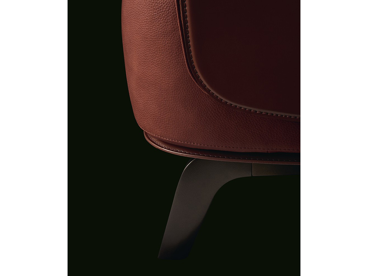 Poliform meets the style of Jean-Marie Massaud, creating an armchair with a soft and sophisticated taste, where the sober lines of the brand's collections live with a completely new lightness, perfect to reconcile with contemporary tastes. The Kaori armchair has a strong architectural connotation, with generous volumes which significantly increase its comfort. It has two perfectly integrated shells, an external one in leather and an internal one padded and covered in fabric or leather. The feet are made of aluminum to support the solid structure in matt painted steel, shiny brown nickel or champagne. Overall, Kaori fits perfectly in living environments such as living rooms but also in more sheltered areas of the bedroom or even studies and receptions.