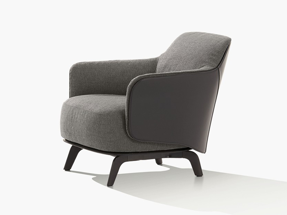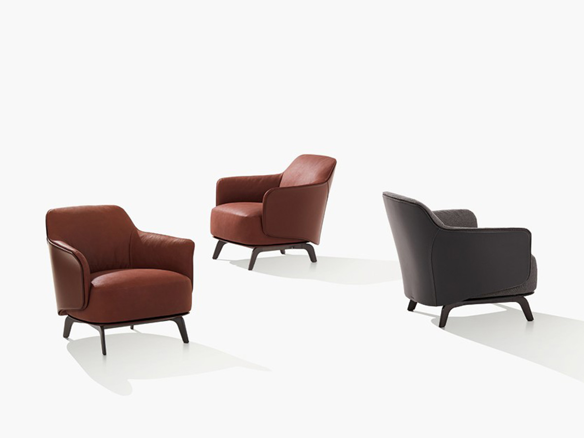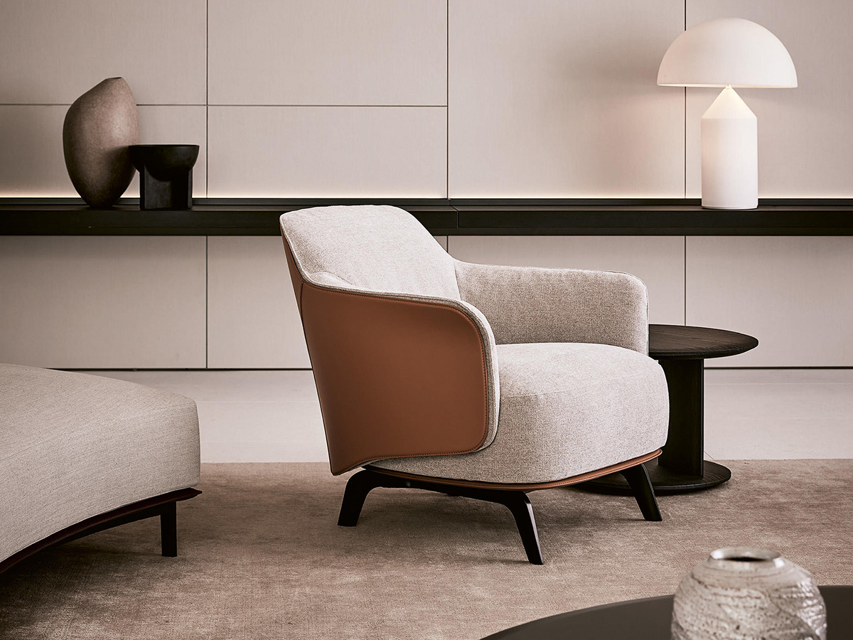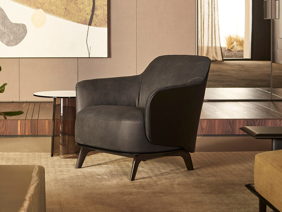 Poliform meets the style of Jean-Marie Massaud, creating an armchair with a soft and sophisticated taste, where the sober lines of the brand's collections live with a completely new lightness, perfect to reconcile with contemporary tastes. The Kaori armchair has a strong architectural connotation, with generous volumes which significantly increase its comfort. It has two perfectly integrated shells, an external one in leather and an internal one padded and covered in fabric or leather. The feet are made of aluminum to support the solid structure in matt painted steel, shiny brown nickel or champagne. Overall, Kaori fits perfectly in living environments such as living rooms but also in more sheltered areas of the bedroom or even studies and receptions.