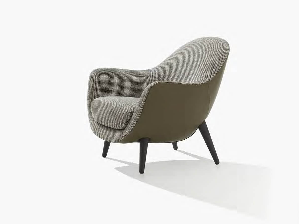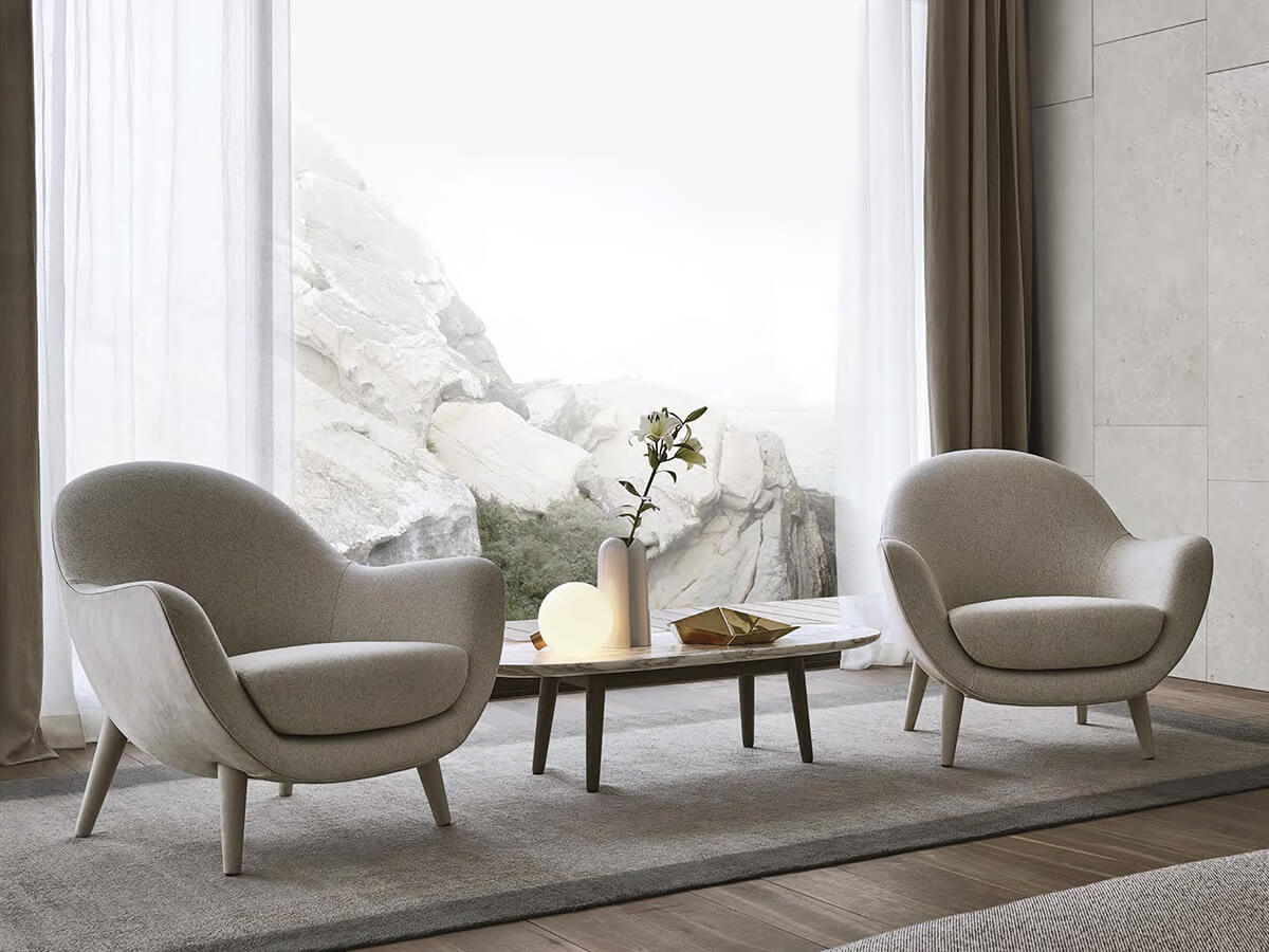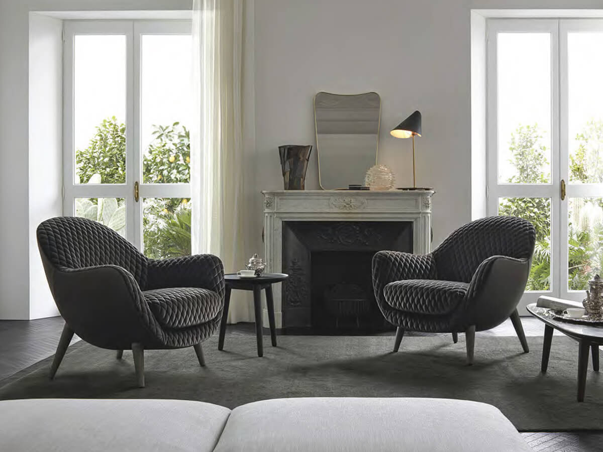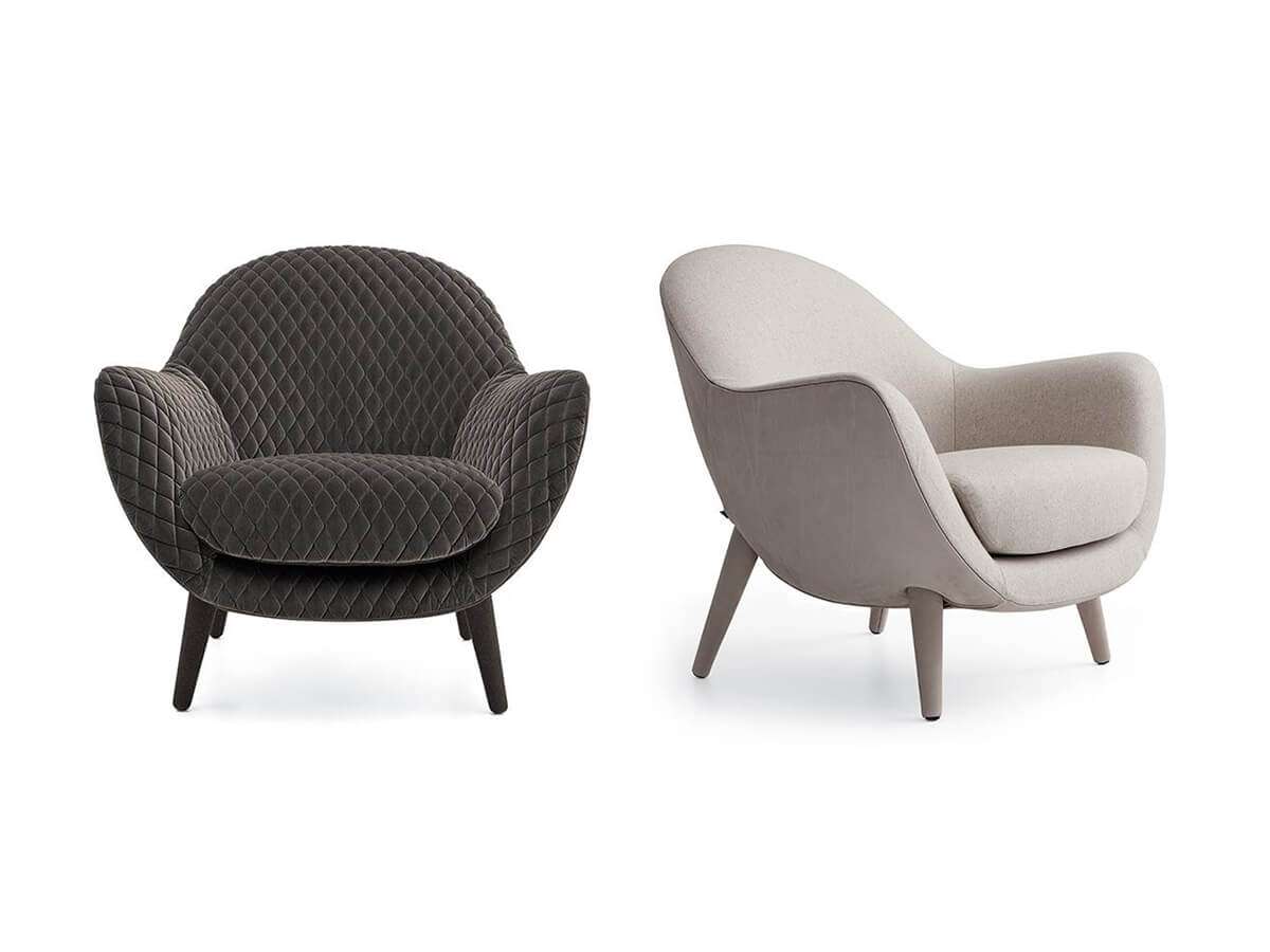 The Mad collection by Poliform includes numerous furnishing elements for the home, ranging from the living area to the night area in a complete assortment of proposals. We mention here tables, coffee tables, sideboards, ottomans and chairs. Each of these works differs for a distinctly eclectic taste, capable of satisfying the most heterogeneous requests. Mad Queen and Mad King are, as the name suggests, two armchairs linked together by a subtle game of roles that sees for the first a lower back and for the second a higher one, as was used in the royal high chairs. However, both retain an elegant and symmetrical appearance, enriched for the Mad King by a precious wooden tray that can be used for storing small objects. The Mad Queen, on the other hand, is more contained, has a protective covering of the legs covered by fabric or leather depending on the taste.