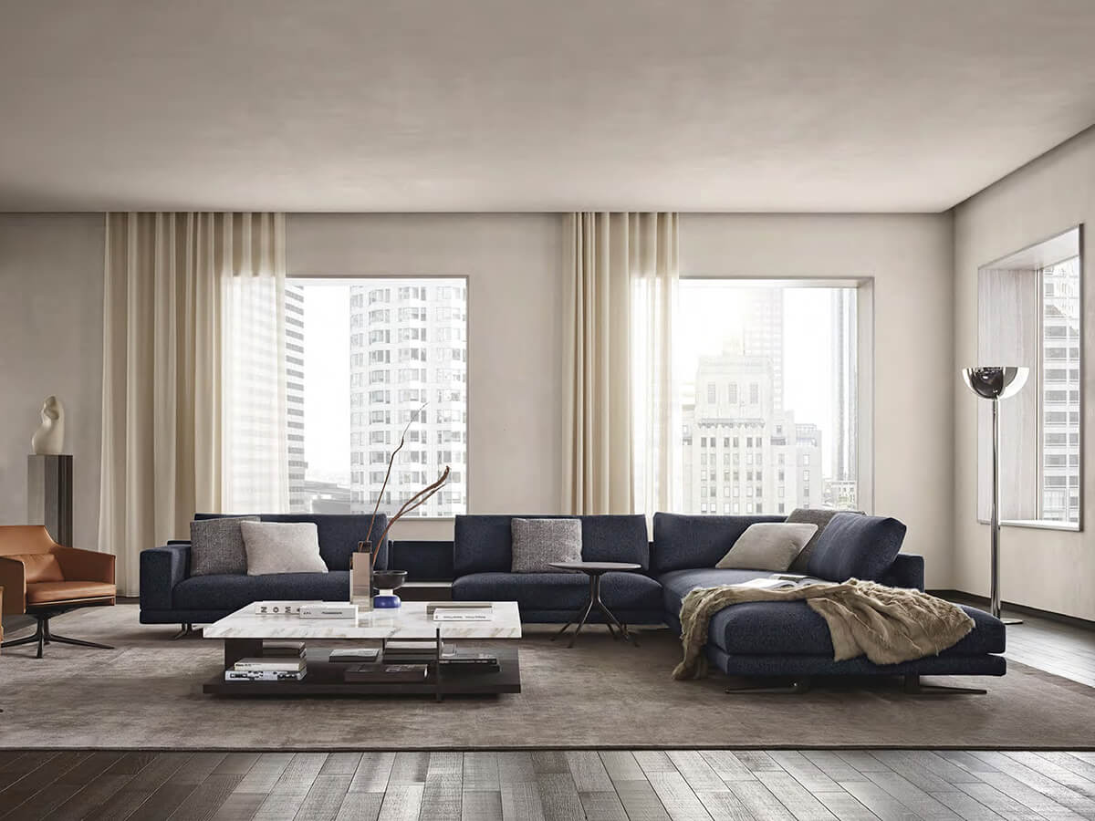 Mondrian fully expresses the concept of compositional freedom, lending itself to a thousand possibilities and combinations according to taste, as well as the needs of those who will use it. An extremely minimal suspended structure is combined with numerous accessory elements, from cushions of various sizes to armrests and backrests also available in wood and equipped with shelves. Poliform proposes it as the definitive solution for the contemporary living area, expressing a light and sophisticated way of furnishing that does not neglect attention to everyday life. Numerous leather and fabric upholstery guarantees a further range of choice. Among the numerous combinations, Mondrian allows you to create linear, corner sofas, with peninsula, chaise longue and more.