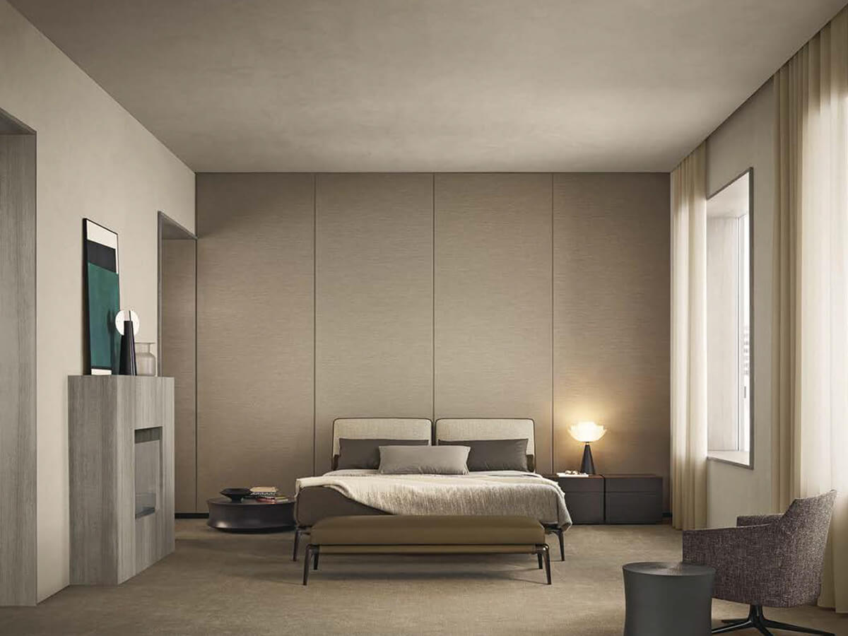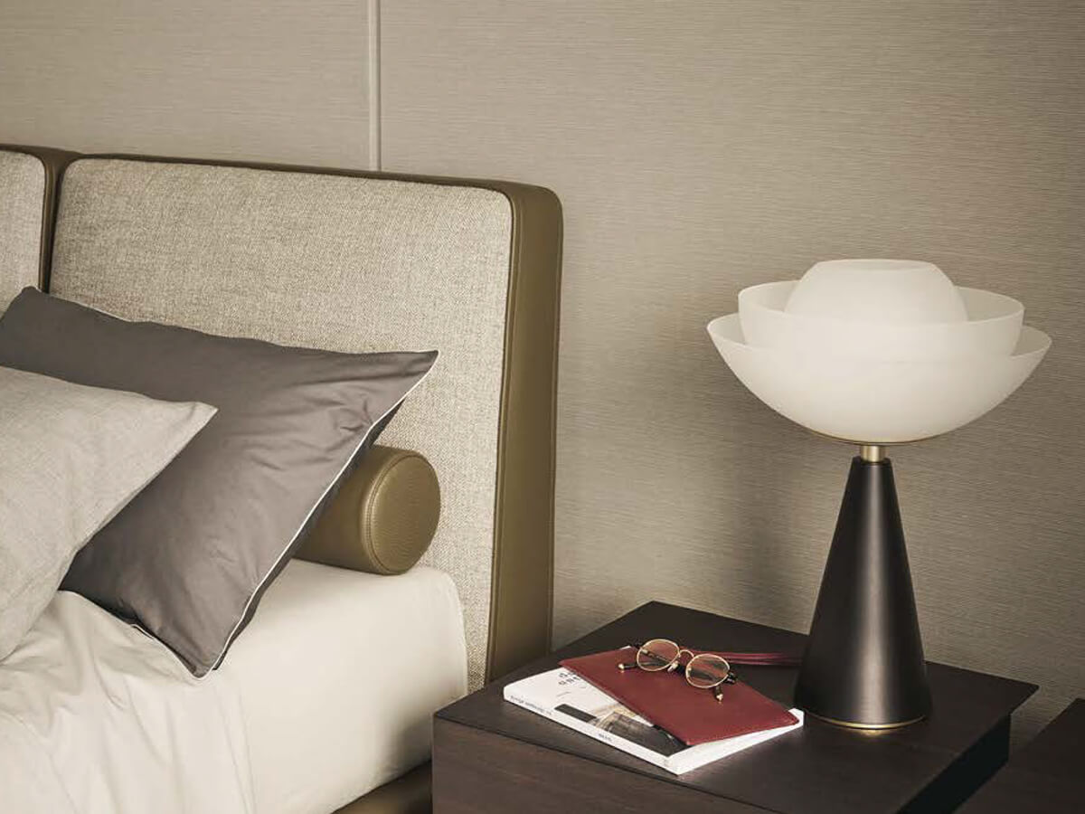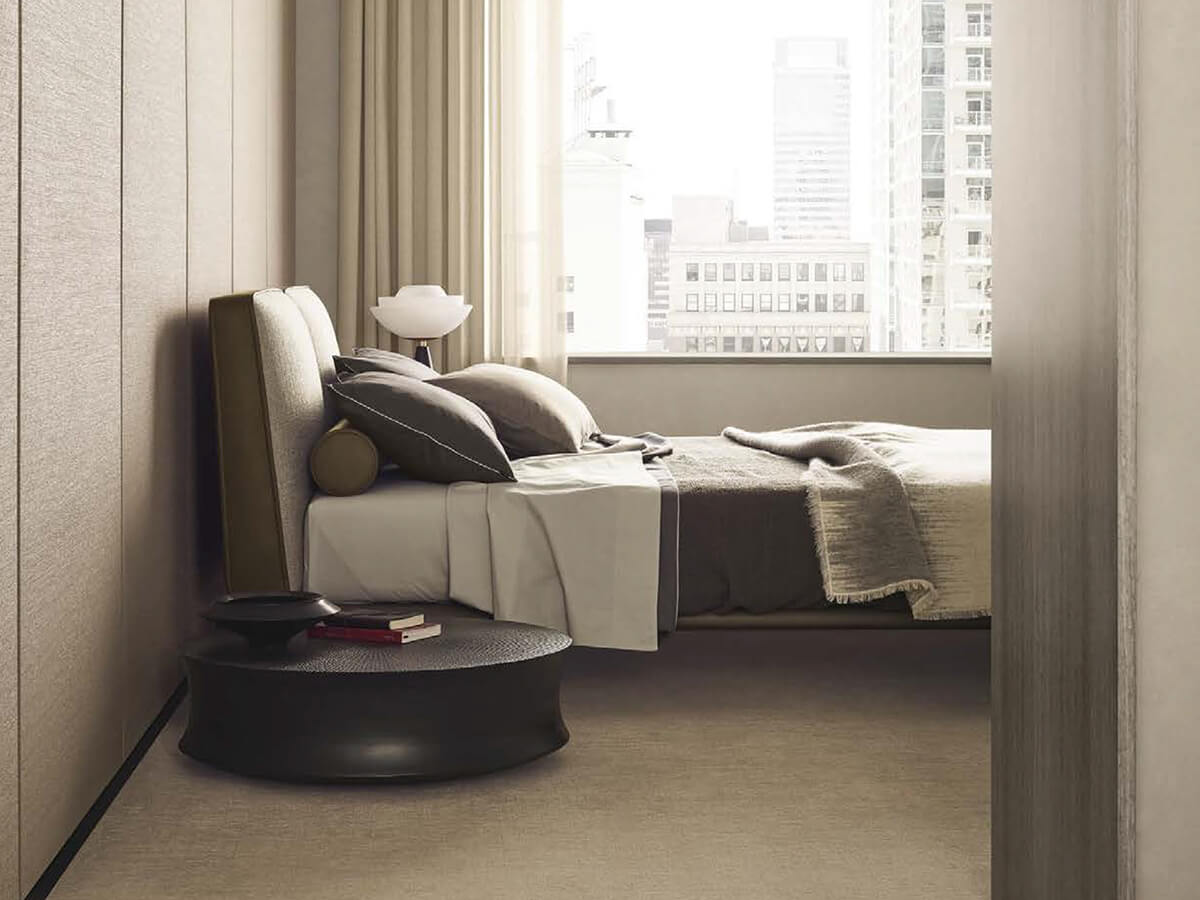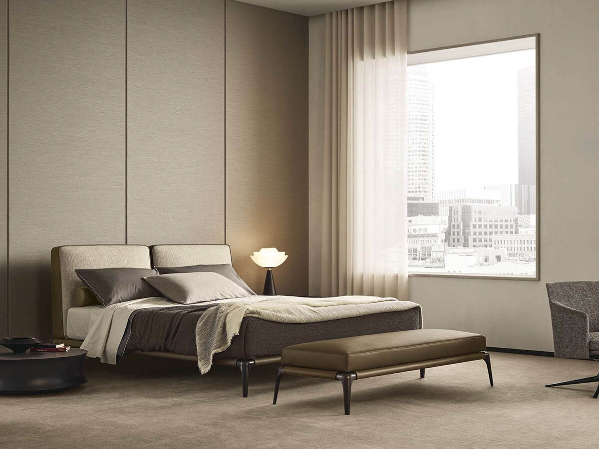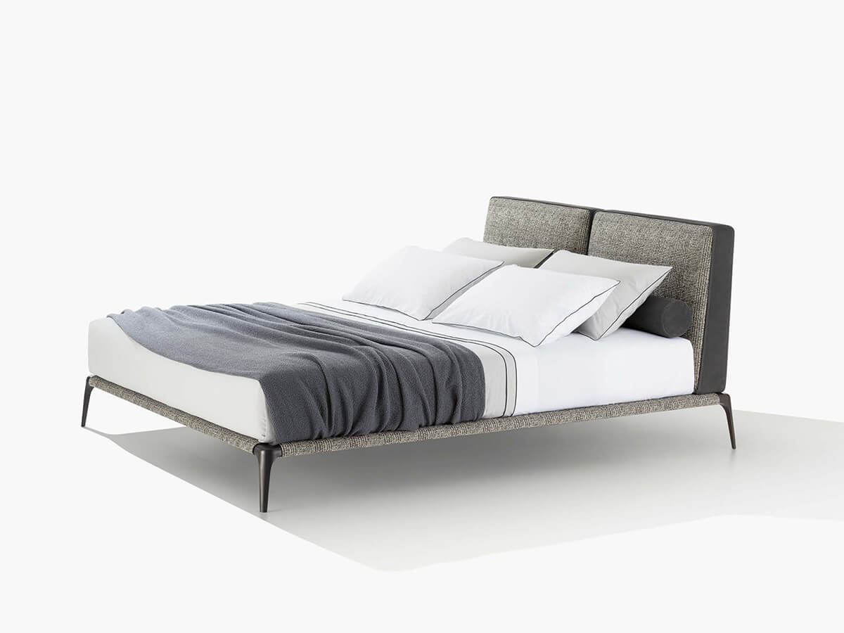 From the homonymous Park, Poliform proposes the Park 1 bed, a new version that joins the first to integrate and at the same time give new impetus to the collection. Convenience, comfort and lightness are intertwined in this piece of furniture thanks to the stark contrast with the large padded headboard and thin aluminium feet. These two elements form a balance of extreme beauty. The base structure is in painted aluminium with pre-covering in polyester fiber and removable fabric or leather cover. The headboard is made of flexible molded polyurethane with pre-covering in polyester fiber and the covering itself is removable. The numerous finishes, sizes and colors available make Park 1 an extremely customizable bed, suitable for any type of style and taste.*Technical features: feet available in glossy or matt brown nickel