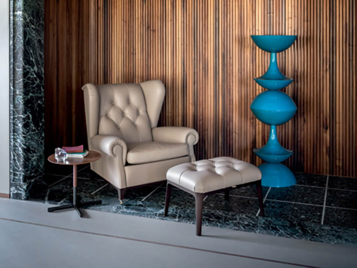 Among the numerous furnishing proposals, Poltrona Frau never fails to include a touch of classicism, a reference to tradition that is well suited to elegant contexts and more modern suggestions. The 1919 armchair is a worthy representative of this trend. Born from the Renzo Frau project, it is one of the first successes of the company thanks to its strongly evocative lines that are inspired by the classic bergère model. The capitonné workmanship adds luster and elegance to the structure as a whole, also peculiar for the addition of a particular extension for the support of the feet and a small optional arm lectern, intended to support small everyday objects.* Technical features: 2019 version: metal parts finish in gold or gunmetal finish