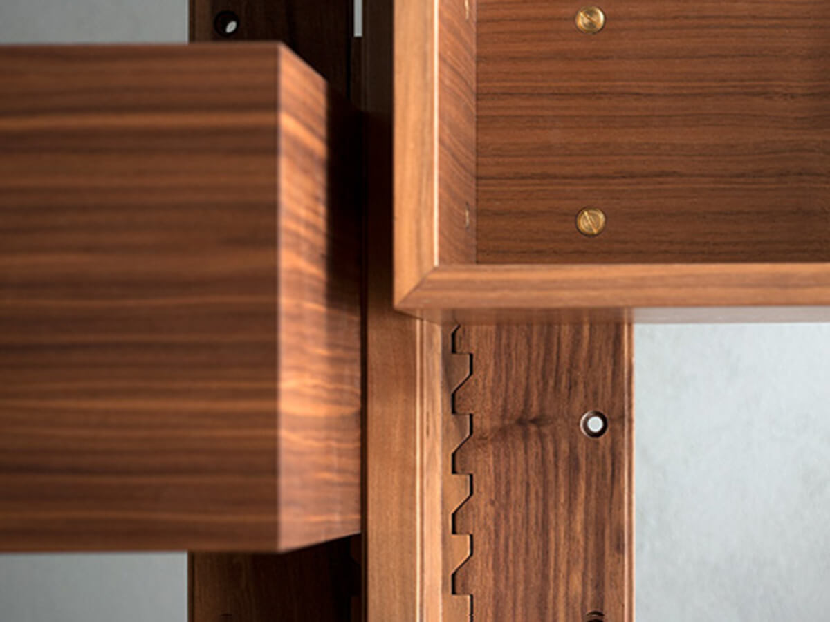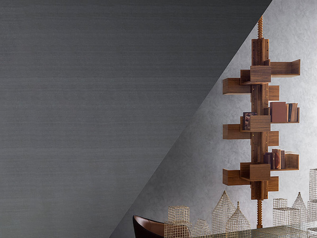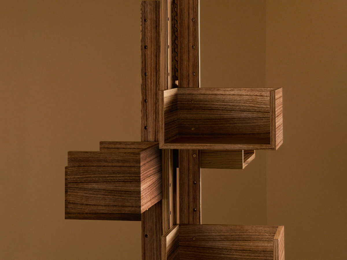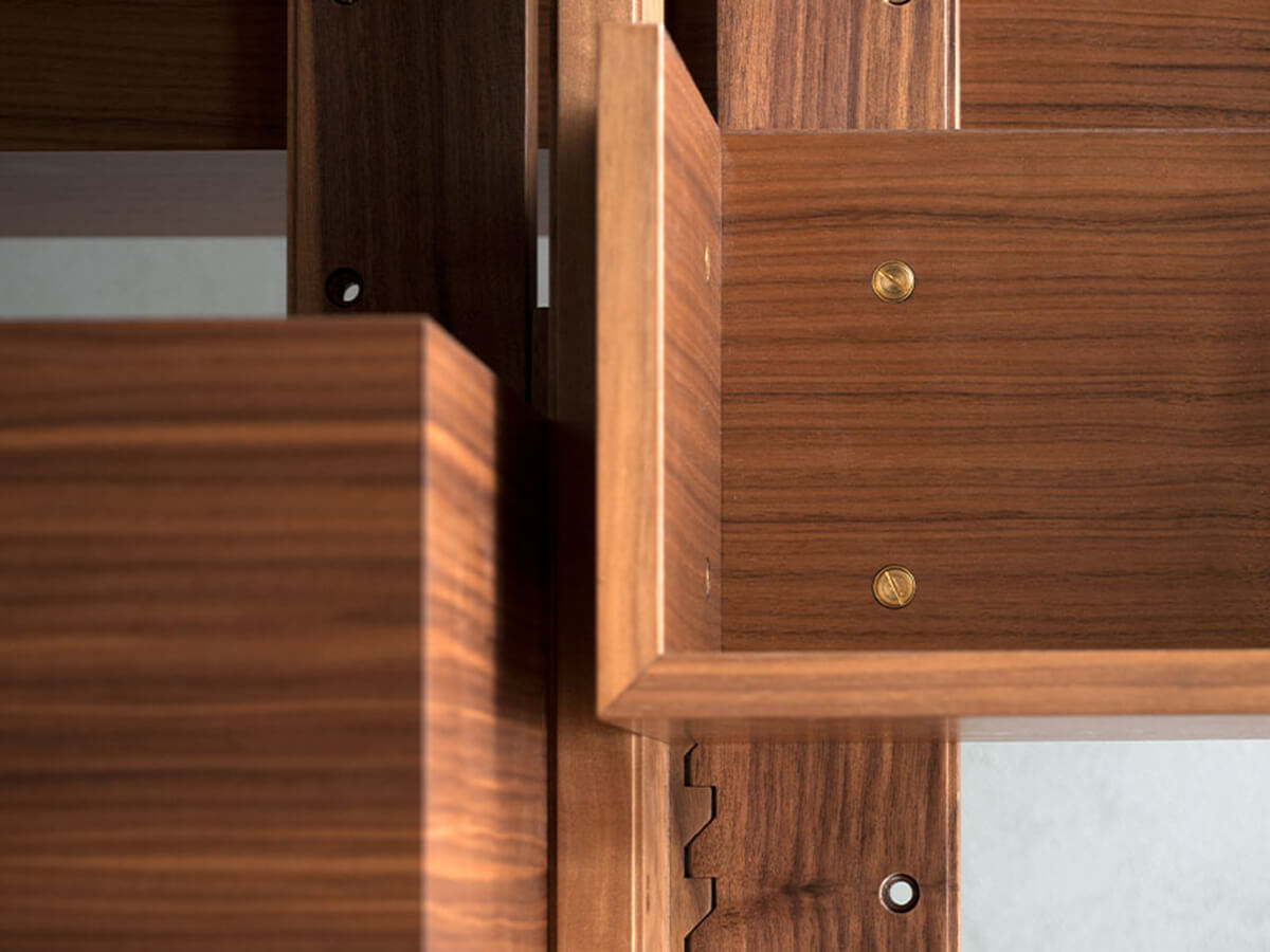 Gianfranco Frattini imagines this "floor-to-ceiling" center bookcase for indoor use rather than for mass production. Strongly linked to the neo-liberty period, Albero is a work that celebrates elegance and form, as well as a real tribute to art in its purest form. The structure is characterized by the high cabinet-making work carried out in all its parts, as well as by the sculptural choice of each element within the space. The load-bearing structure is in solid wood and consists of two toothed pillars with a special rack joint, joined to four vertical uprights with holes that allow for any assembly of eight or twelve shelves.