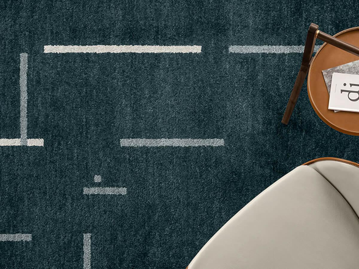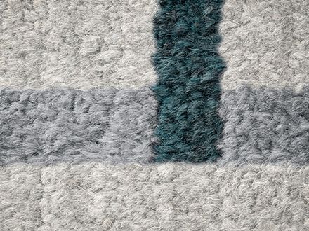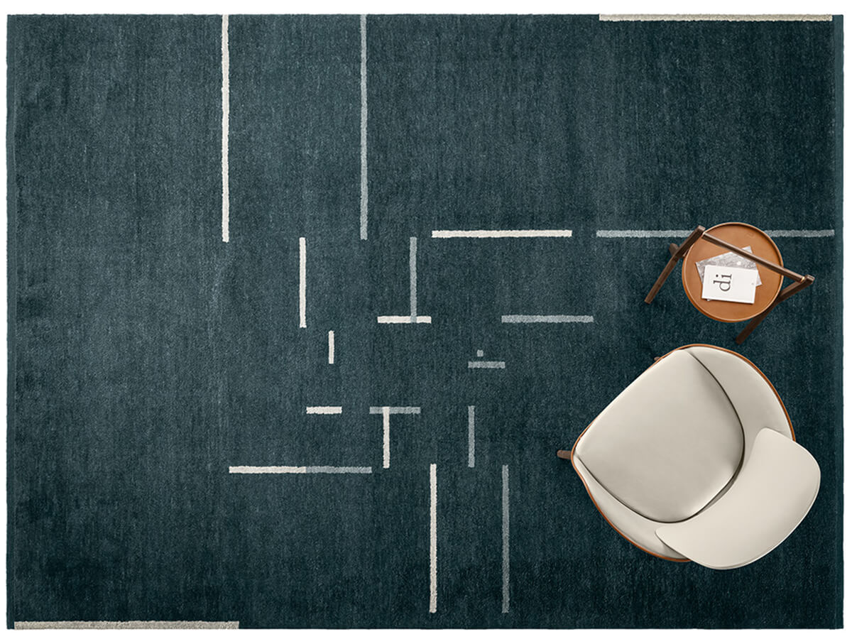 Dizzy, together with Billie, is part of a collection of carpets aimed at paying homage to the famous Swiss graphic artist Max Huber. The design shown here comes from the archive selection of his many unpublished works on paper. The original designs have remained unchanged in the proportions and thicknesses of the lines, simply adapted to the dimensions of the carpets that become canvas exactly like the paintings in a gallery. Dizzy refers to a design characterized by a series of cadenced lines, with a rhythm that symbolically recalls Dizzy Gillespie, one of the inventors of bebop and modern jazz. Dizzy is made entirely by hand on wooden looms with a Persian knot tying technique that provides a long-haired coat.