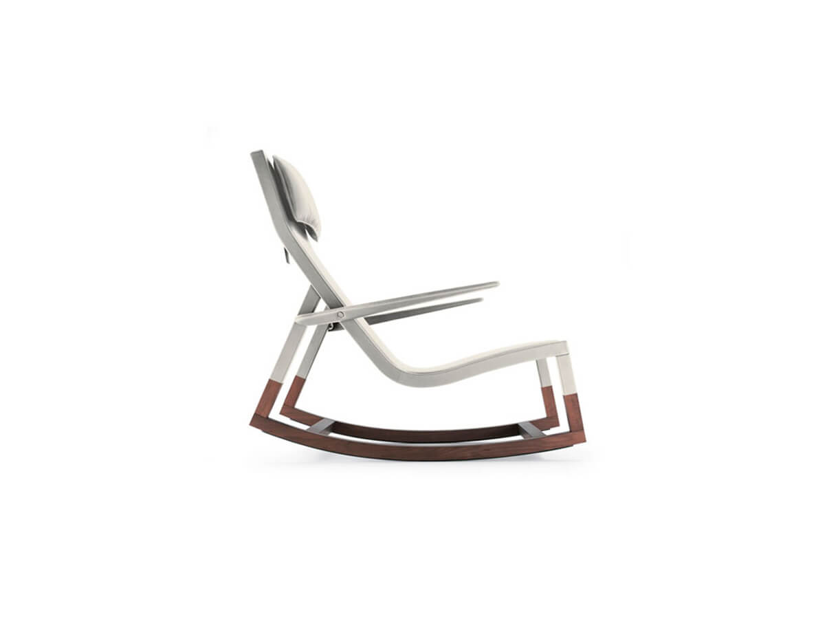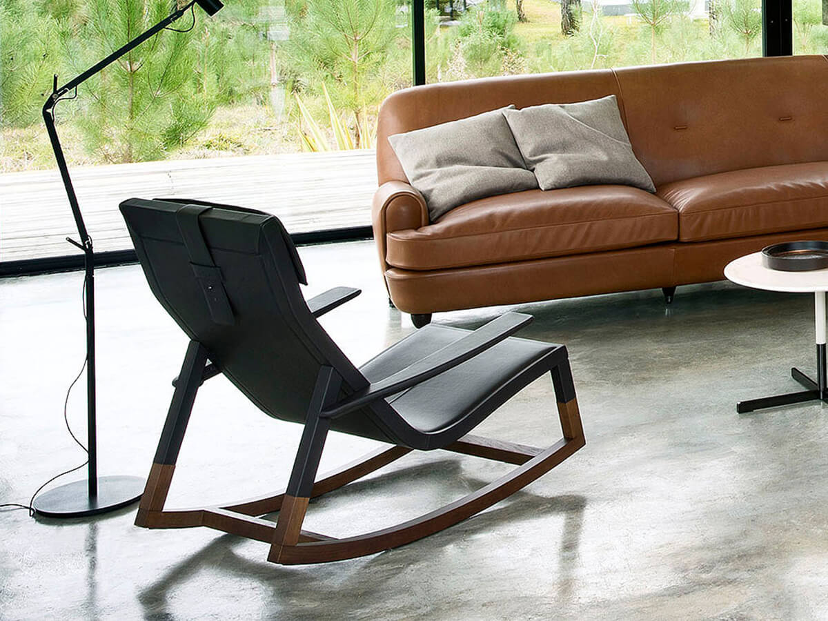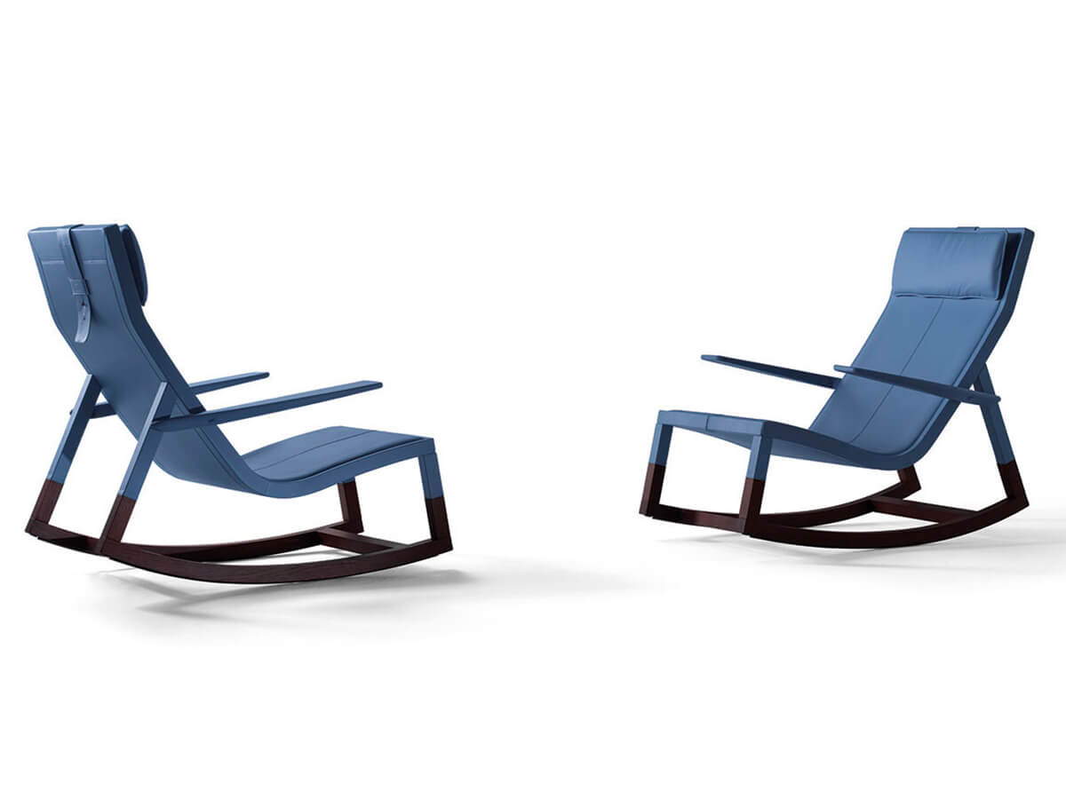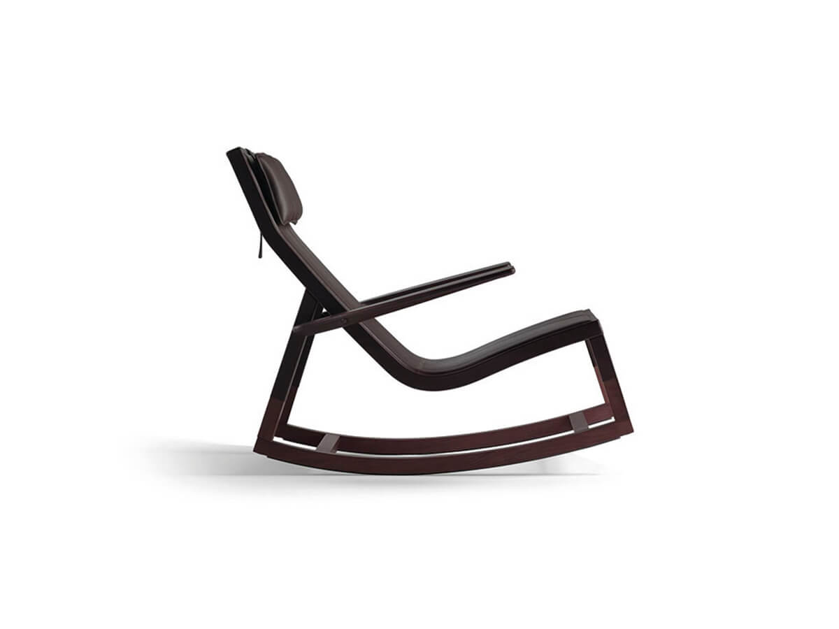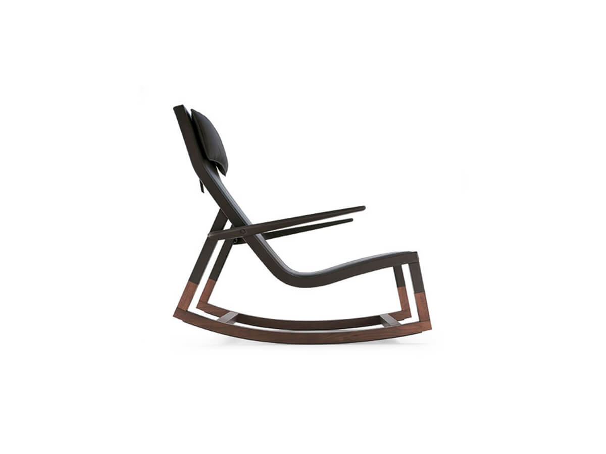 Don’Do is Poltrona Frau's first rocking chair, a contemporary reinterpretation of a classic piece that sums up elegance and comfort. Jean-Marie Massaud designs it giving it two distinct souls: the first gometric and rational, the second extremely comfortable and devoted to relaxation. The quality of the initial project was taken by Poltrona Frau and enhanced thanks to the use of old and new techniques, combined with the choice of high-end materials. The resulting balance is unmistakable. The body and armrests of the Don’Do rocking chair are made of rigid polyurethane and reinforced with a metal insert. The feet are in steam-bent solid oak, with an antique walnut effect finish. The leather upholstery is the final touch for this functional and multi-faceted piece of furniture.