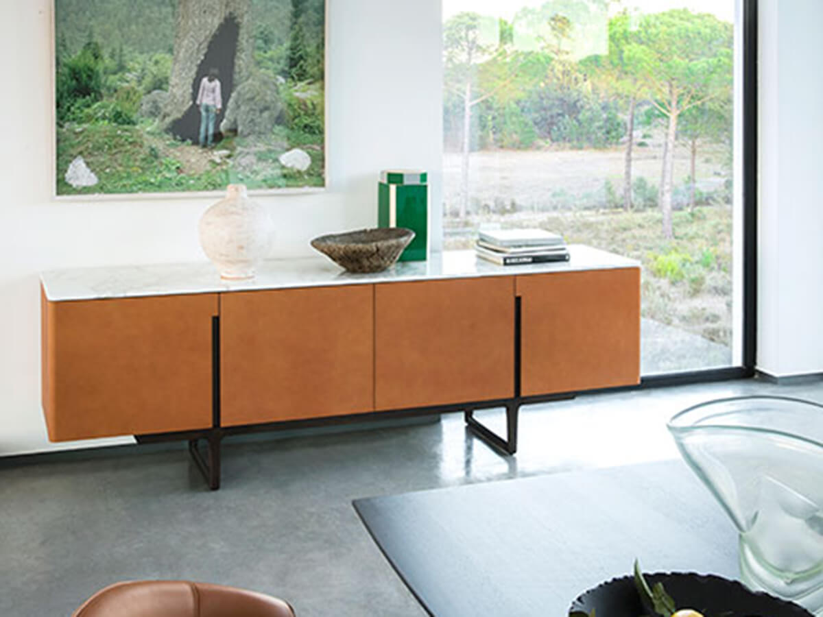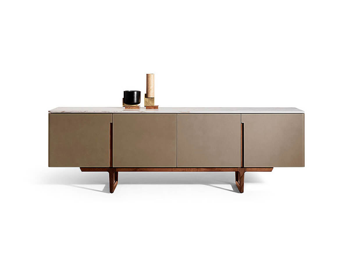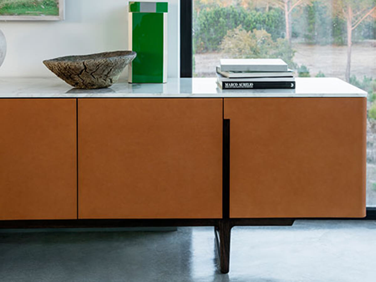 The Fidelio collection by Roberto Lazzeroni presents numerous proposals for the bedroom, ranging from bedside tables to dressers to meet every need for everyday use. However, a new sideboard proposal also contributes to enriching the living area, giving a personal contribution to the space generally used most during the day. Clean lines, warm materials and precious finishes are the founding elements of this sideboard whose volumes seem perfectly calibrated in the name of lightness. A versatile element, ideal for storing objects but also to create a focal point in the living area. The use of Pelle Frau® leather is important here to embellish surfaces.* Technical features: stitching available tone on tone or in contrast; internal containers in extra-clear natural maple