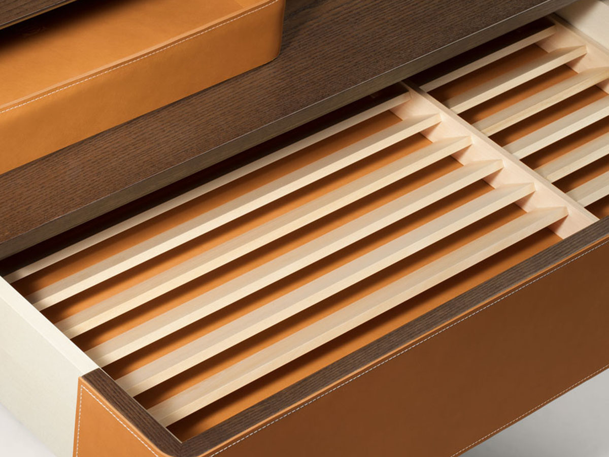 *Price valid for the Multimedia version with base in moka stained ashwood – top in moka stained ashwood – back side in moka stained ashwood – upholstery for sides and drawers’ frontals in saddle leather – with arrangement for cable-passing – trays and inner organizers excluded (cod. 5599790 - 5PF0059907187).