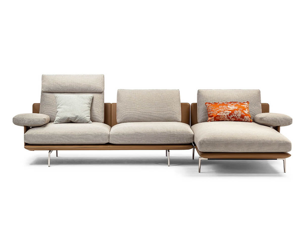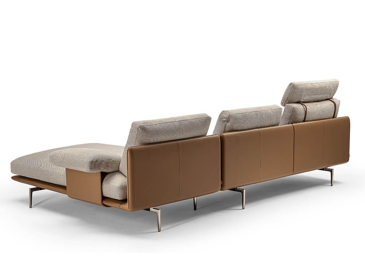 A new homage to the timeless Beatles classics inspired this Get Back seating system. The name itself suggests the intent to create a return to comfort, to a welcoming space created to measure where you can feel at home, Generous, wide and open lines are the foundations for this upholstery, to which inclined backrests are added for a better feeling of comfort. . Get Back offers two different types of armrests, numerous accessory elements and multiple finishes to play with to give life to the model that best suits your personality and aesthetic sense. Tapered aluminium feet lighten the structure, offering a feeling of sobriety and aesthetic refinement.* Technical features: feet available in ruthenium or burnished sandblasted aluminium
