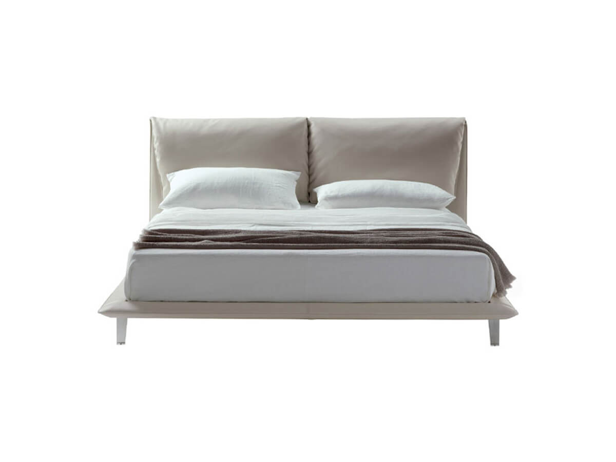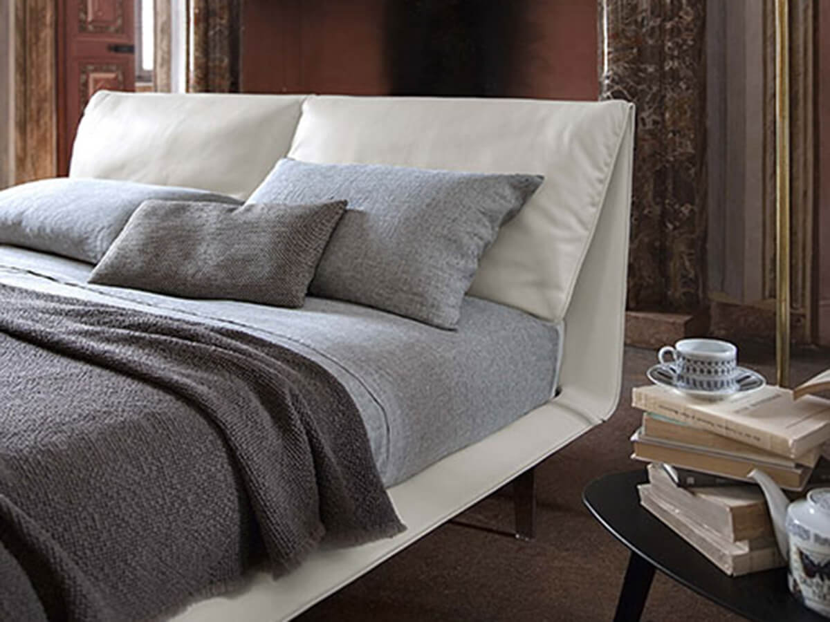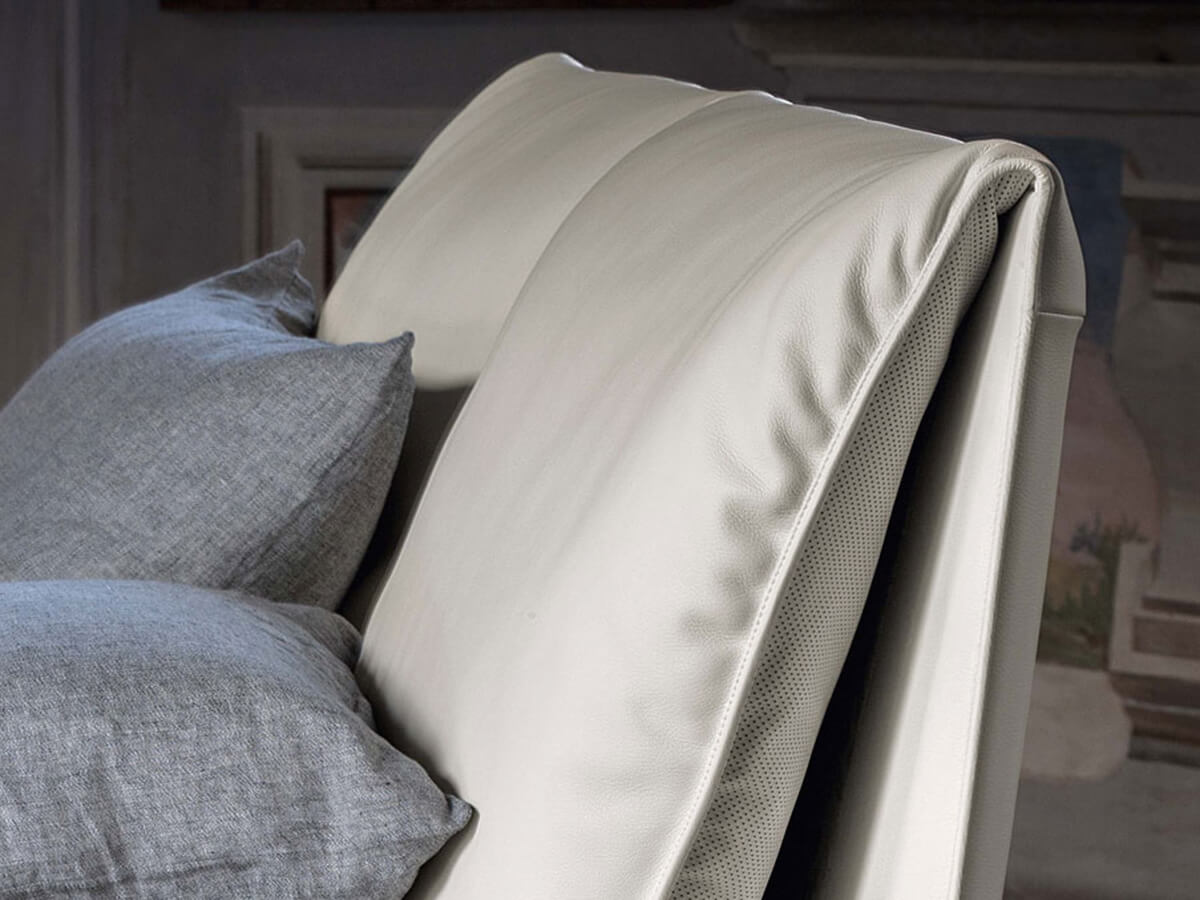 John-John is a bed with a great personality whose natural and elegant lines can be translated into an effective design in any context, from the most to the least sophisticated. The two large and comfortable cushions of the headboard seem to evoke the characteristic back of a sofa, ideal both during the hours of rest and while reading in a seated position. The delicate plays of leather obtained thanks to the craftsmanship enhance the tactical sensations of John-John, distinctive elements of the model as a whole. The headboard is in solid wood, the cushions are padded with goose down and polyester wadding, connected to the lard by means of the practical Pelle Frau® upholstery* Technical features: slat kit available in rigid version or in version with lumbar adjustment