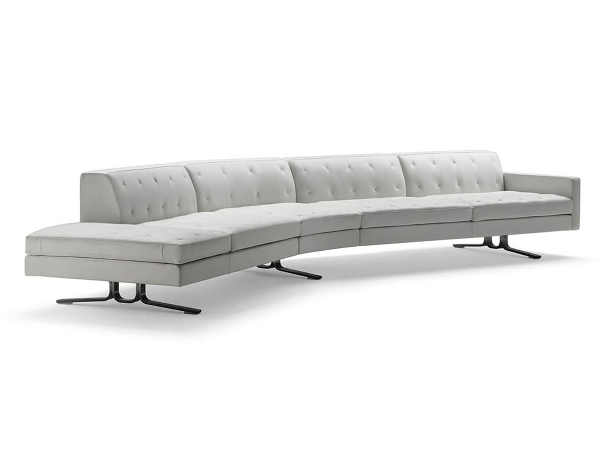 Kennedee is a modular sofa that offers multiple furnishing solutions for the living space, although it can also be perfectly placed in bedrooms and more. The numerous modules available allow linear, angular and curved configurations. The dynamic lines, dry and free of unnecessary frills make it a versatile, wide-ranging element, which does not weigh down but enhances the surrounding environment. Kennedee's distinctive quilting differentiates and embellishes it, enhancing the contrasting stitching and the craftsmanship performed on each model. The solid beech frame gives solidity and resistance, softened by the padding of the back, armrests, cushions and poufs. The springing is obtained with elastic belts.