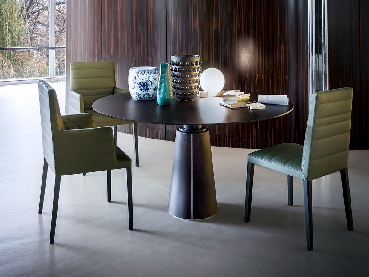 Mesa is a true icon of purity of form. Designed in 1985 by Lella and Massimo Vignelli, it remains today one of the most successful proposals of the Poltrona Frau brand thanks to the combination of two simple geometric shapes: the circle and the cone. The result stands out and adapts to different types of environment, suggesting an extraordinary versatility. The mesa slate top is characterized by the traditional splitting process that keeps wrinkles and natural veins on the surface. The undertop in burnished steel sheet supports this structure supported by the supporting column in stone. Elegant and practical, it is the ideal object for living spaces or common areas.