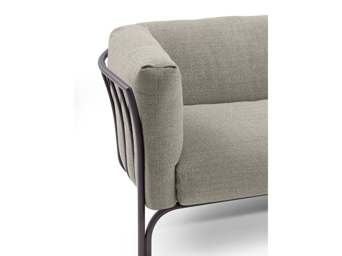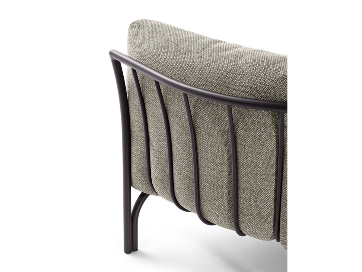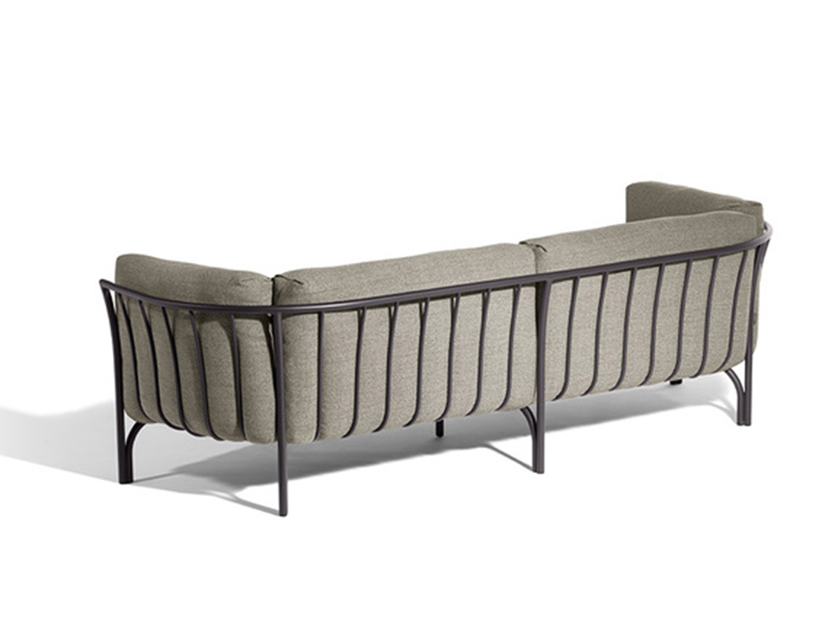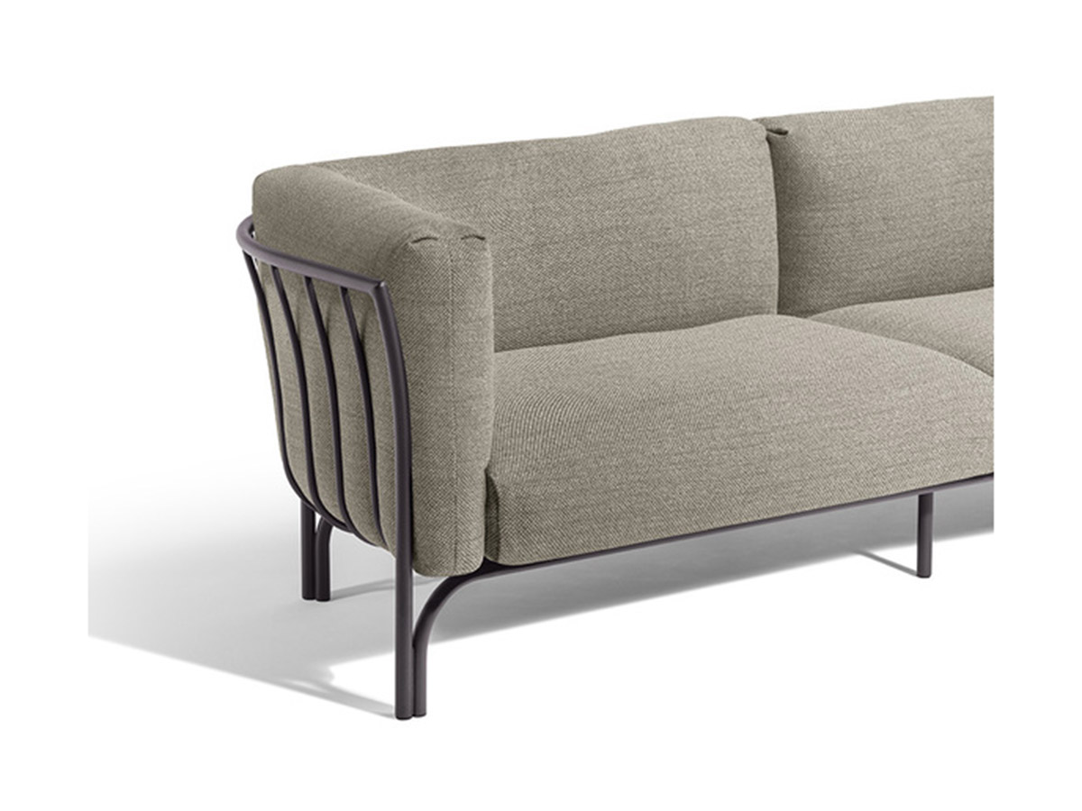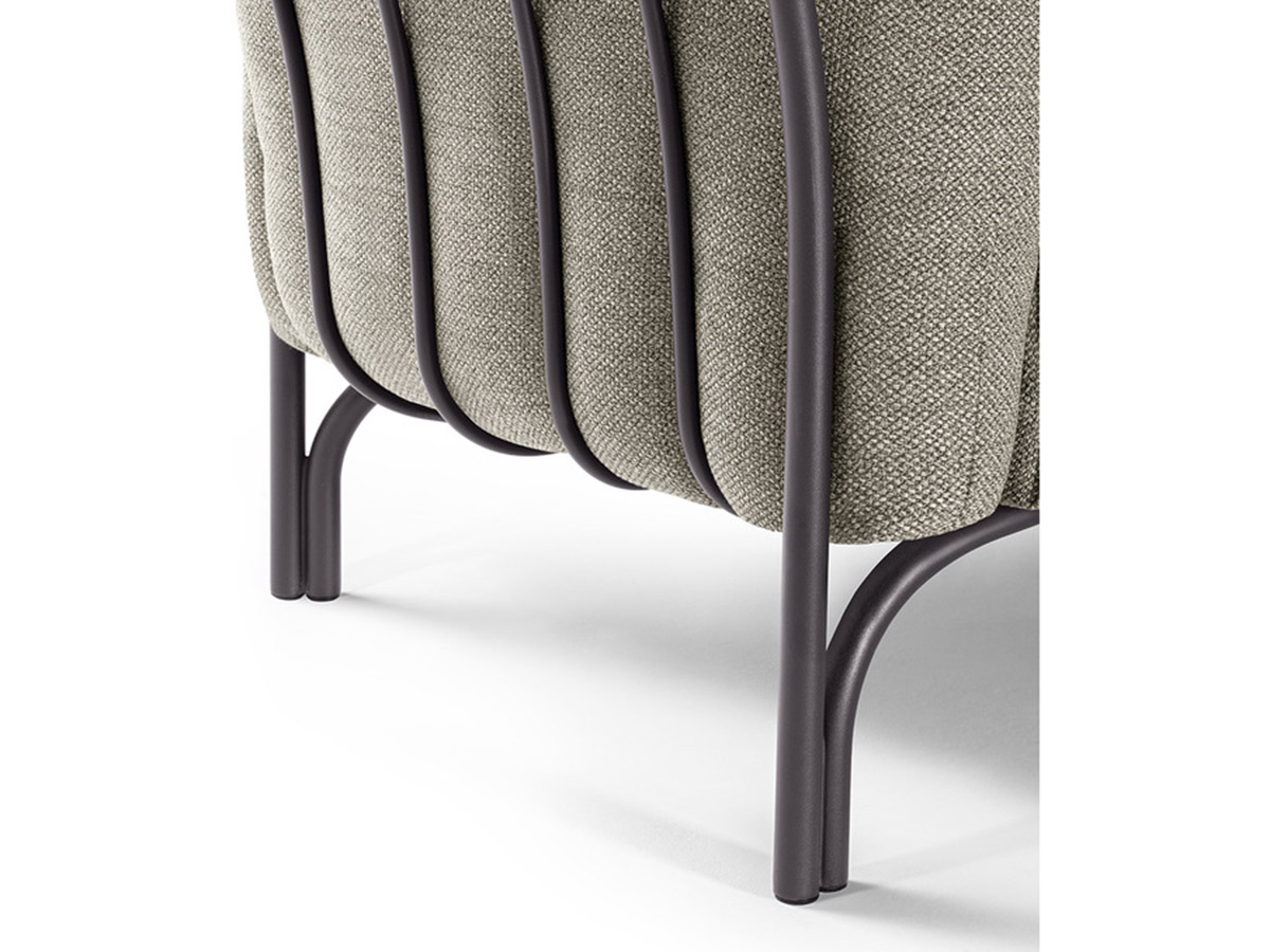 The Mirabell outdoor sofa features an elegant and enveloping structure in powder-coated aluminum, with an embossed finish. This structure is particularly light and easy to move, so as to facilitate the creation of organic environments in gardens, terraces, poolsides and more. The cushions placed inside this structure are made of draining material so as to withstand sudden rain without being ruined or causing water to stagnate. Overall, the upholstery can be completely removable and is also available in Pelle Frau in the special Outdoor version. The sizes are also customizable, so as to create one-of-a-kind compositions.