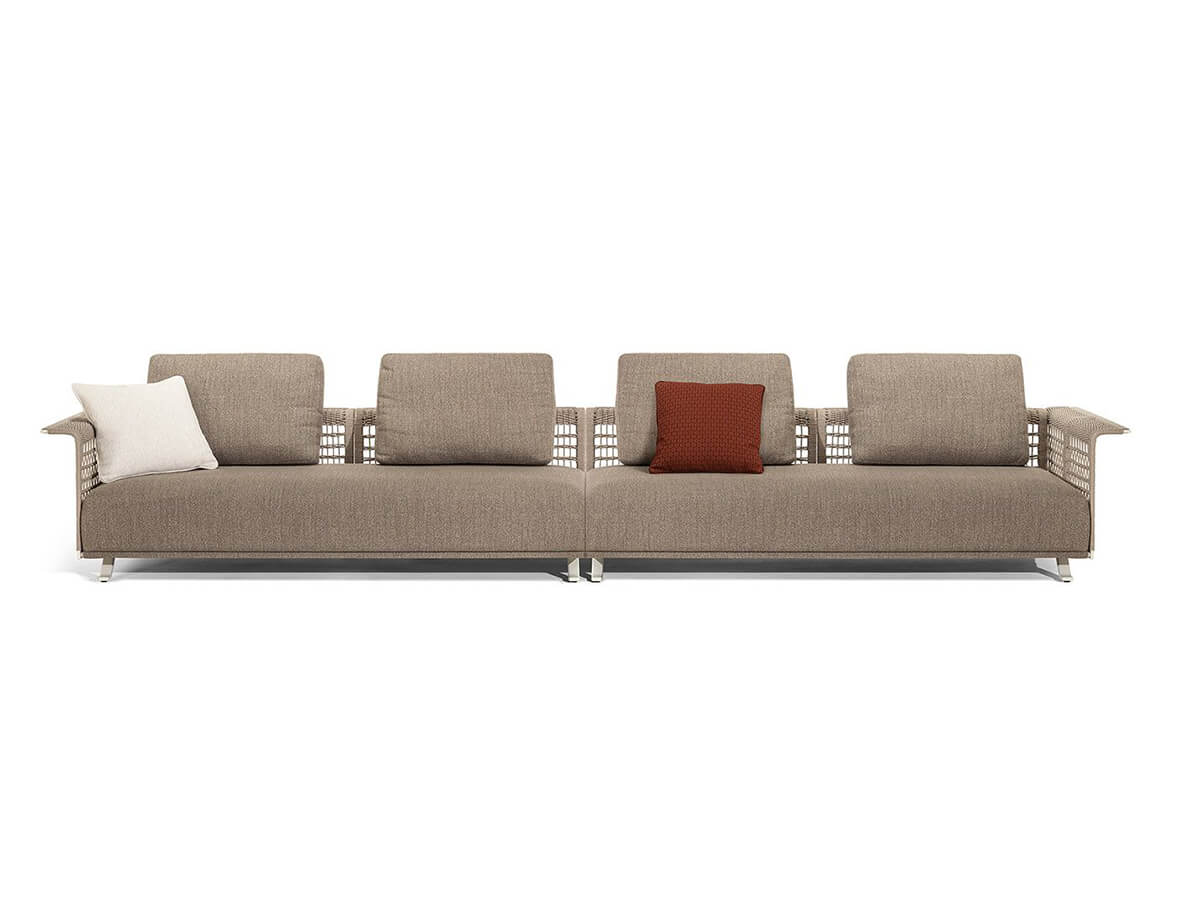 The designers Ludovica and Roberto Palomba designed a seating system for Poltrona Frau from modular exterior in multiple configurations: linear, corner or island thanks to the possibility to insert backrests, armrests, corner and end elements with great fluidity. The steel structure powder-coated stainless steel with a chalk-colored finish is supported by thin feet while armrests and back are covered with an artisanal rope weaving that alternates full and empty spaces with a beautiful aesthetic effect. The padding is covered in soft and refined fabrics suitable for outdoor use and packaged with precautions to facilitate water drainage. The multifaceted Solaria sofa furnishes and defines the spaces of gardens, patios, poolside and terraces with the typical elegance of Italian design.