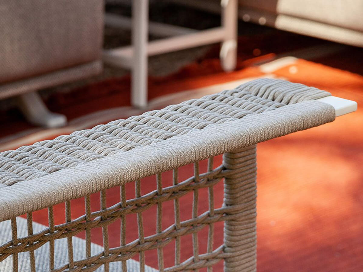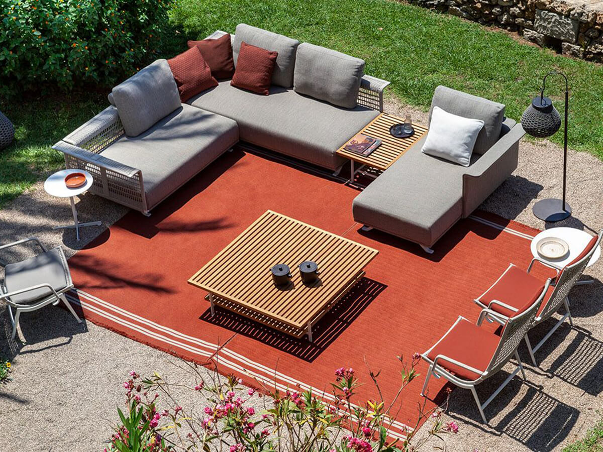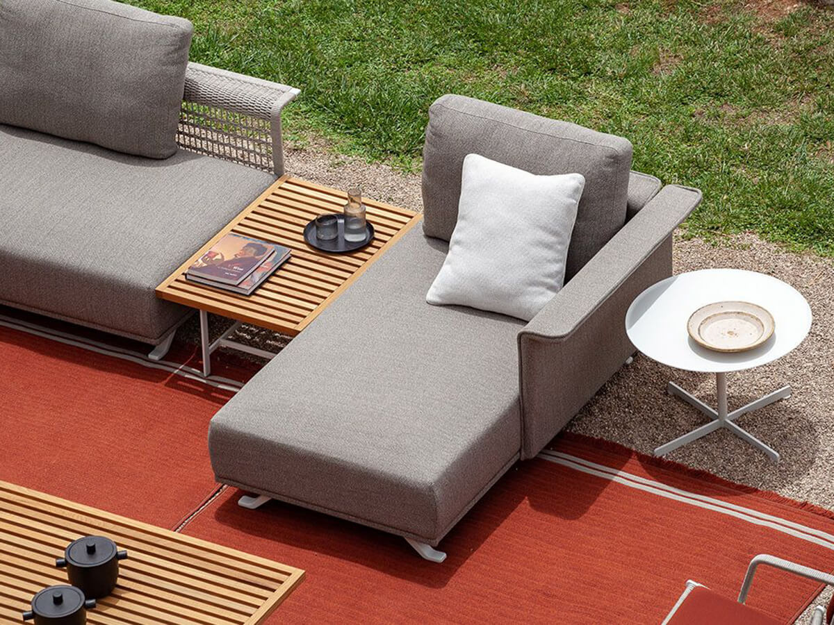 The designers Ludovica and Roberto Palomba designed a seating system for Poltrona Frau from modular exterior in multiple configurations: linear, corner or island thanks to the possibility to insert backrests, armrests, corner and end elements with great fluidity. The steel structure powder-coated stainless steel with a chalk-colored finish is supported by thin feet while armrests and back are covered with an artisanal rope weaving that alternates full and empty spaces with a beautiful aesthetic effect. The padding is covered in soft and refined fabrics suitable for outdoor use and packaged with precautions to facilitate water drainage. The multifaceted Solaria sofa furnishes and defines the spaces of gardens, patios, poolside and terraces with the typical elegance of Italian design.