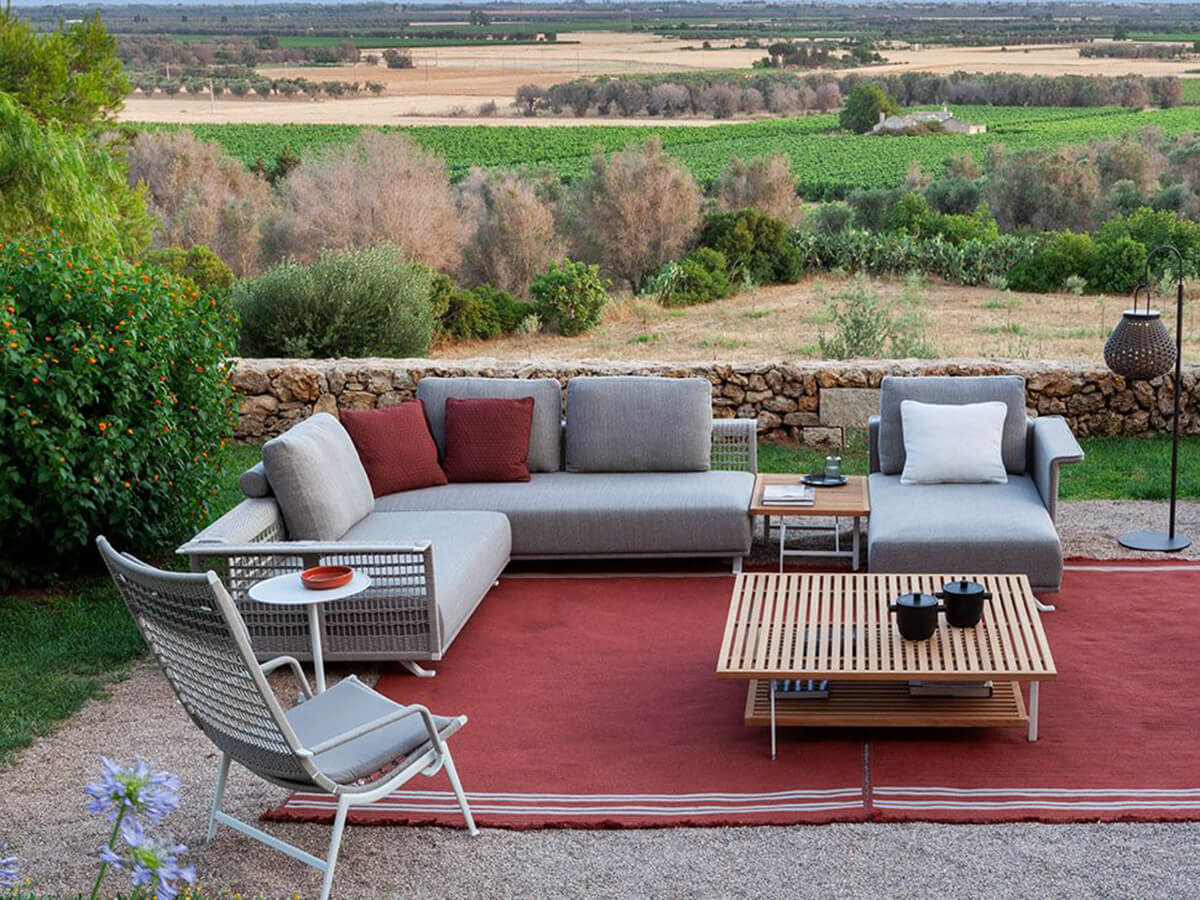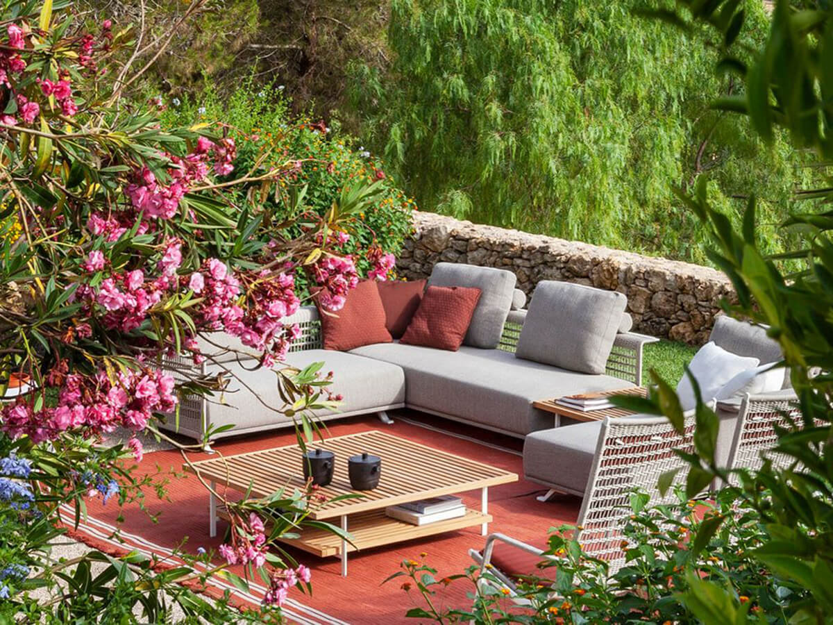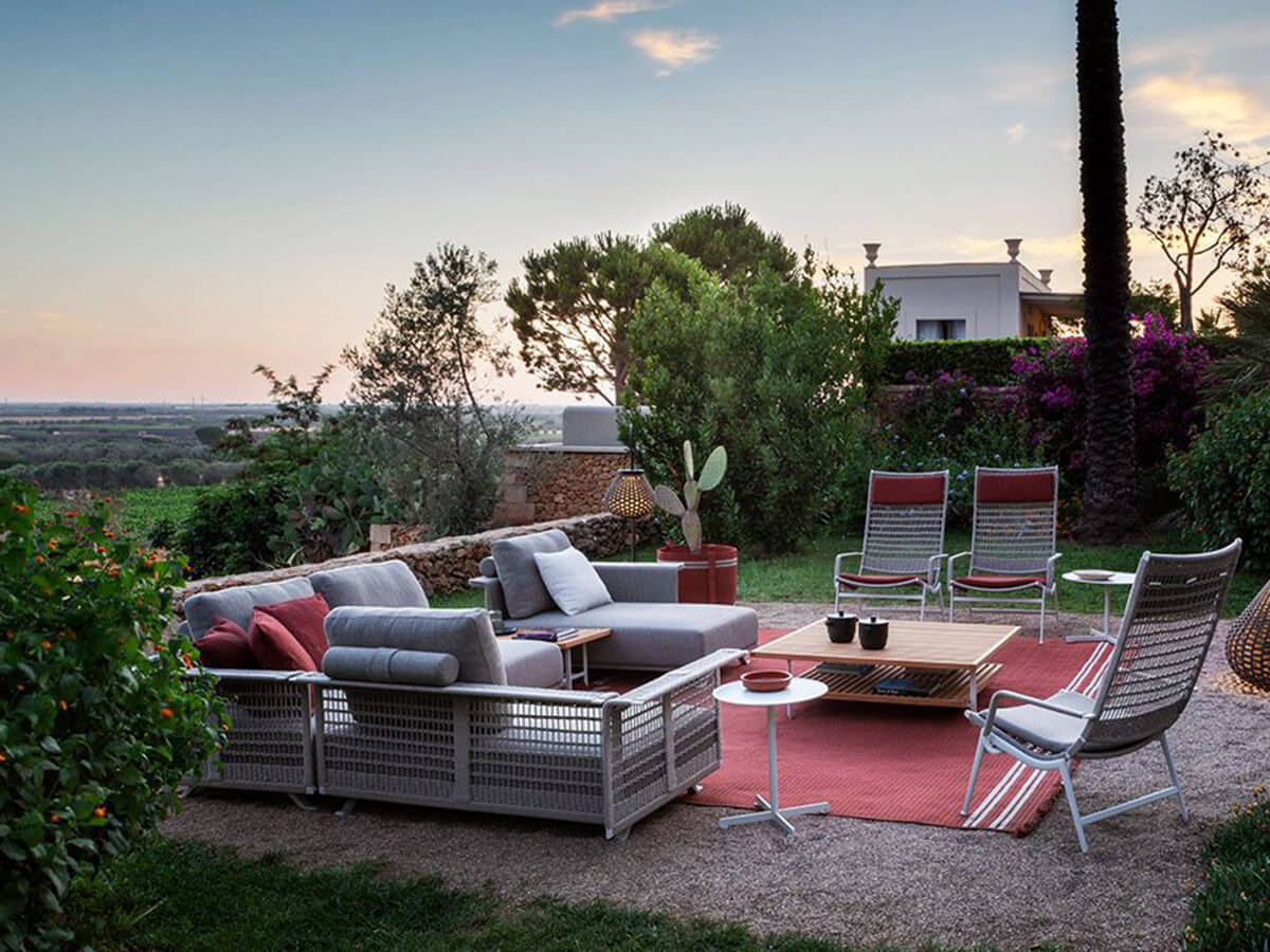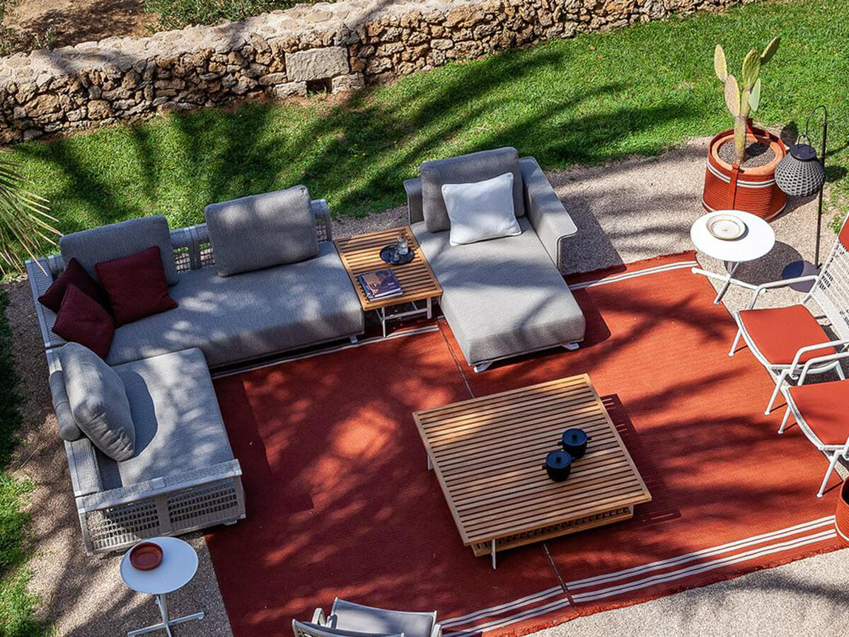 The designers Ludovica and Roberto Palomba designed a seating system for Poltrona Frau from modular exterior in multiple configurations: linear, corner or island thanks to the possibility to insert backrests, armrests, corner and end elements with great fluidity. The steel structure powder-coated stainless steel with a chalk-colored finish is supported by thin feet while armrests and back are covered with an artisanal rope weaving that alternates full and empty spaces with a beautiful aesthetic effect. The padding is covered in soft and refined fabrics suitable for outdoor use and packaged with precautions to facilitate water drainage. The multifaceted Solaria sofa furnishes and defines the spaces of gardens, patios, poolside and terraces with the typical elegance of Italian design.