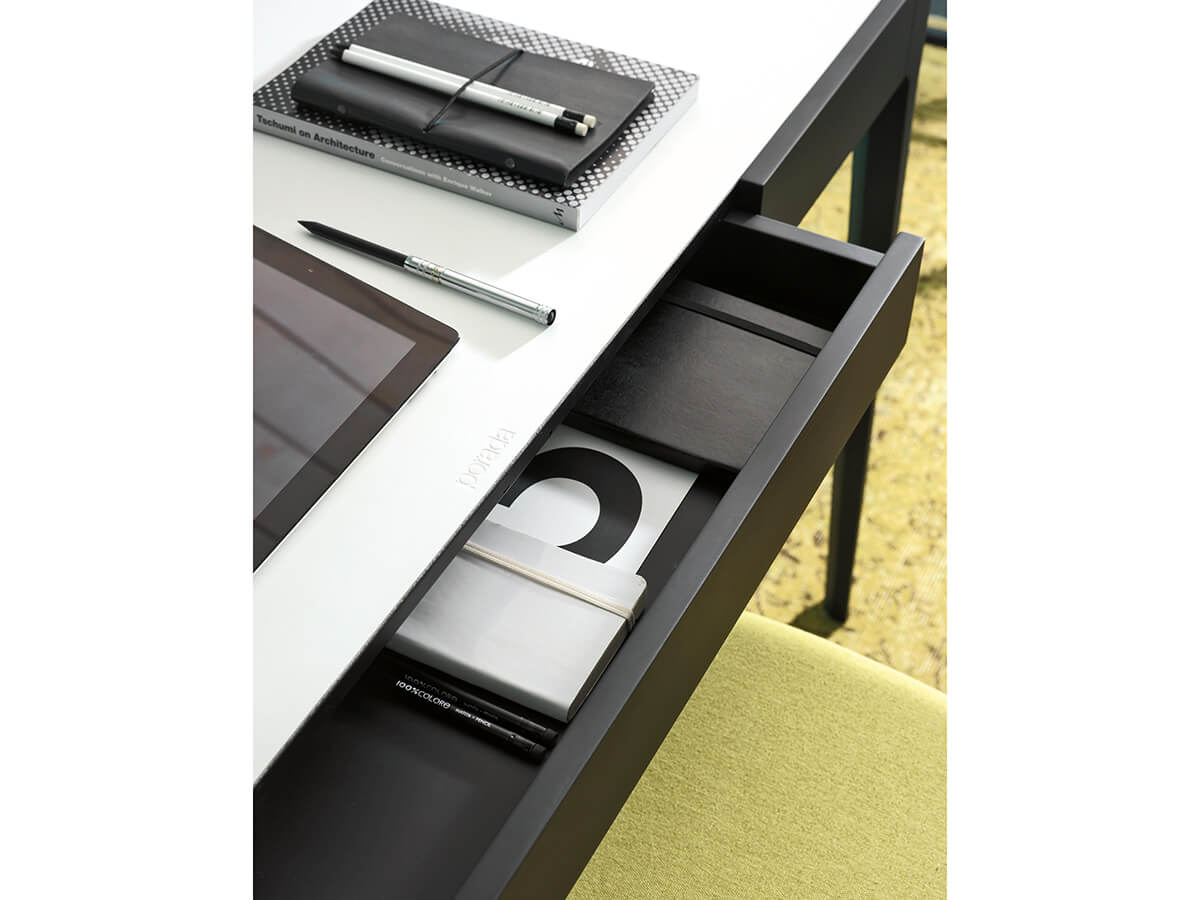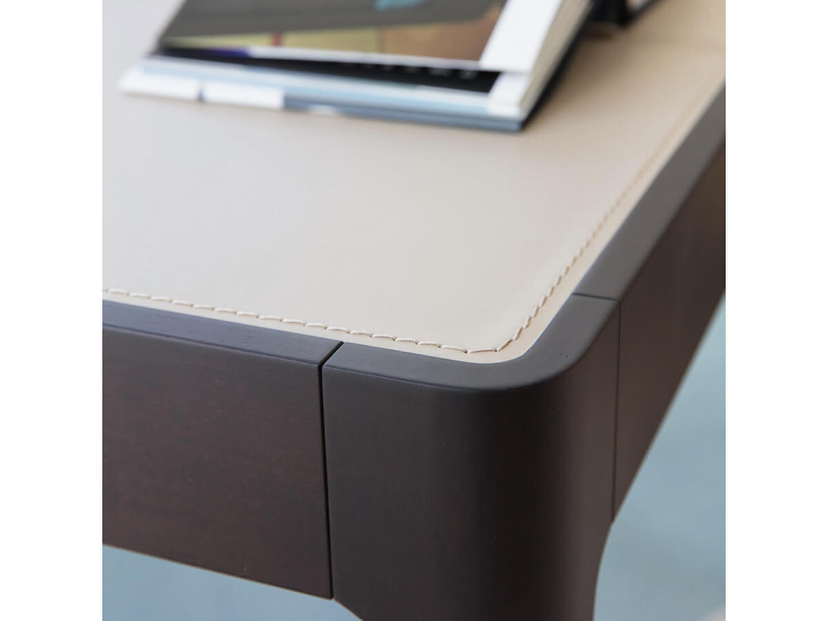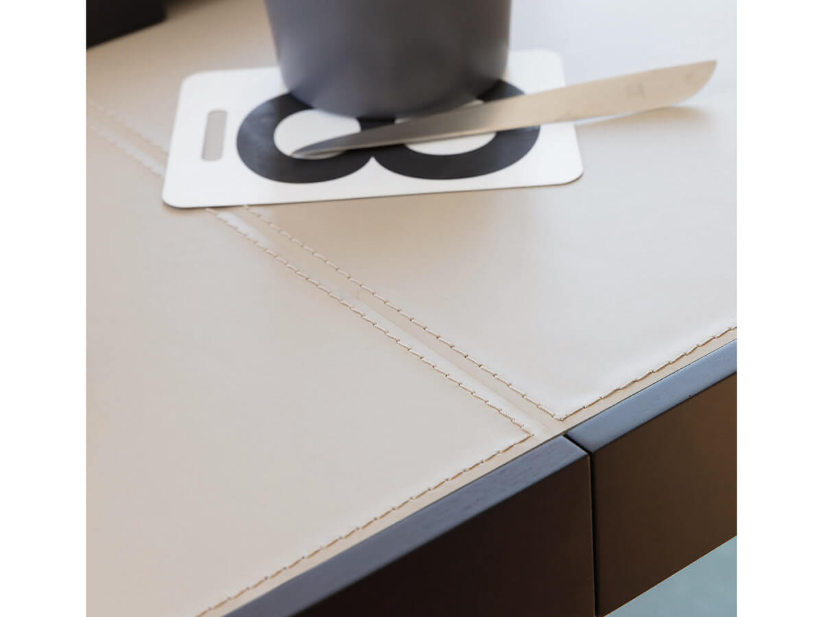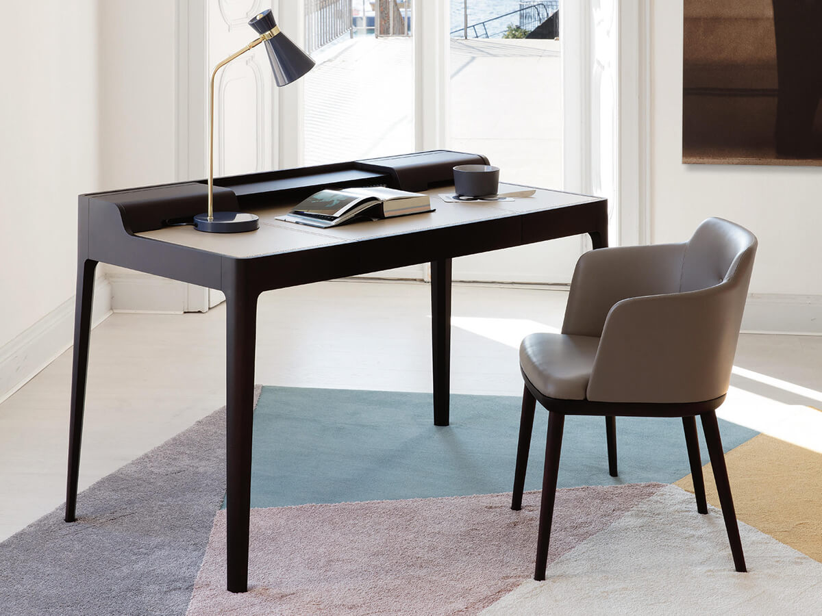 A desk with a strong character, capable of fully fulfilling a double function of elegance and functionality. Saffo was born from the creative studio of C. Ballabio and Porada, united in giving life to an object that is well suited to the needs of the home office but not only. Ideal for studios and formal spaces, it is also suitable for more varied contexts such as living rooms and small spaces where you feel the need for a floor where you can carry out various office, study and more activities. This desk has a drawer in solid canaletta walnut with storage compartments and retractable cable guides. The desk pad is in leather, to improve the aesthetic and functional performance during use