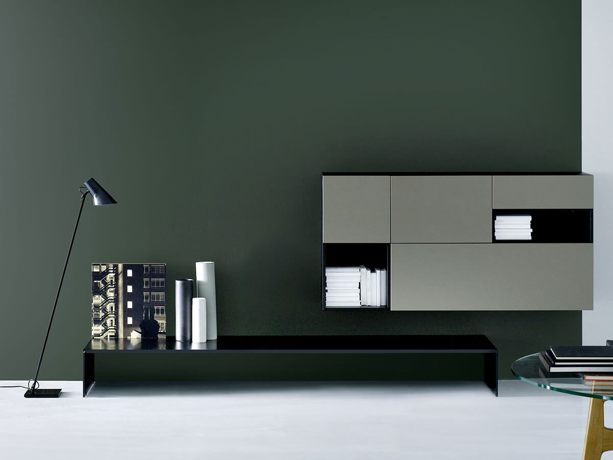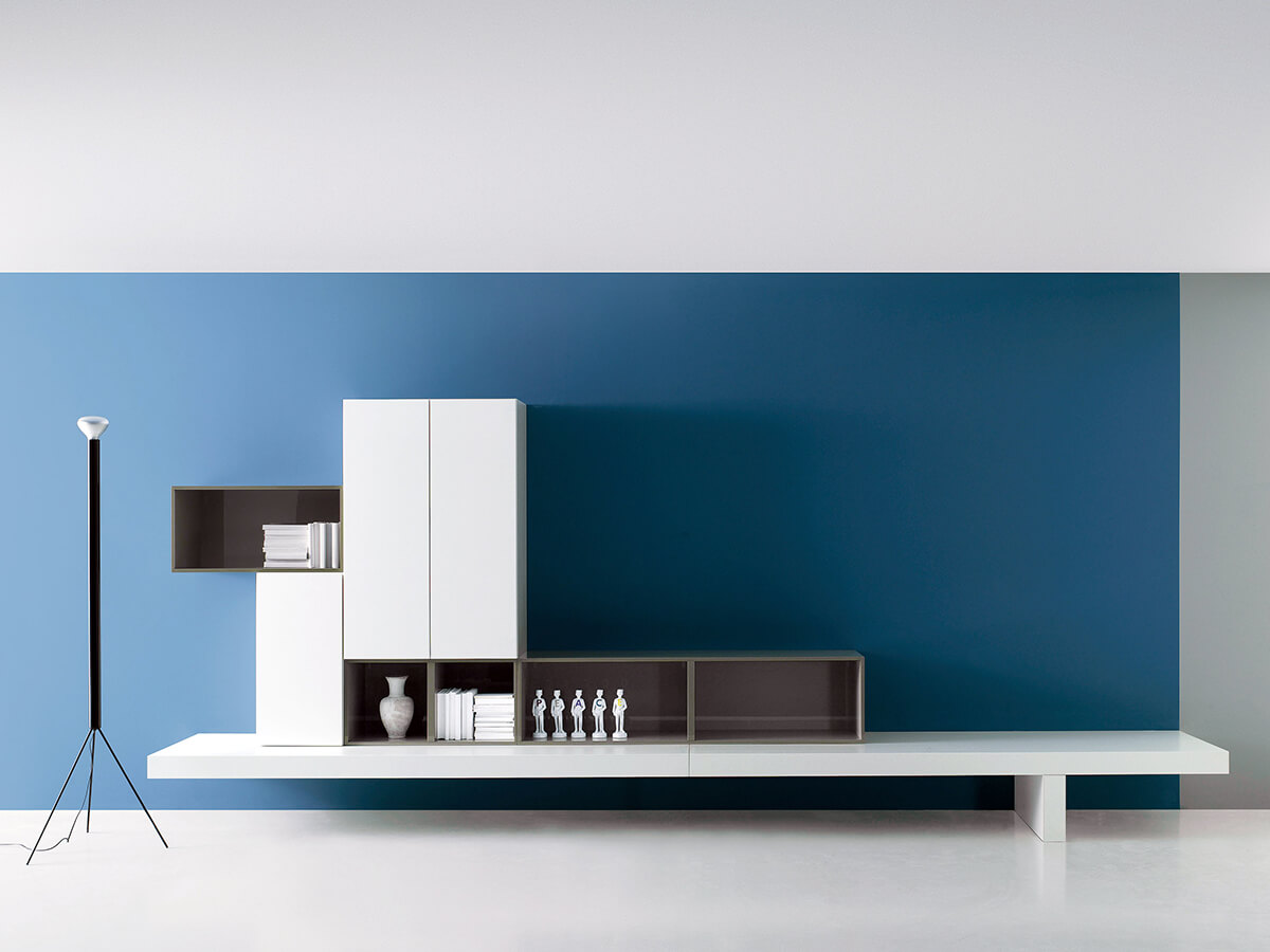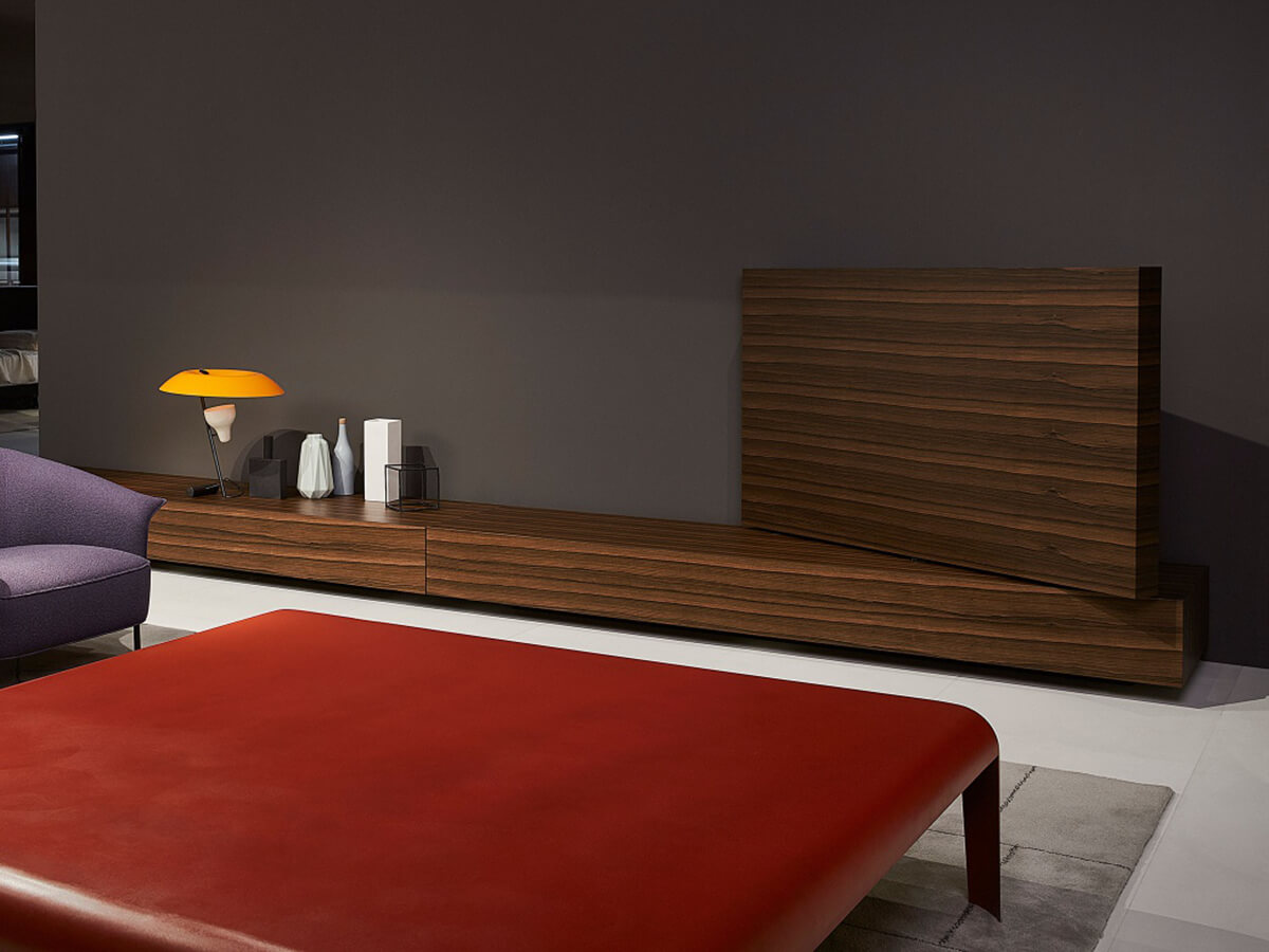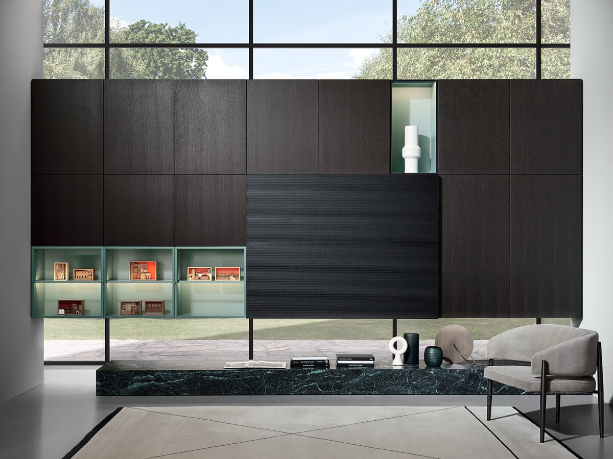 The Modern storage system, designed by Piero Lissoni for Porro, is characterized by its pure and essential shapes that give the spaces a solid geometric rigor. Its great versatility allows it to give life to TV units with a very different look: in fact, a lighter version can be presented, in which the container element is surmounted by a more contained vertical panel that acts as a backdrop for the TV and is anchored. at the base through an innovative 45 ° system, or combine with the shelves and boiserie of the Load-it collection to form larger and more scenographic compositions. Modern can also be reinterpreted in the “dining” version, where it takes the form of cupboards and storage units, and thanks to its clean and aseptic lines it is also perfect for work environments.