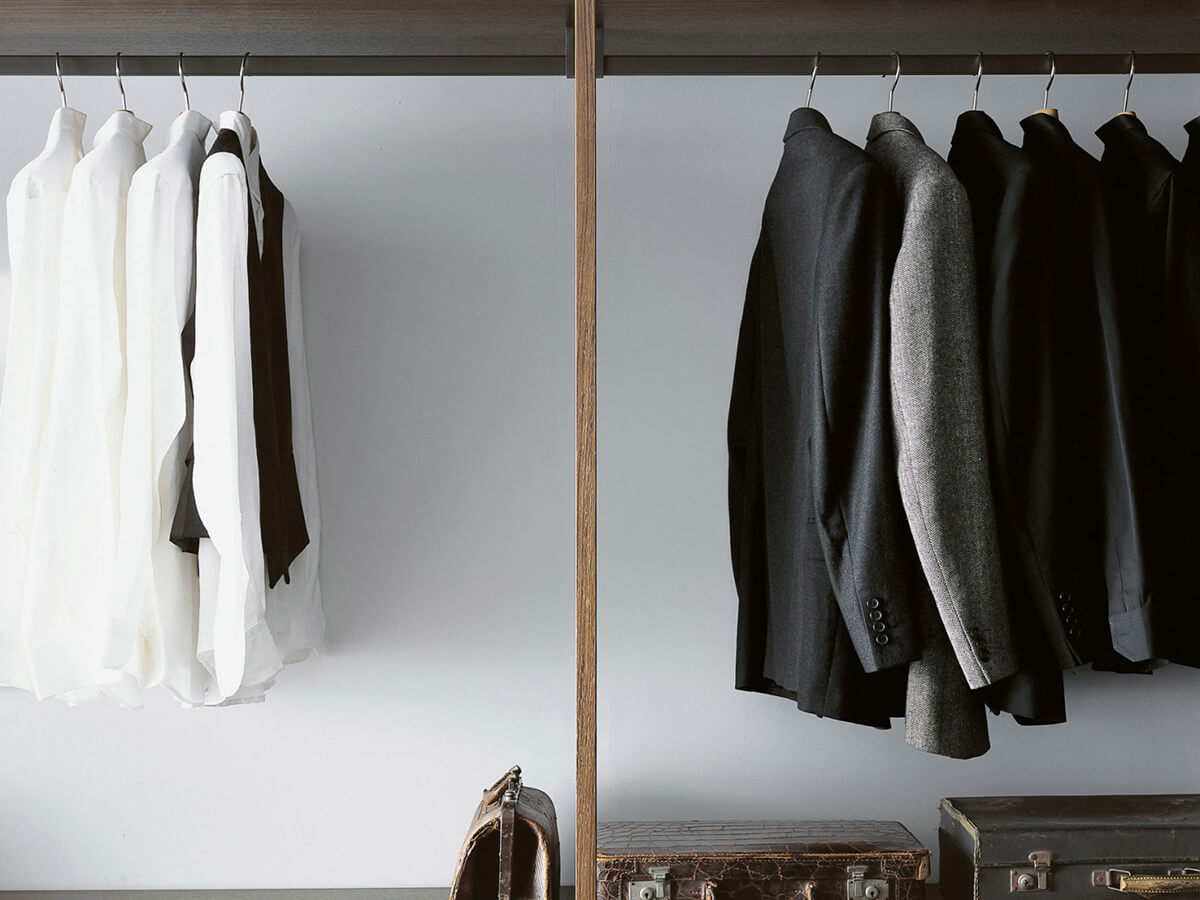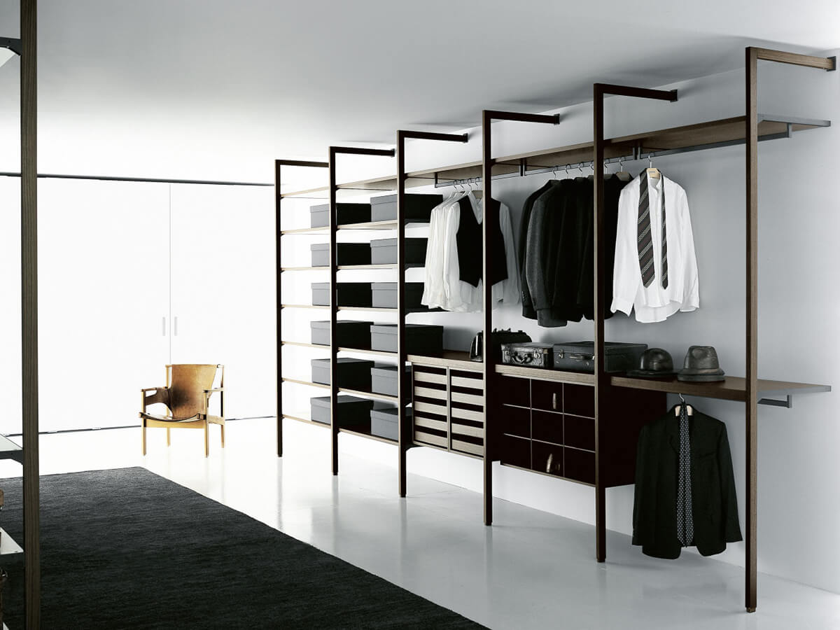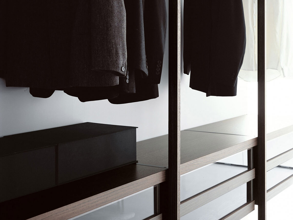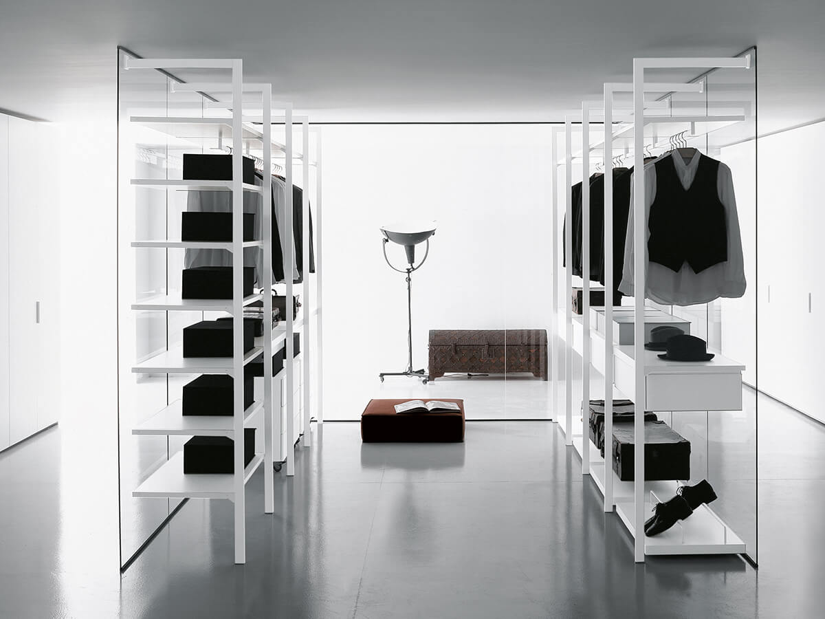 The Storage walk-in closet by Porro is an emblem of airy lightness. Shelves and drawer units seem to float in space, supported only by slender linear uprights that rest the base on the ground and the upper part on the rear wall, with a rigid right angle that sets the tone for the composition. A minimalist cabin with few equals on the market, which prefers to work by subtraction and shuns all majesty. Nonetheless, the few lines that make up the profile are not without their majesty, together with the fluctuating grace.The cabin can be customized with drawers, sweater holders, trouser racks and various other equipment.