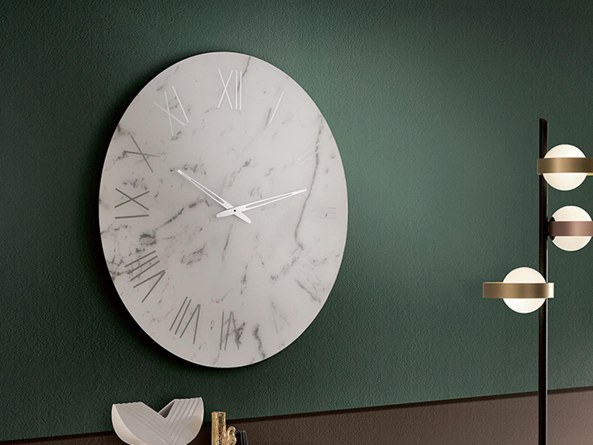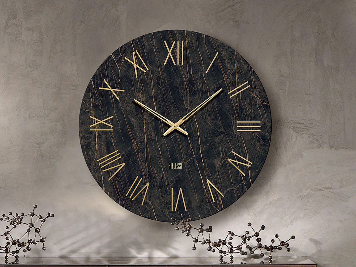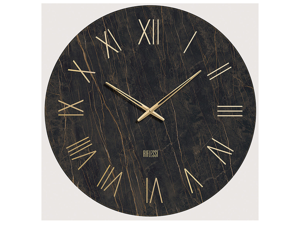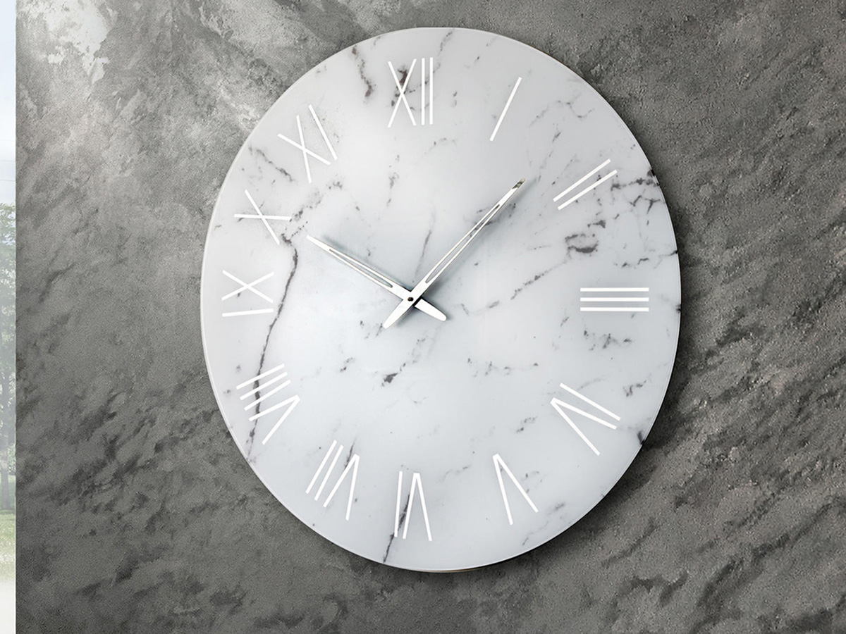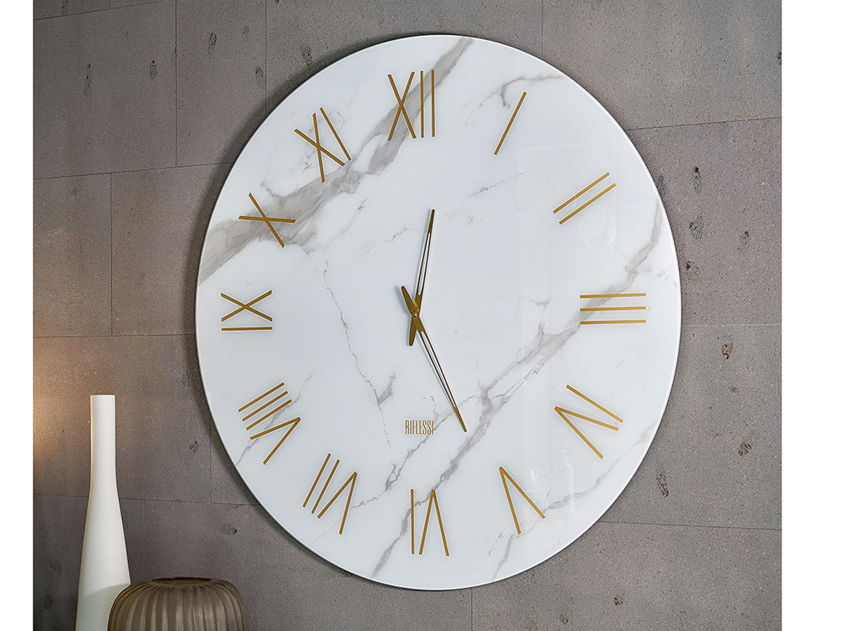 A monumental and material wall clock, capable of living in several eras while retaining a unique flavor, strong in ancestry and at the same time modernity for all those who love to surround themselves with precious things and with a unique taste. Portofino is made of marble-effect screen-printed crystal in the Calacatta gold and glossy Noir Desir or matt Statuario white finishes, embellished with gold writing and different finishes. It features warm LED lighting, optional, if you decide to install it. An object suitable for any environment and in particular capable of expressing itself in places with a highly sophisticated trait, where the search for beauty plays a fundamental component.
