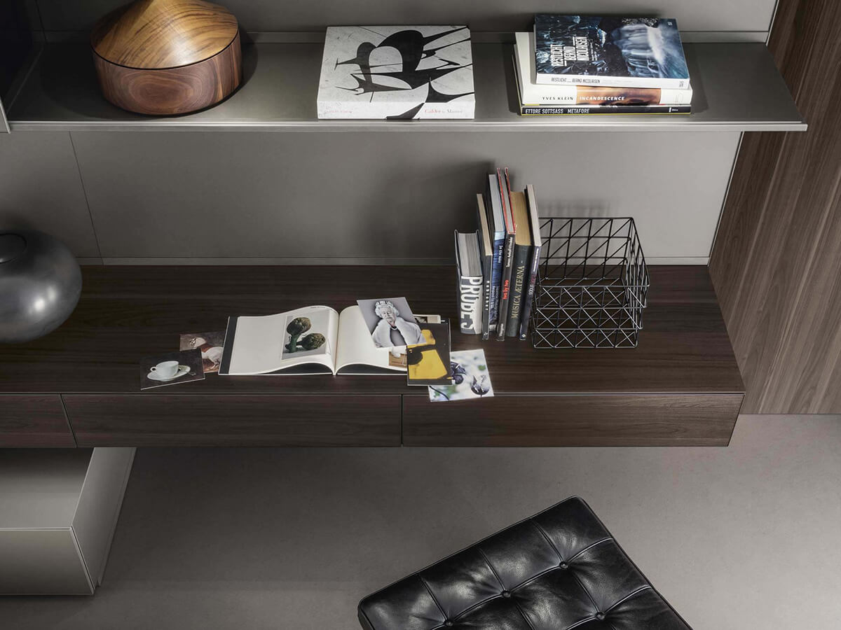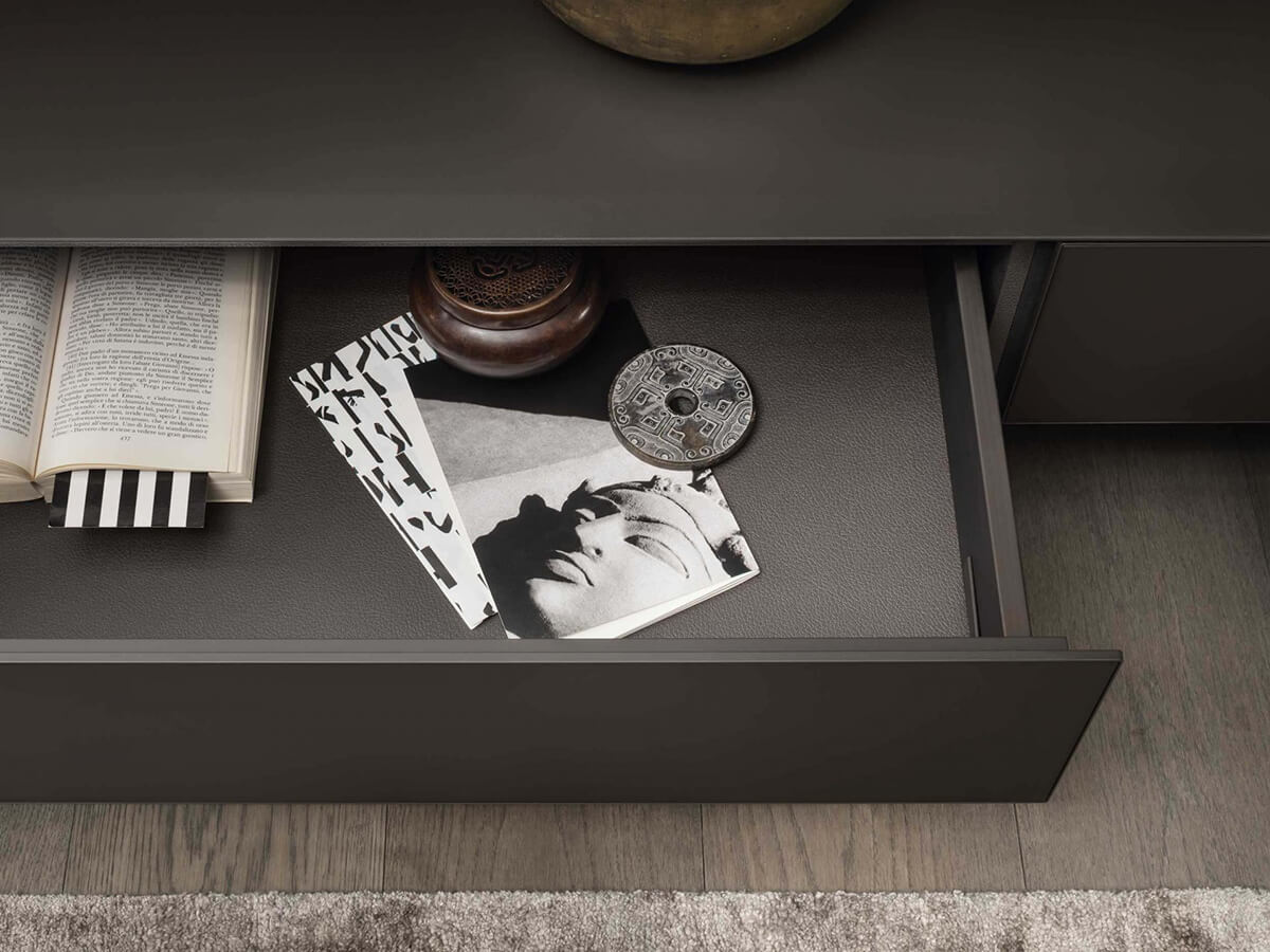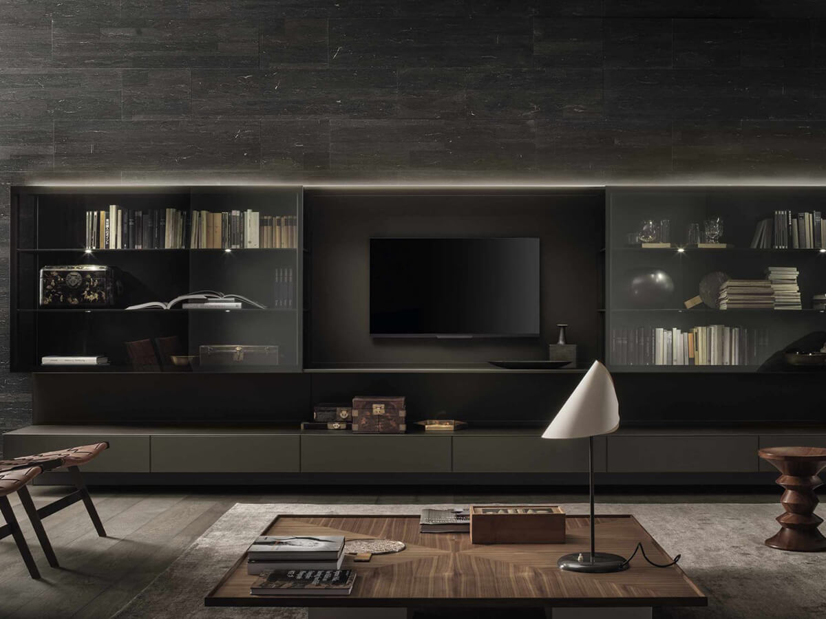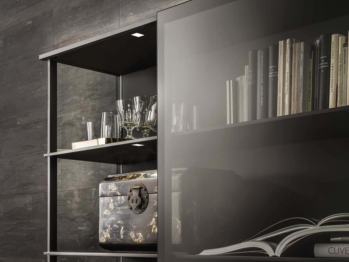The Abacus Living TV unit by Rimadesio bases its architecture on a scenographic lacquered glass boiserie to which thin shelves, practical glass containers and display cabinets with flap doors are attached. The boiserie thus becomes the absolute protagonist of the environment, emphasizing the materiality of the glass with its reflections and its play of light, as well as hosting LED systems on the upper and lower walls that contribute to the lighting of the environment. Cold and precious, Abacus Living is the queen of the living room, capable of giving life to futuristic but refined environments.