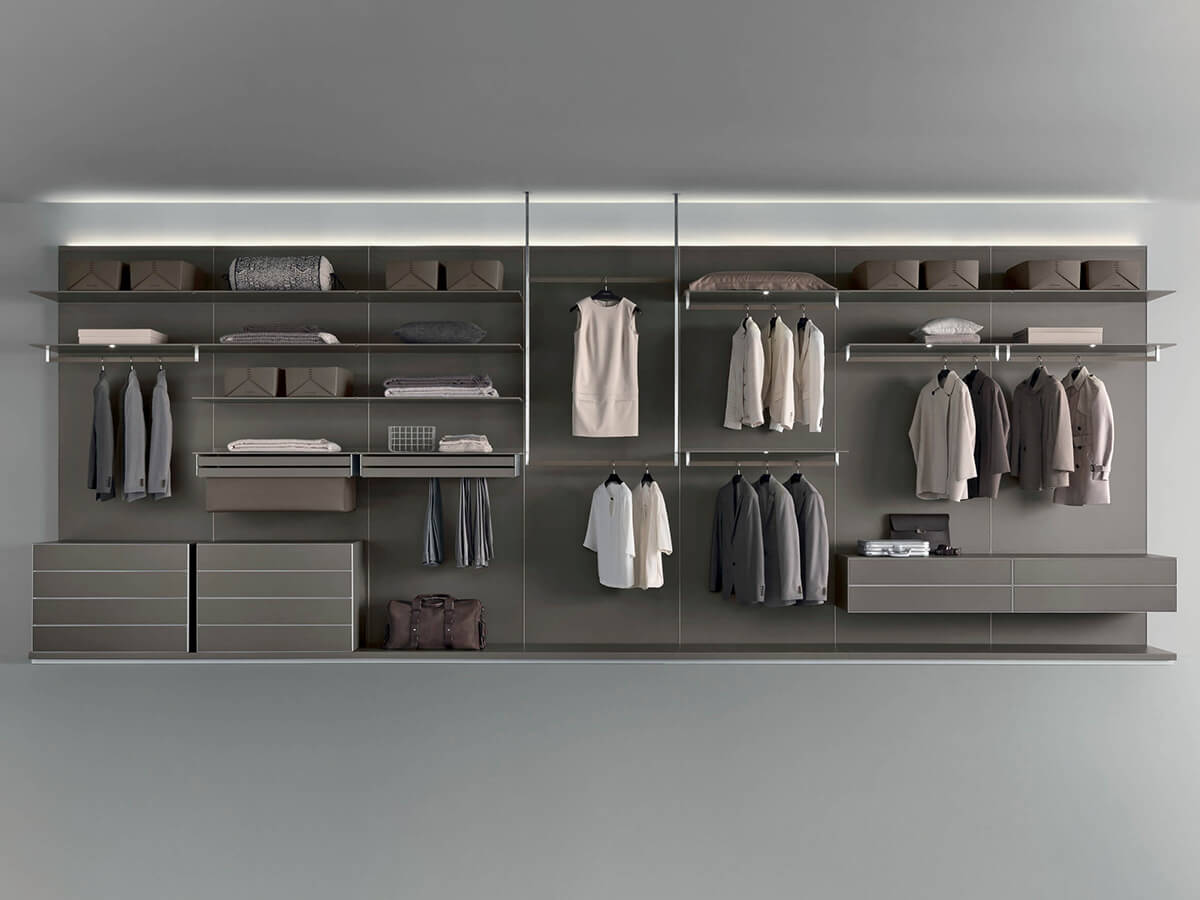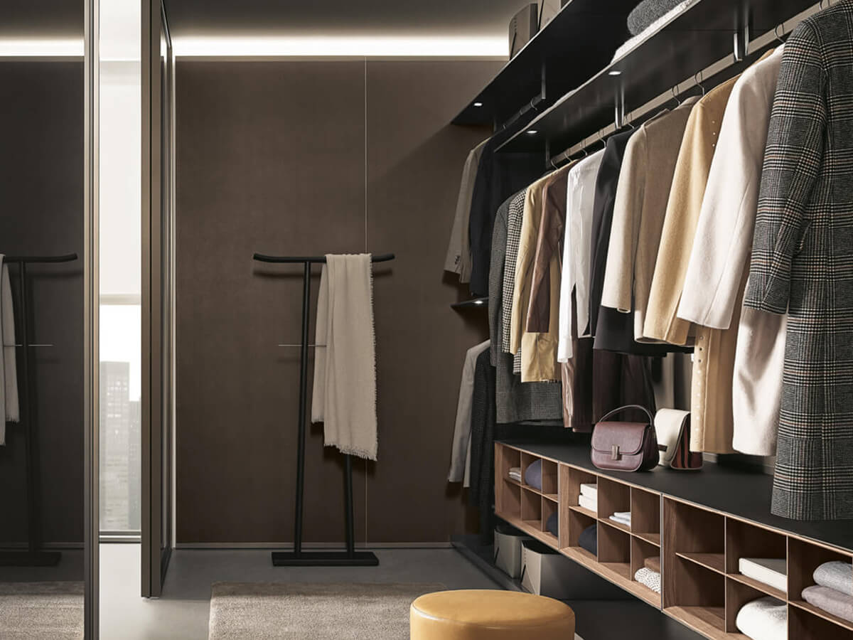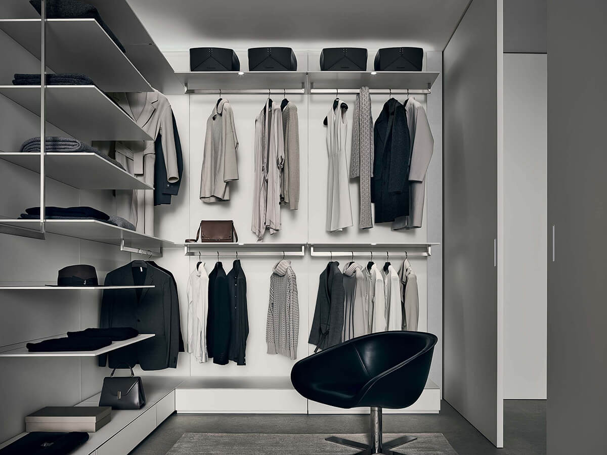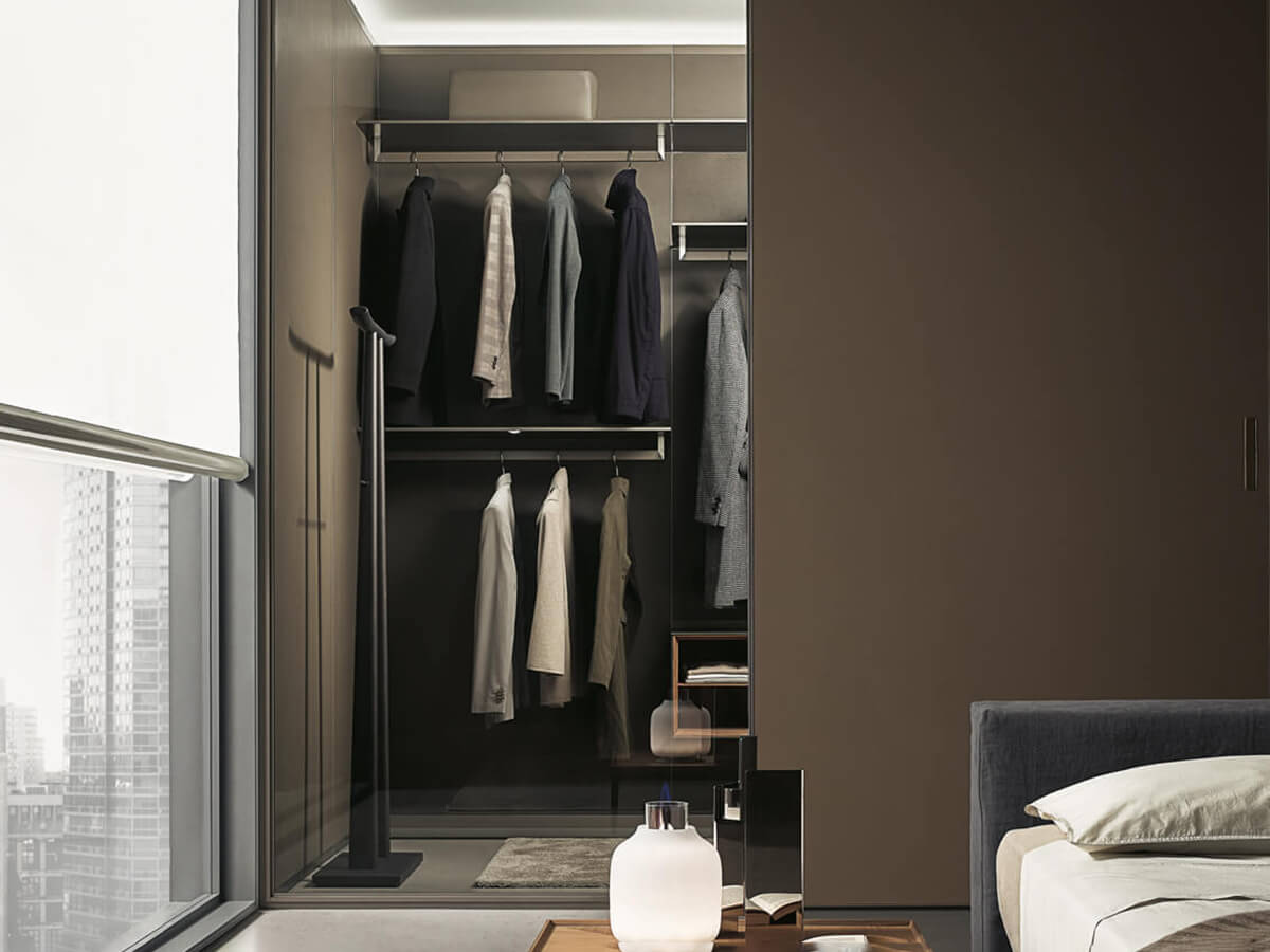 The Abacus walk-in closet by Rimadesio, signed by designer Giuseppe Bavuso, allows a minimalist and technologically advanced interpretation of the sleeping area. With Abacus, the walk-in closet becomes a room in lacquered glass, leatherette or fabric, onto which the thin horizontal elements that make up the equipment are grafted. Framed by essential lines, Abacus creates rigorous and orderly environments, in the name of the purity of the geometries. Shelves, clothes hanger tubes, trouser racks, shoe racks and drawer units are hooked directly to the boiserie without the need for bulky uprights and almost seem to float in space.
