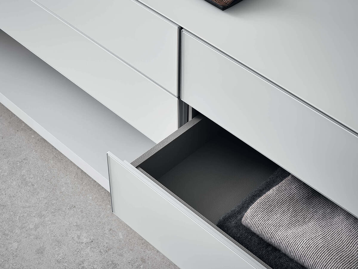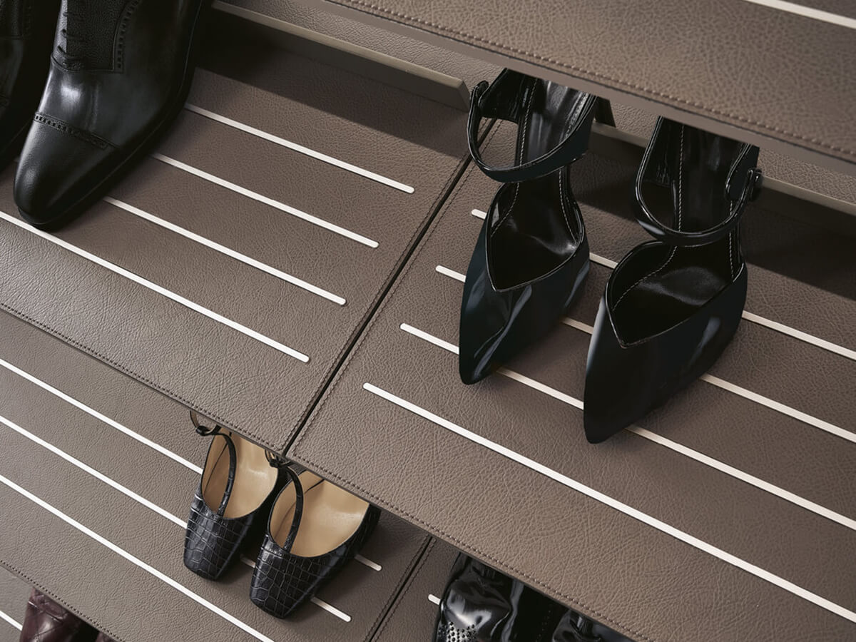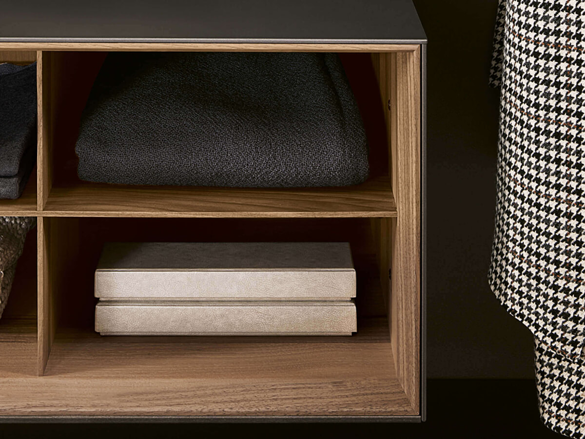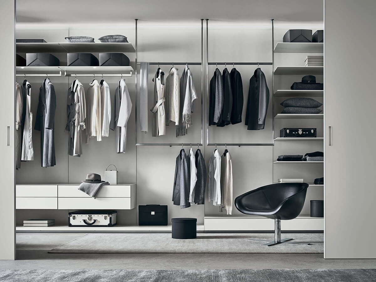 The Abacus walk-in closet by Rimadesio, signed by designer Giuseppe Bavuso, allows a minimalist and technologically advanced interpretation of the sleeping area. With Abacus, the walk-in closet becomes a room in lacquered glass, leatherette or fabric, onto which the thin horizontal elements that make up the equipment are grafted. Framed by essential lines, Abacus creates rigorous and orderly environments, in the name of the purity of the geometries. Shelves, clothes hanger tubes, trouser racks, shoe racks and drawer units are hooked directly to the boiserie without the need for bulky uprights and almost seem to float in space.